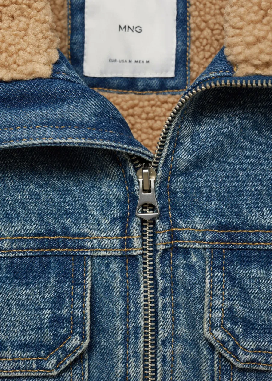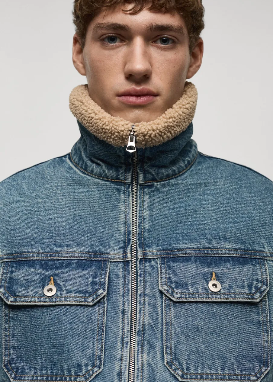 100% bomull. Zapięcie na suwak. Zapinane mankiety. Model dżinsowy. Spranie na jasno z wytarciem. Wstawki z baranka. Dwie naszywane kieszenie z patkami na guzik z przodu. Podszewka z baranka. Model ma 185 cm wzrostu i nosi rozmiar M.