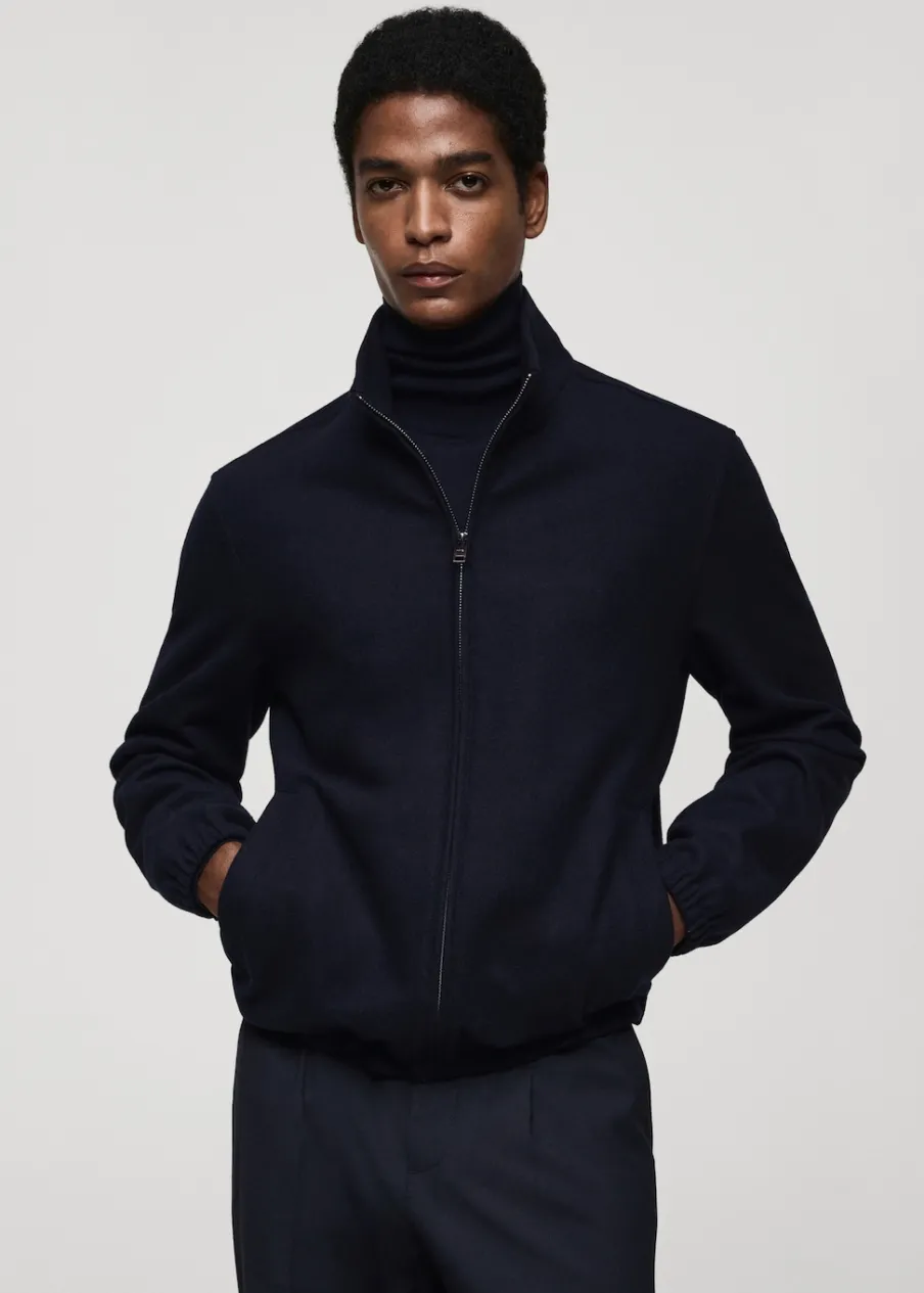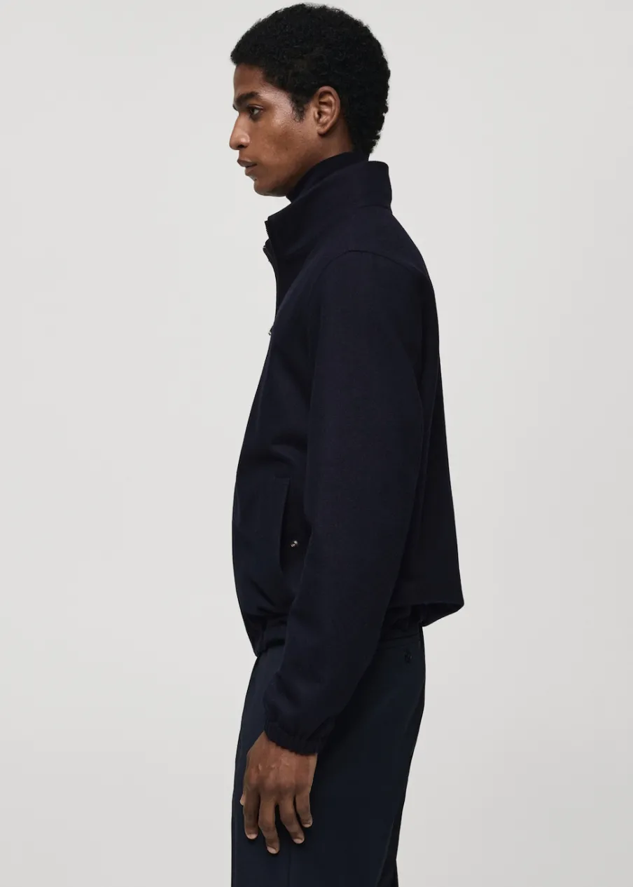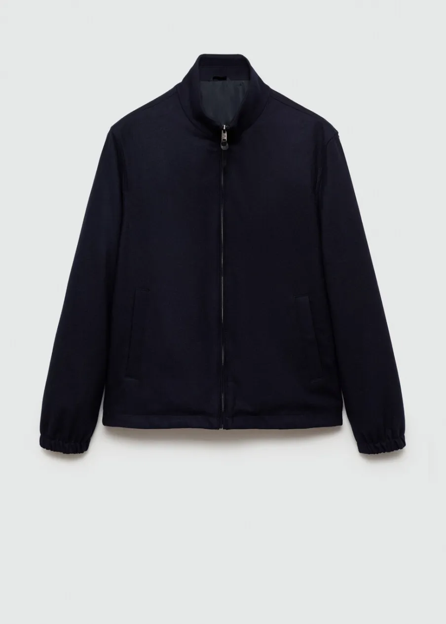 ESSENTIALS: Made to last. Wełniana tkanina. Kominowy kołnierz. Zapięcie na zamek z przodu. Dwie kieszenie po bokach z zapięciem na zatrzask. Dół nogawek regulowany. Wewnętrzna podszewka. Model ma 187 cm wzrostu i nosi rozmiar M. Długi rękaw z elastycznymi marszczonymi mankietami.