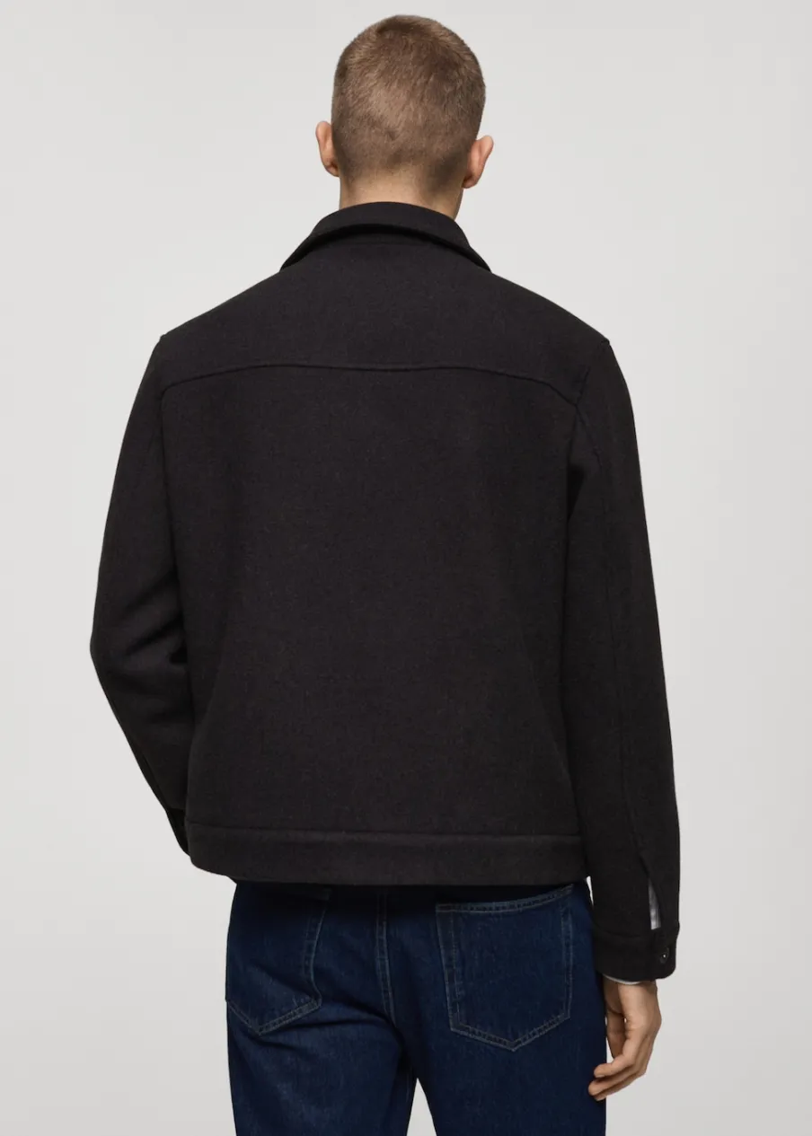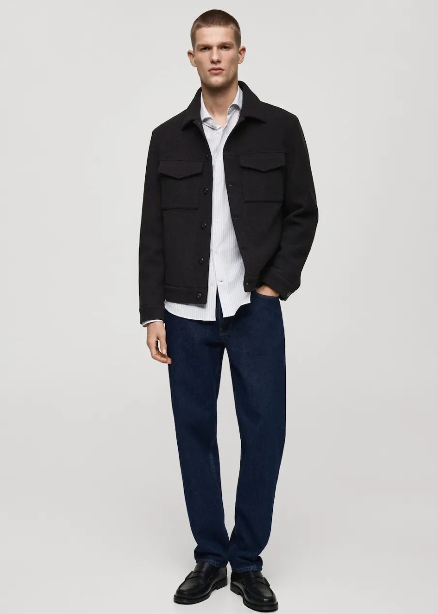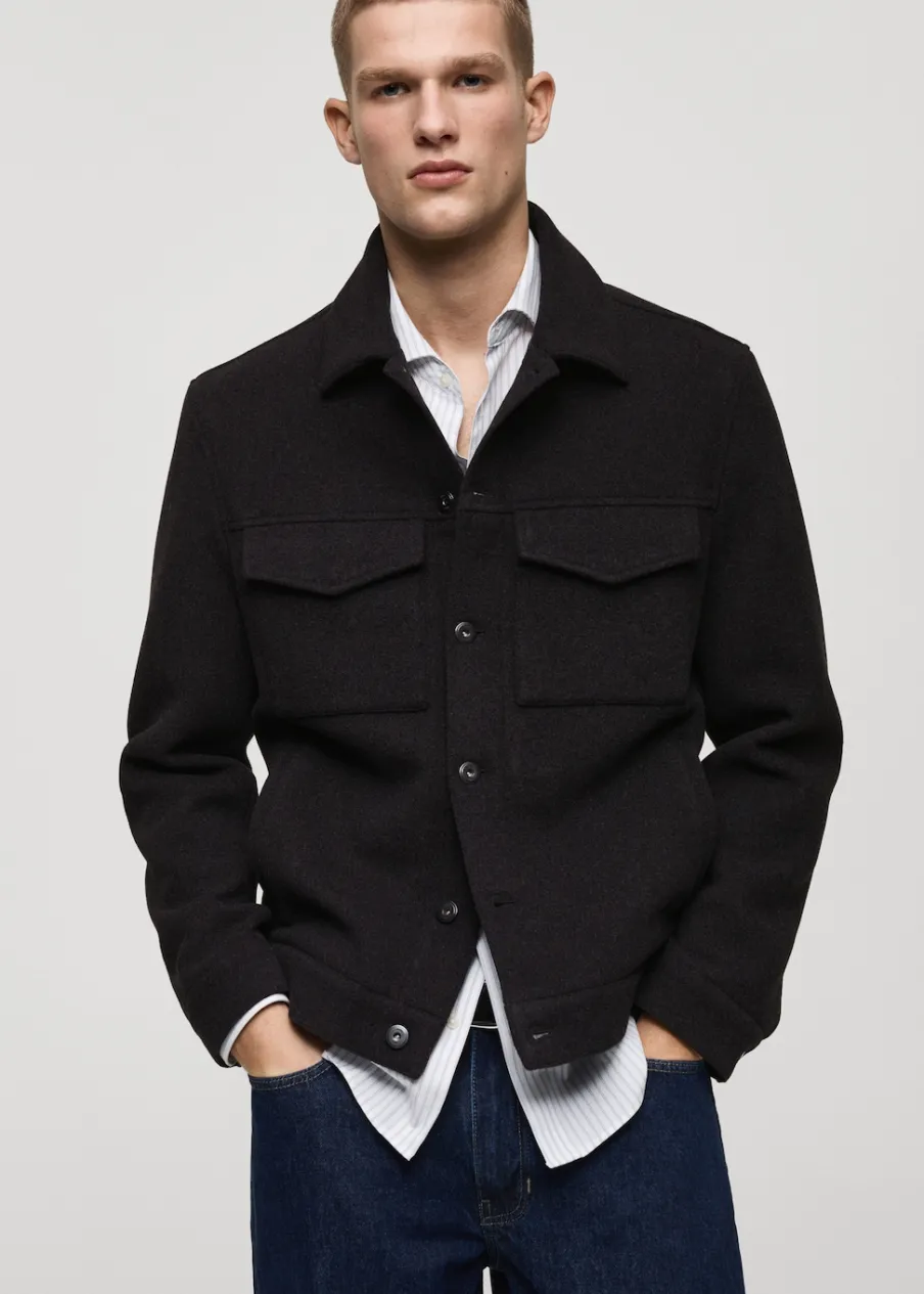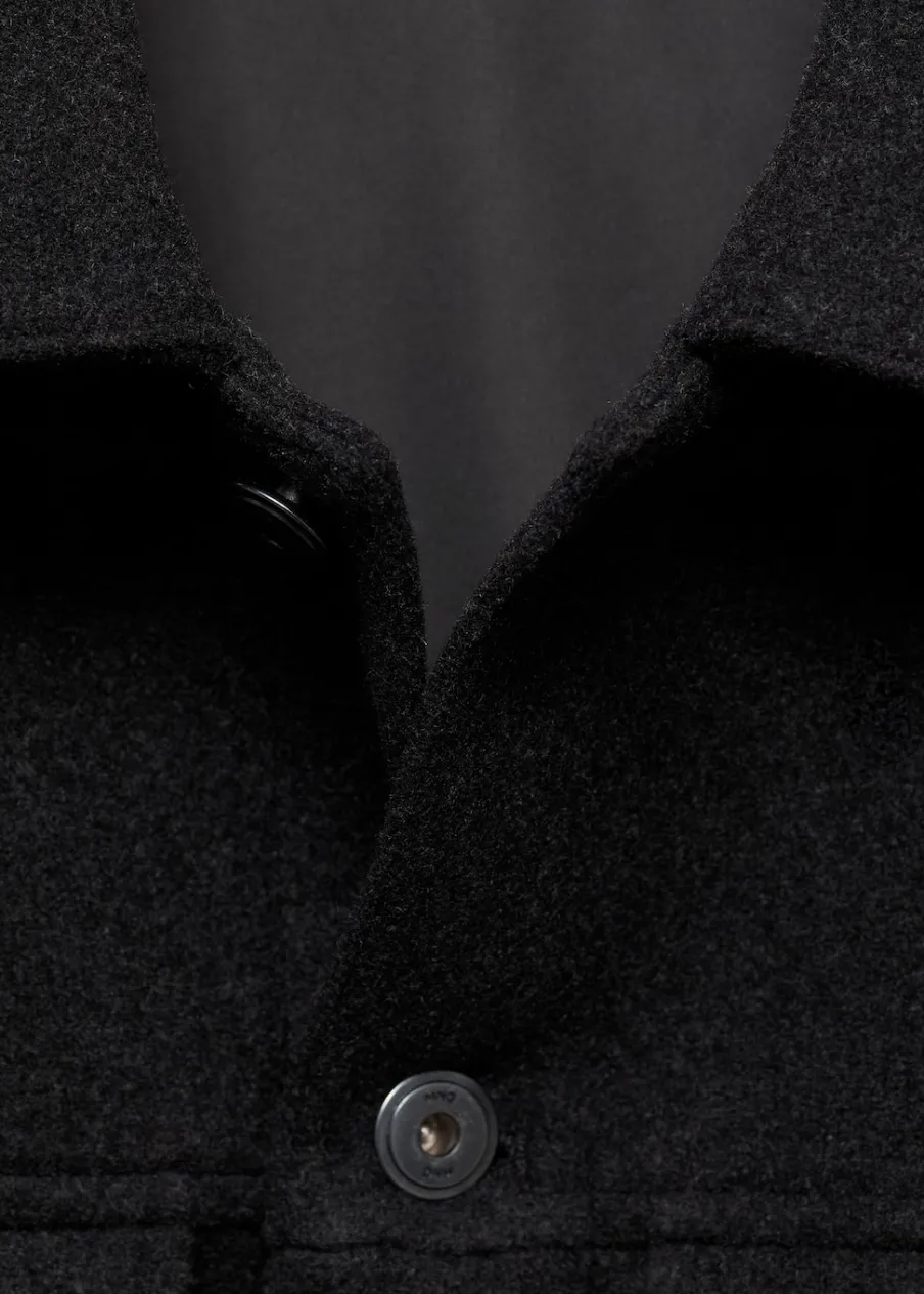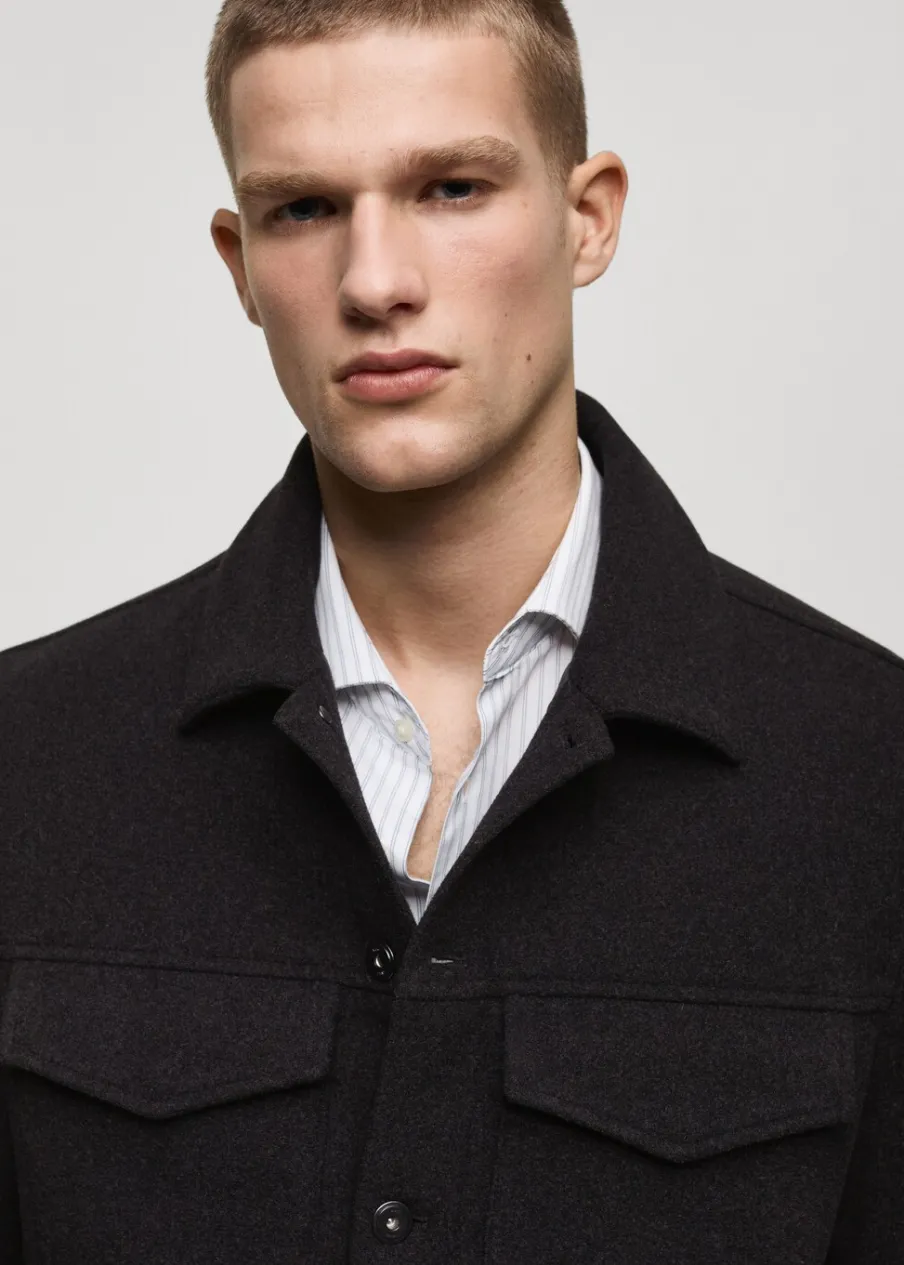 Tkanina mieszanka wełny. Krój regular. Koszulowy kołnierz. Zapięcie na metalowe guziki z przodu. Długi rękaw z guzikami na mankietach. Prosty dół. Wewnętrzna podszewka. Wewnętrzna kieszeń. Model ma 190 cm wzrostu i nosi rozmiar M.