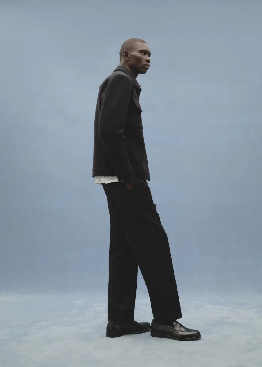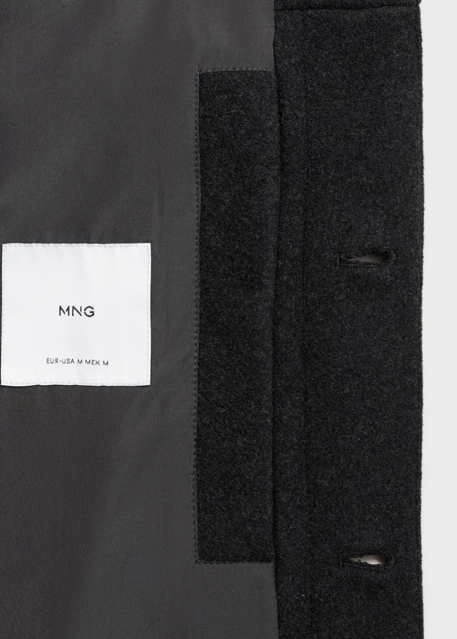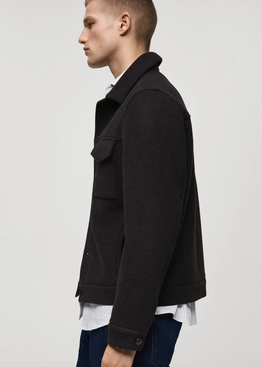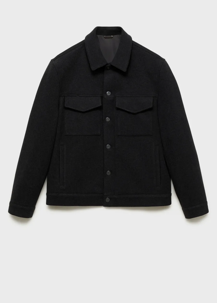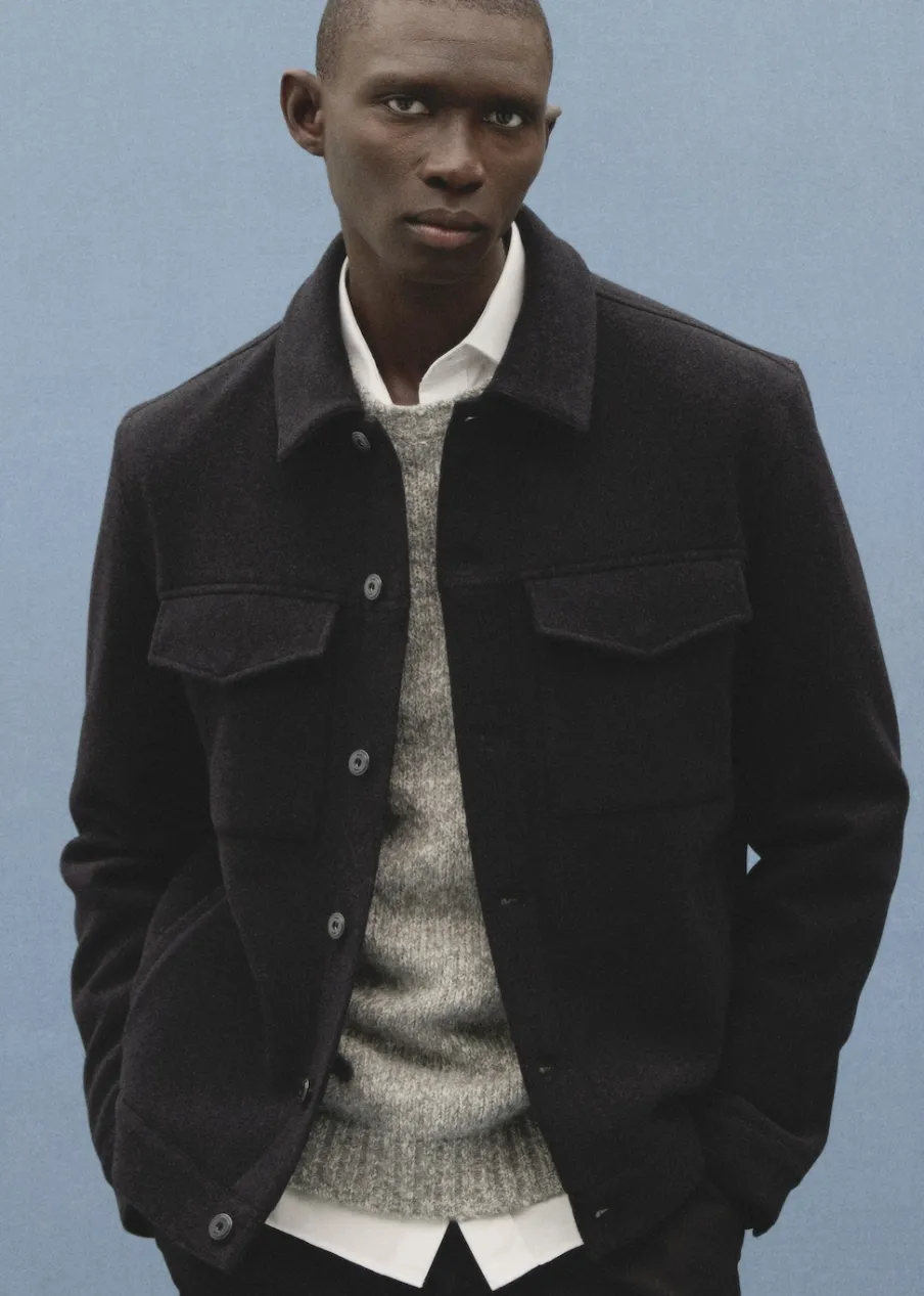 Tkanina mieszanka wełny. Krój regular. Koszulowy kołnierz. Zapięcie na metalowe guziki z przodu. Długi rękaw z guzikami na mankietach. Prosty dół. Wewnętrzna podszewka. Wewnętrzna kieszeń. Model ma 190 cm wzrostu i nosi rozmiar M.