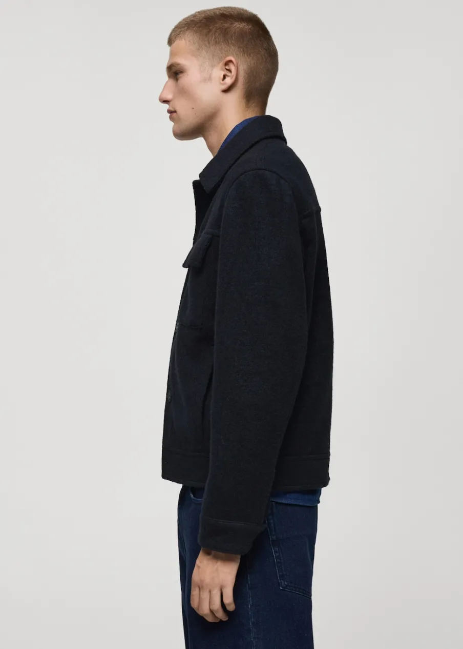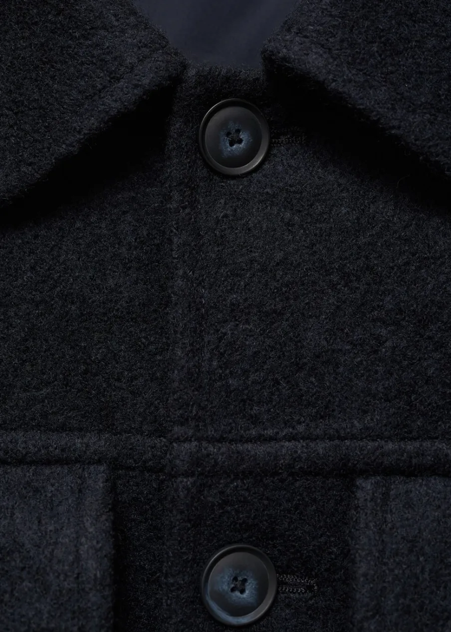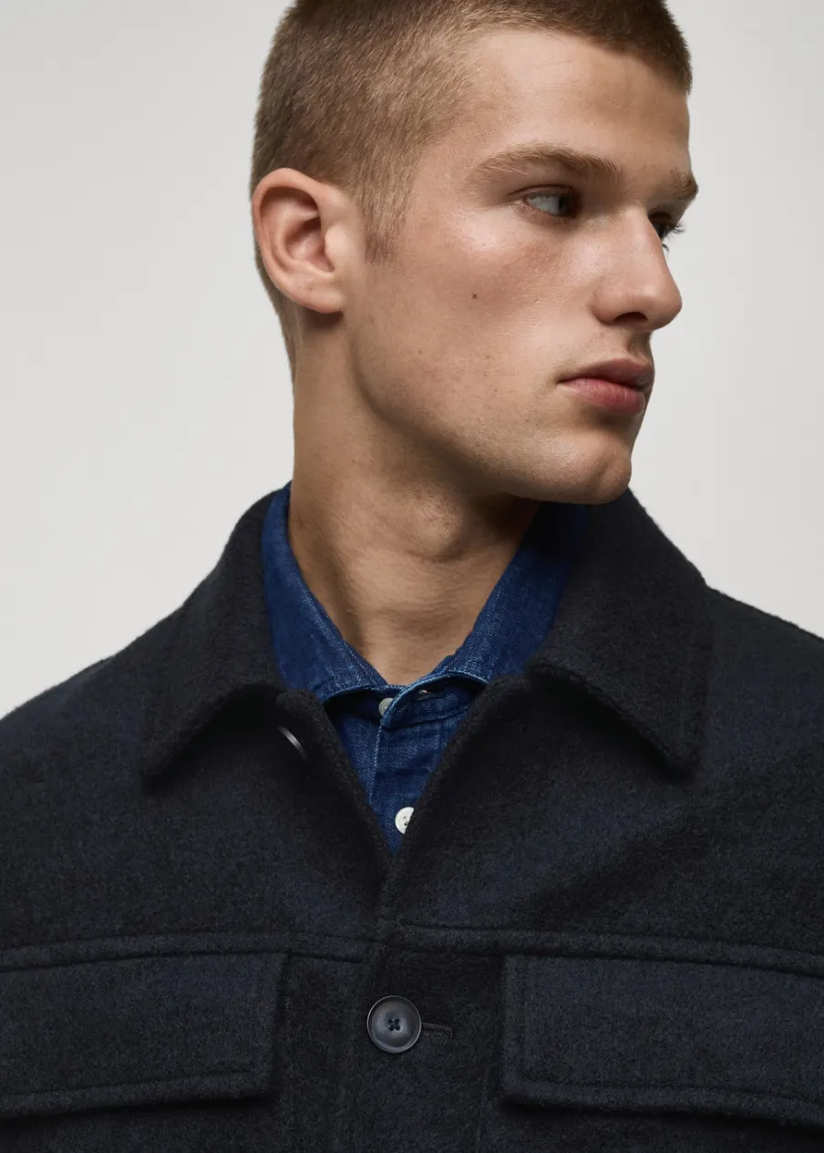 Tkanina mieszana z recyklowanej wełny. Krój regular. Dwie naszywane kieszenie z patką na piersi. Dwie kieszenie z wypustkami z przodu. Prosty dół. Długi rękaw z guzikami na mankietach. Wewnętrzna podszewka. Model ma 190 cm wzrostu i nosi rozmiar M. Zapięcie na guziki z przodu. Klasyczny kołnierzyk.