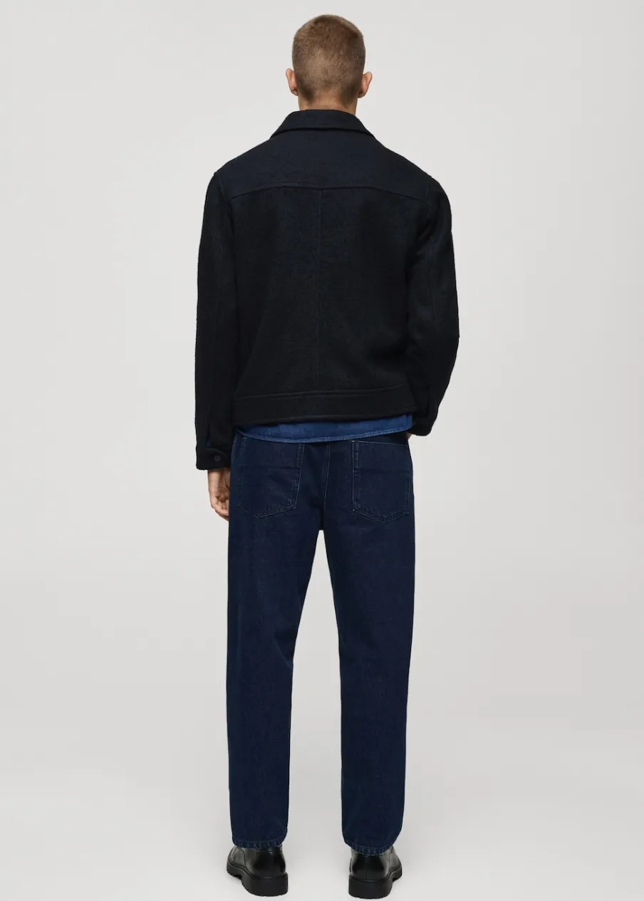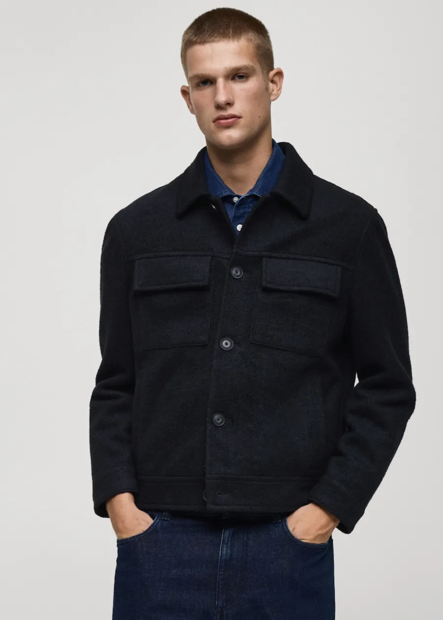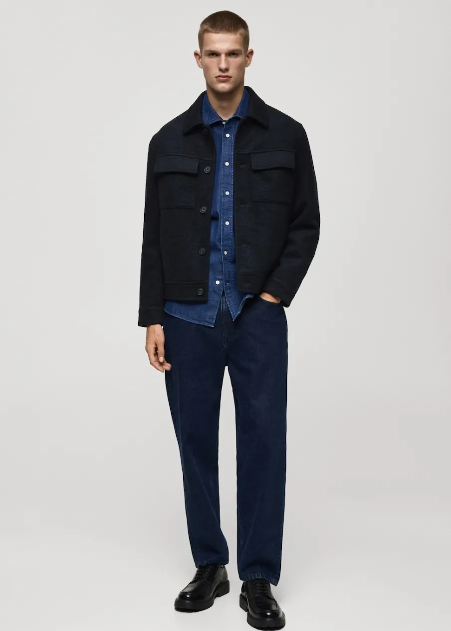 Tkanina mieszana z recyklowanej wełny. Krój regular. Dwie naszywane kieszenie z patką na piersi. Dwie kieszenie z wypustkami z przodu. Prosty dół. Długi rękaw z guzikami na mankietach. Wewnętrzna podszewka. Model ma 190 cm wzrostu i nosi rozmiar M. Zapięcie na guziki z przodu. Klasyczny kołnierzyk.