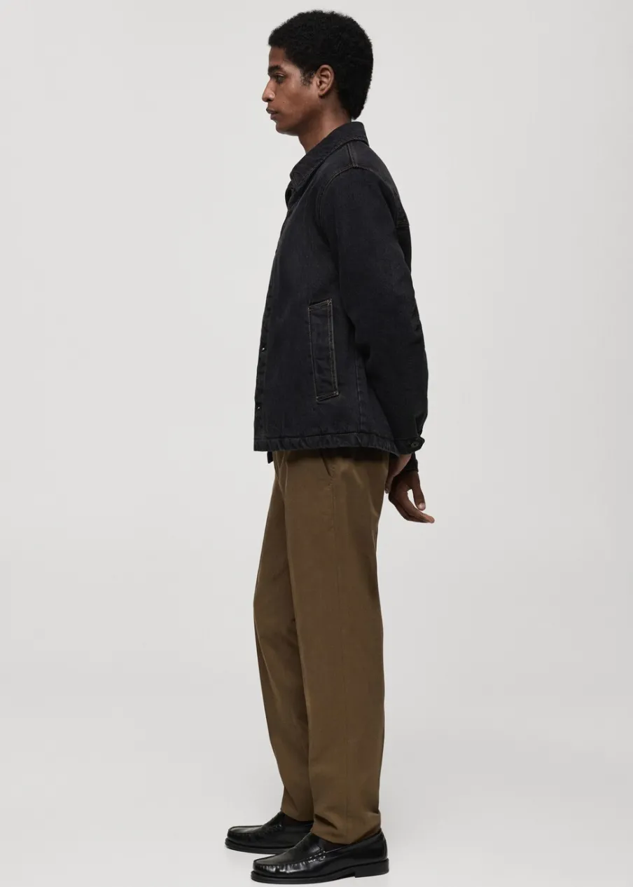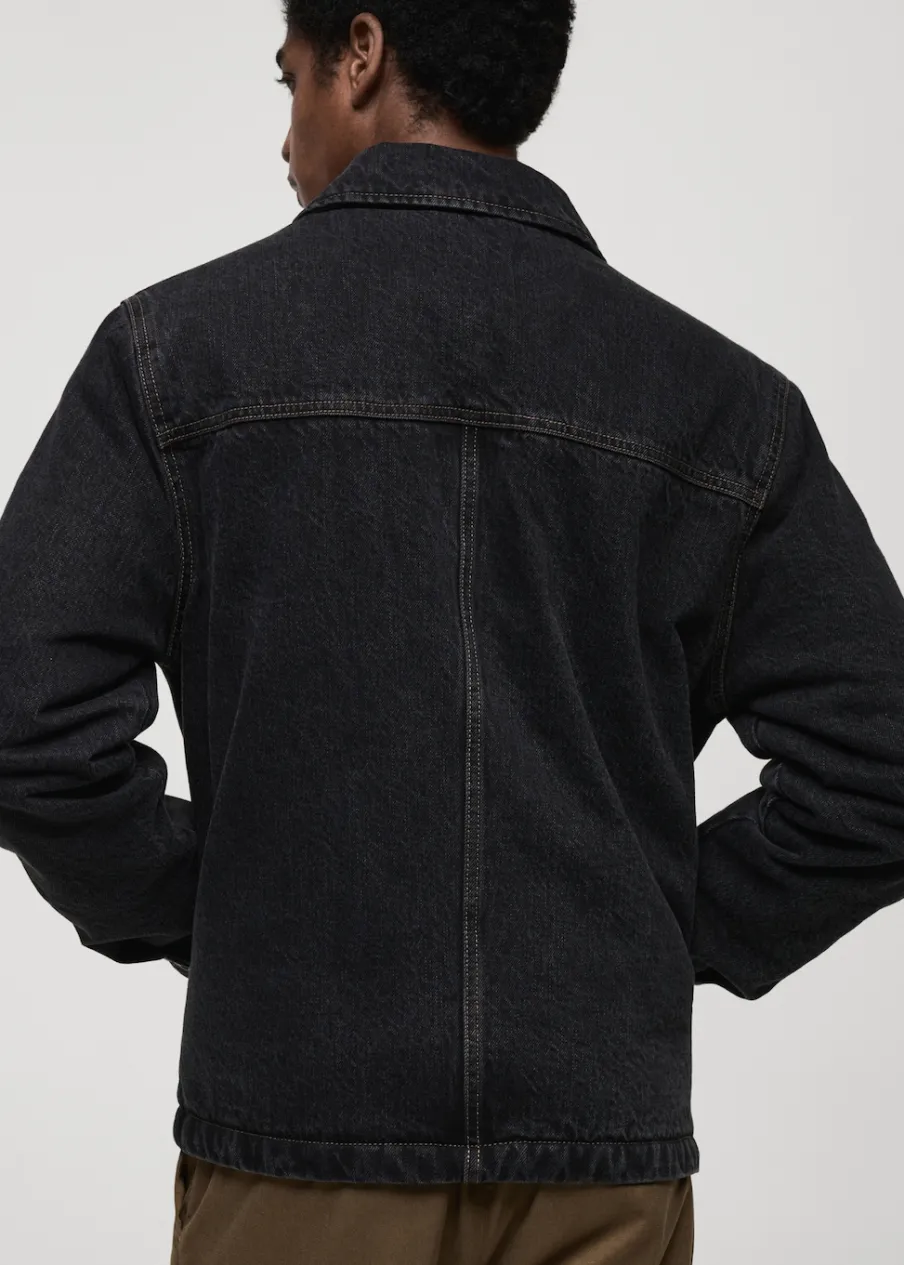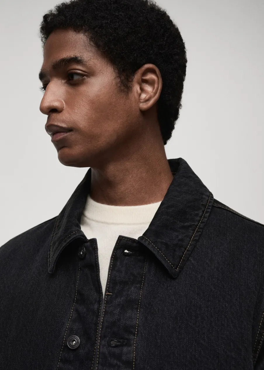 Krój regular. 100% bomull. Ciemny denim. Koszulowy kołnierz. Stębnowane detale. Zapięcie na guziki. Dwie wpuszczane kieszenie boczne. Zapinane mankiety. Prosty dół. Model ma 185 cm wzrostu i nosi rozmiar M.