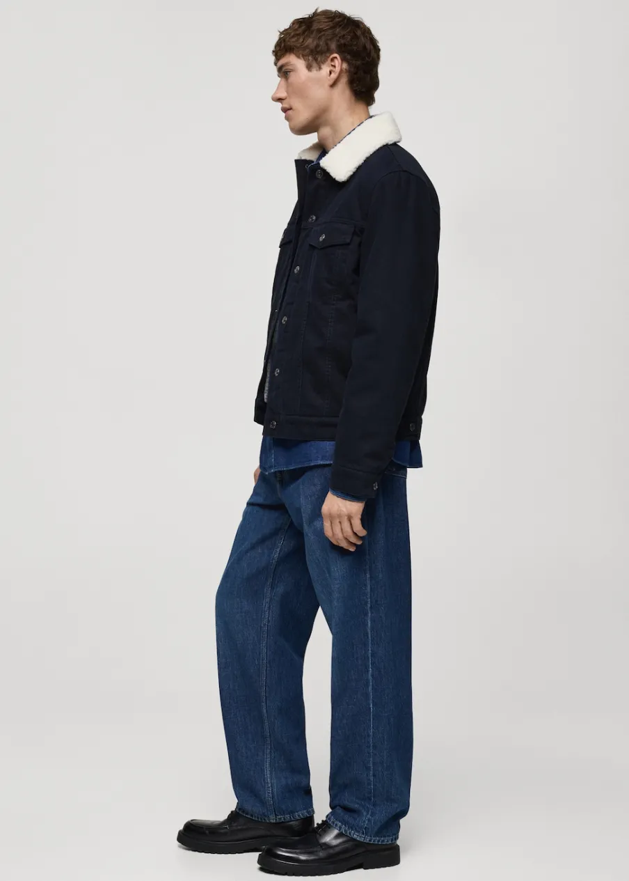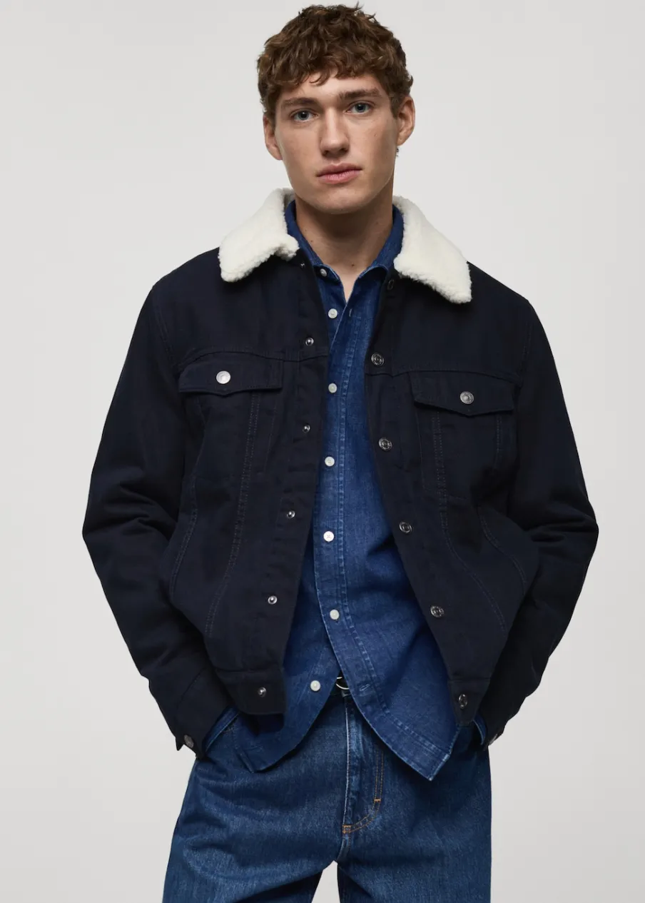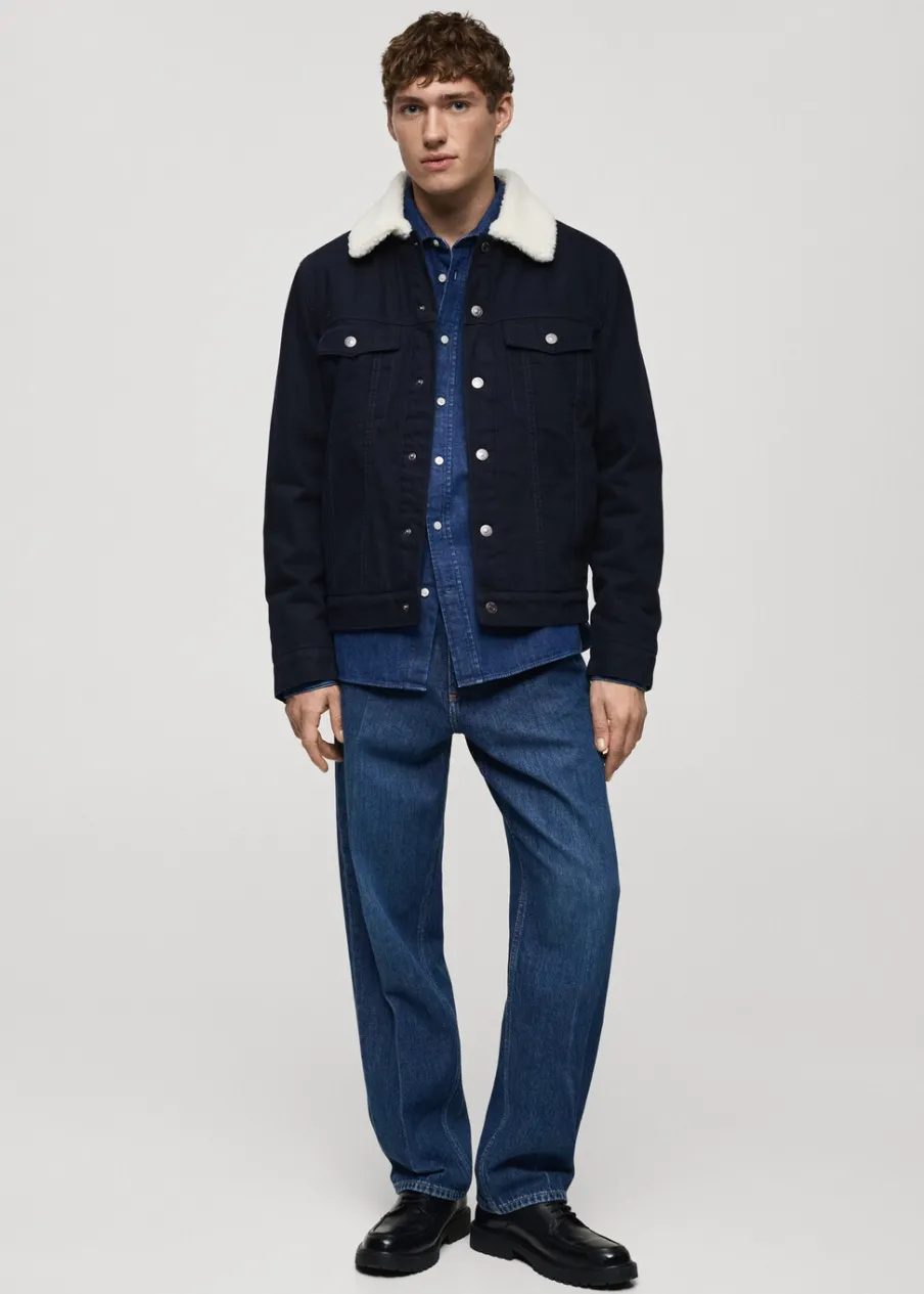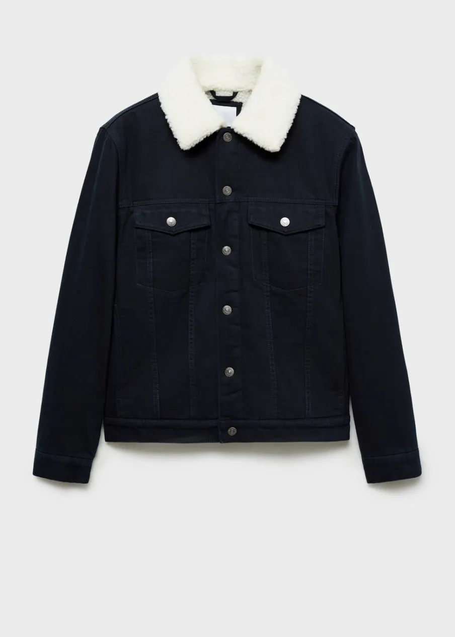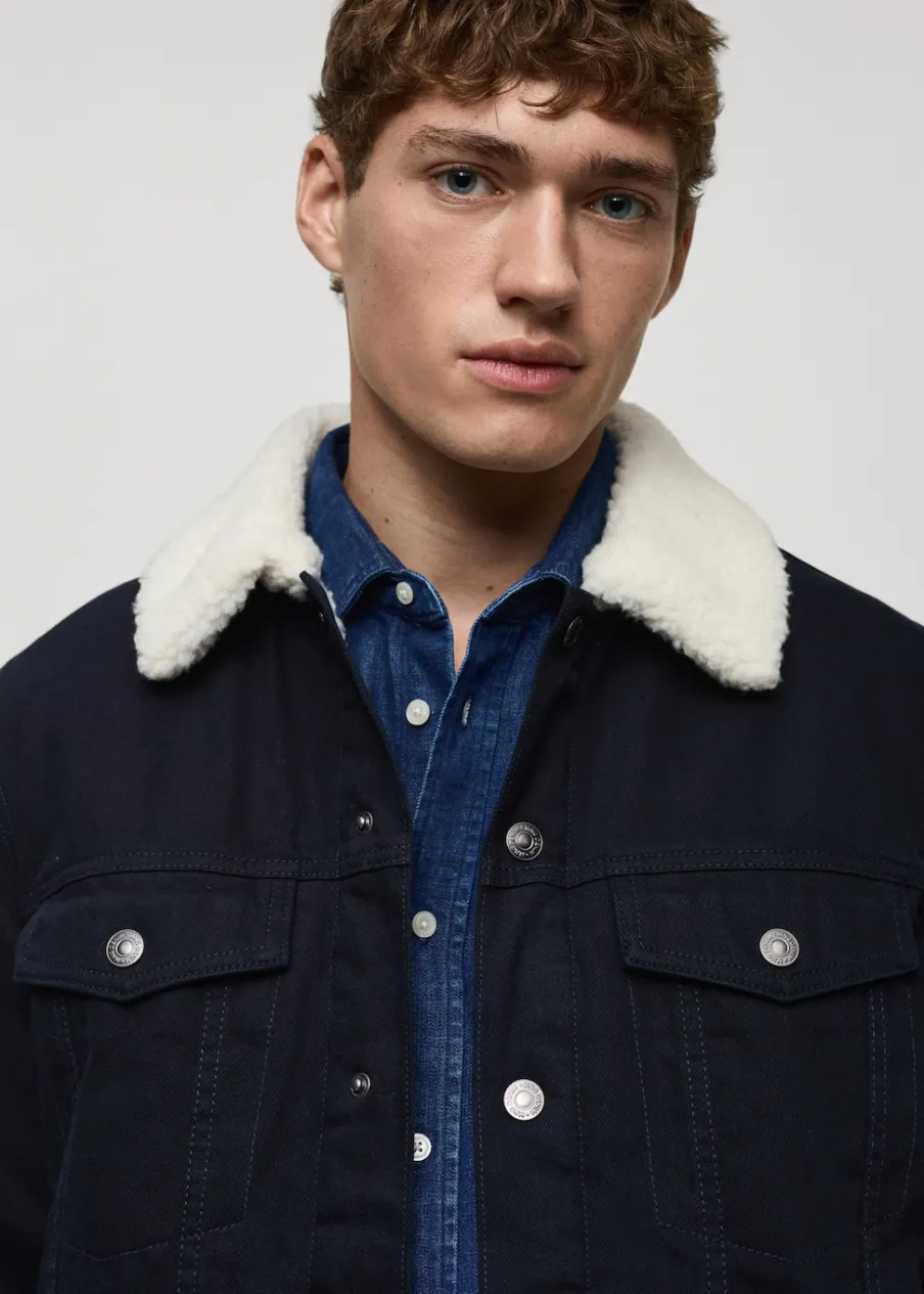 Krój regular. 100% bomull. Ciemny denim. Futrzany kołnierz. Zapięcie na guziki. Zapinane mankiety. Podszewka ze sztucznego baranka. Model ma 185 cm wzrostu i nosi rozmiar M. Dwie naszywane kieszenie z patkami na guzik z przodu.