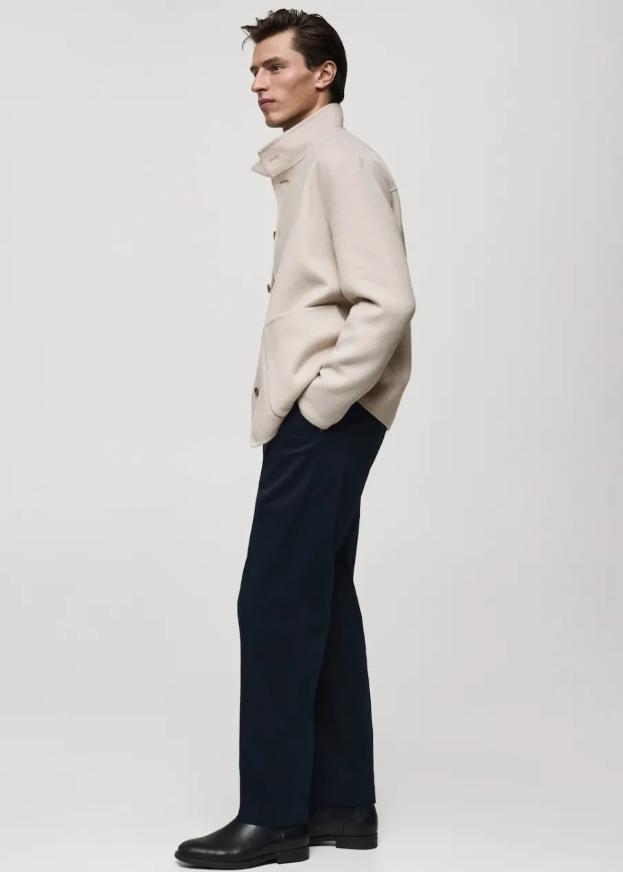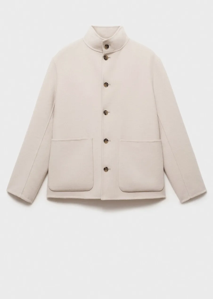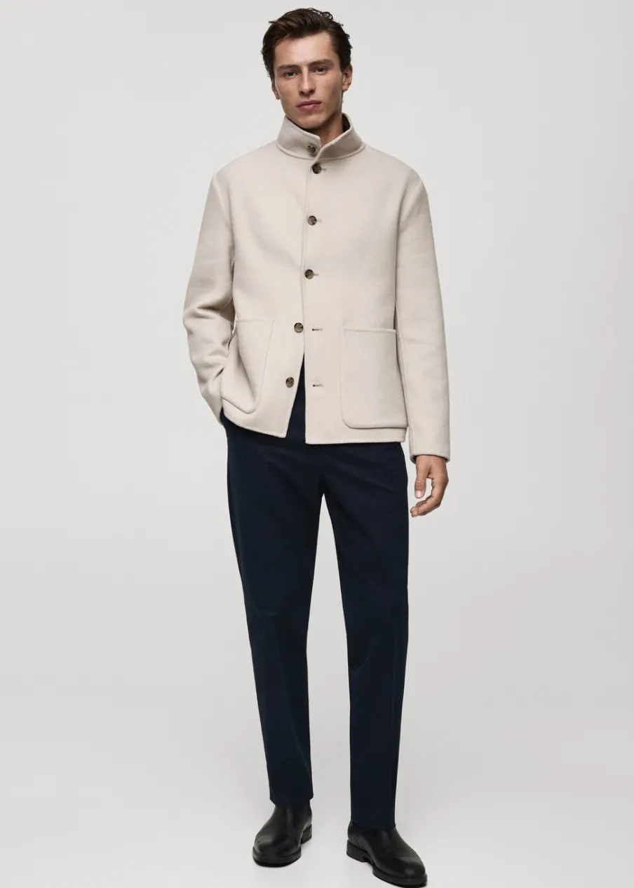 Kominowy kołnierz. Tkanina mieszanka wełny. Dwie kieszenie nakładane z przodu. Długi rękaw. Prosty dół. Model ma 185 cm wzrostu i nosi rozmiar M. Kolekcja Selection. Fason handmade. Krój regular. Zapięcie na guziki z przodu.