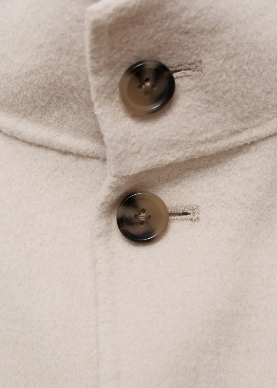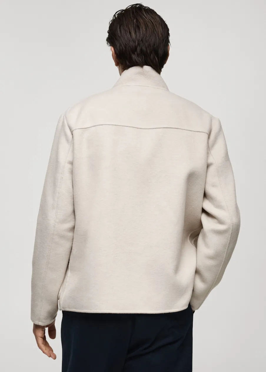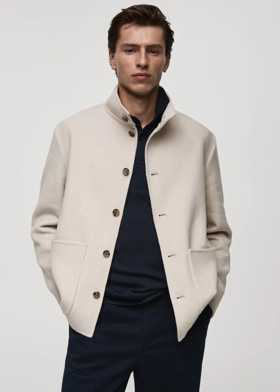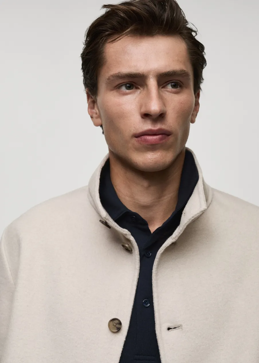 Kominowy kołnierz. Tkanina mieszanka wełny. Dwie kieszenie nakładane z przodu. Długi rękaw. Prosty dół. Model ma 185 cm wzrostu i nosi rozmiar M. Kolekcja Selection. Fason handmade. Krój regular. Zapięcie na guziki z przodu.