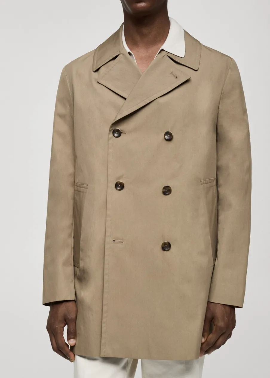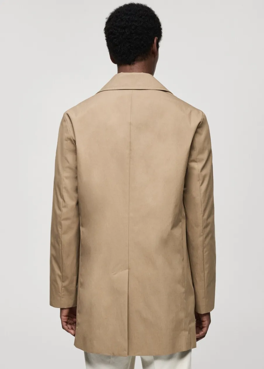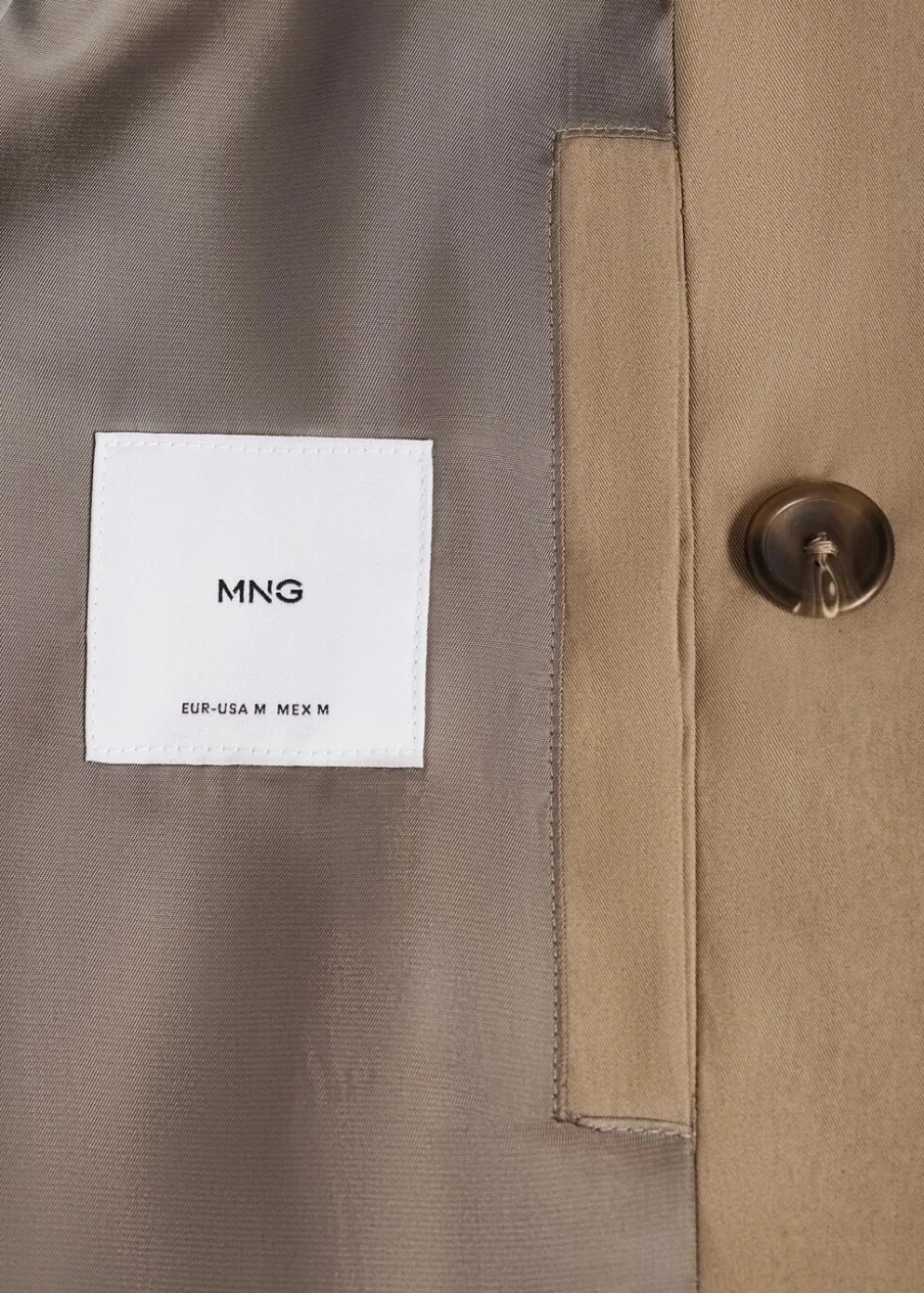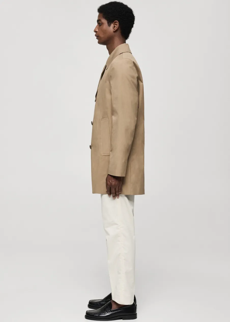 Model prosty. Tkanina mieszanka bawełny. Szeroki kołnierz z klapami. Kopertowy wzór z dwurzędowym zapięciem z przodu. Długi rękaw. Dwie wpuszczane kieszenie boczne. Rozcięcie z tyłu u dołu. Wewnętrzna podszewka. Wewnętrzna kieszeń. Model ma 190 cm wzrostu i nosi rozmiar M.