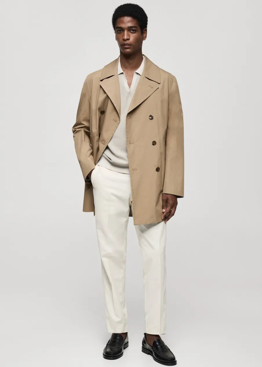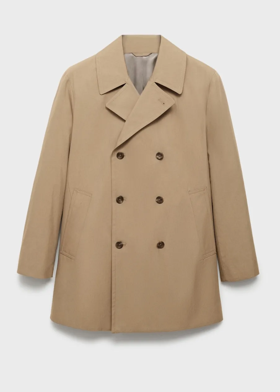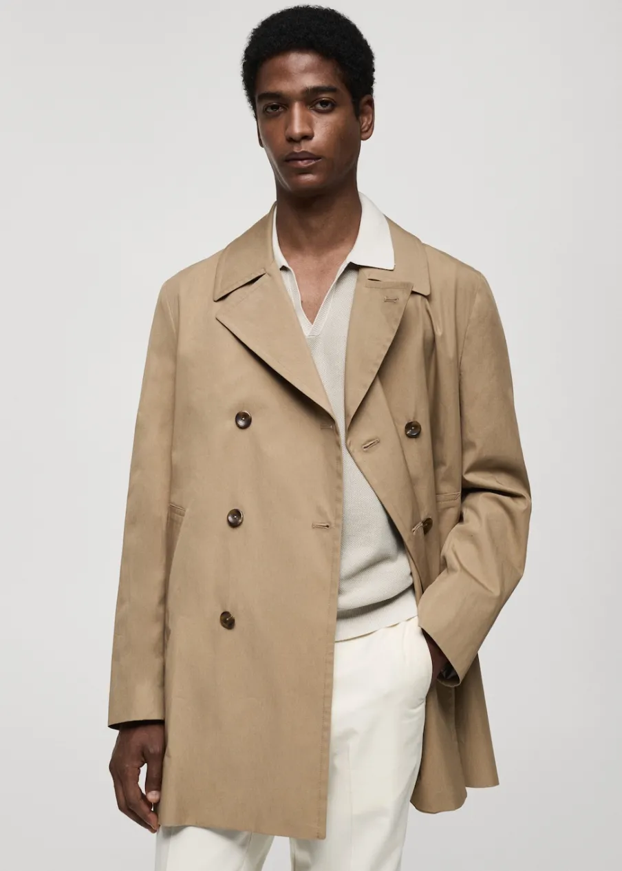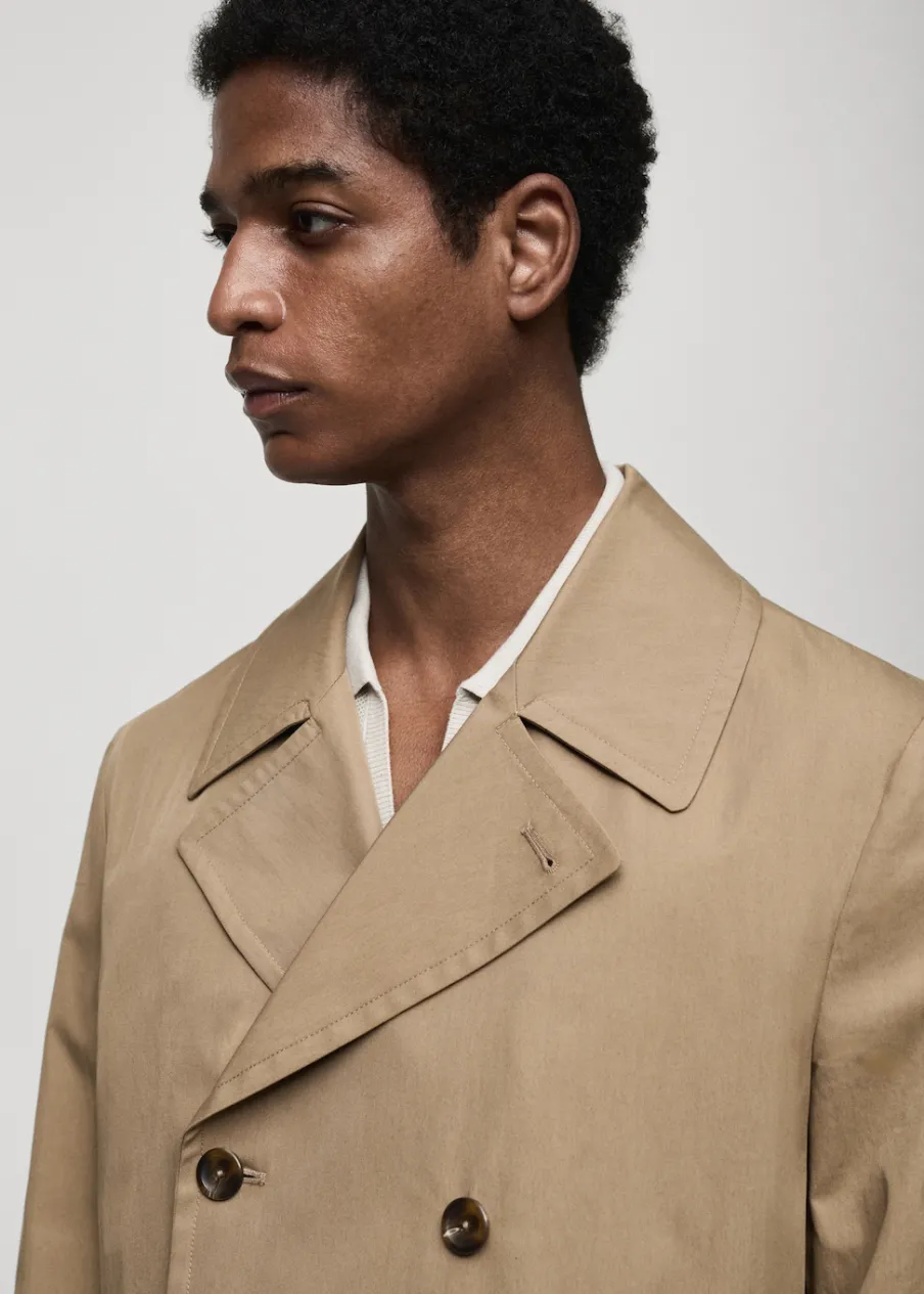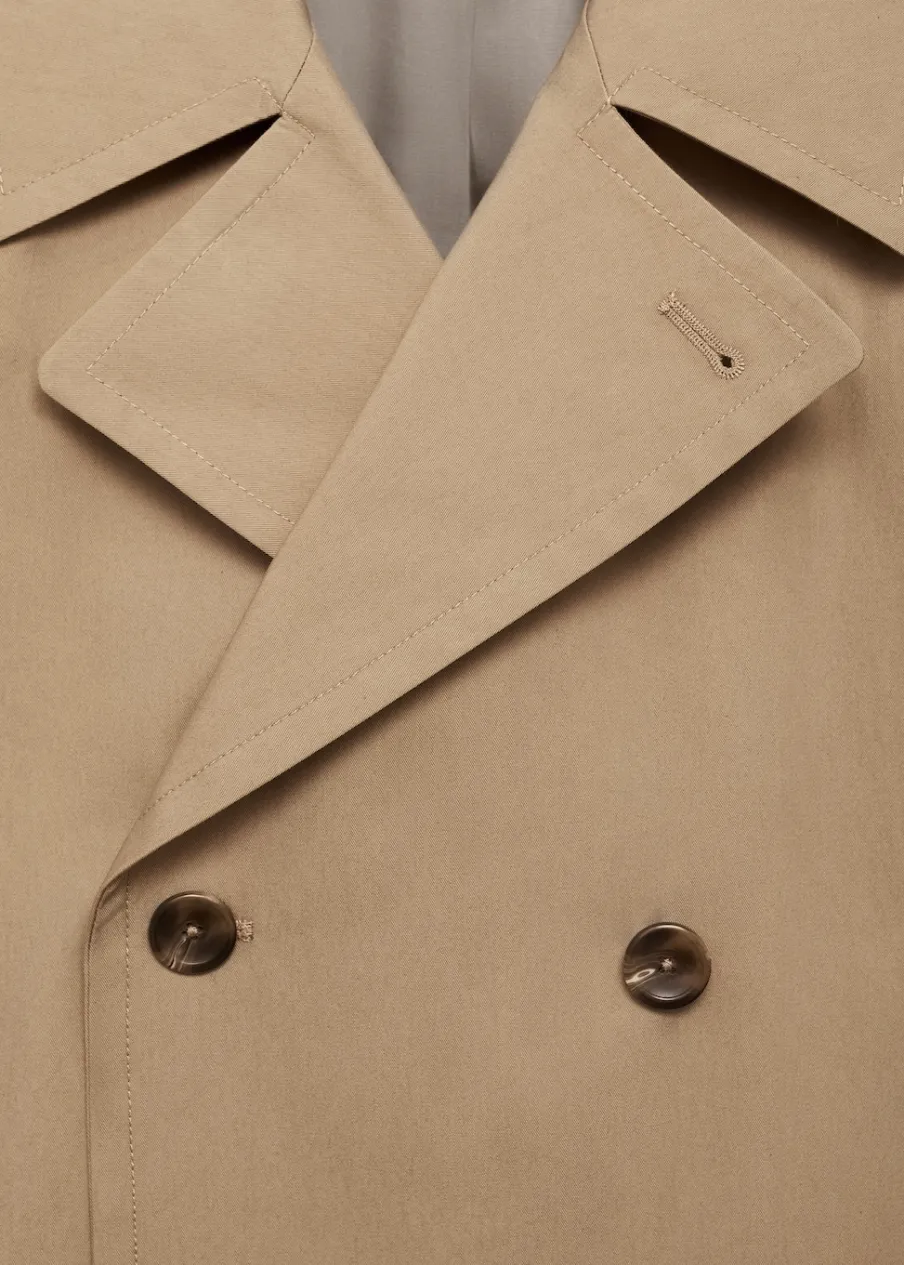Model prosty. Tkanina mieszanka bawełny. Szeroki kołnierz z klapami. Kopertowy wzór z dwurzędowym zapięciem z przodu. Długi rękaw. Dwie wpuszczane kieszenie boczne. Rozcięcie z tyłu u dołu. Wewnętrzna podszewka. Wewnętrzna kieszeń. Model ma 190 cm wzrostu i nosi rozmiar M.