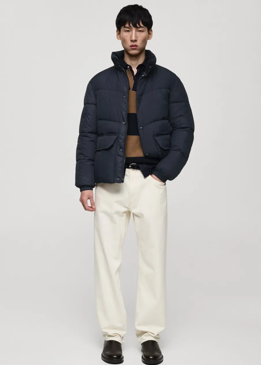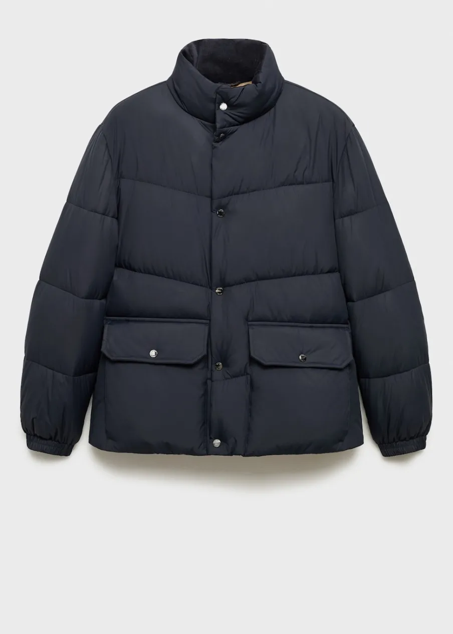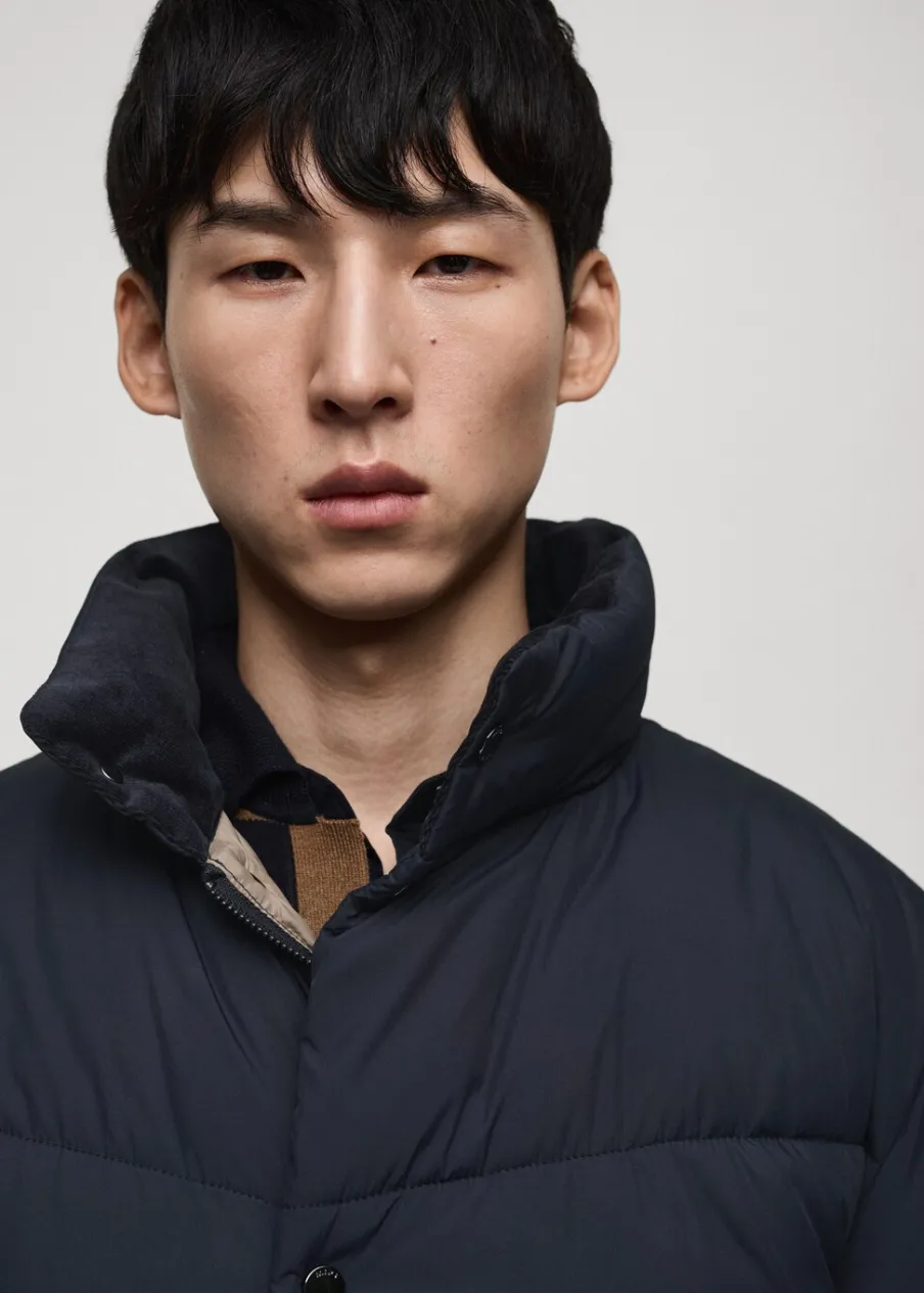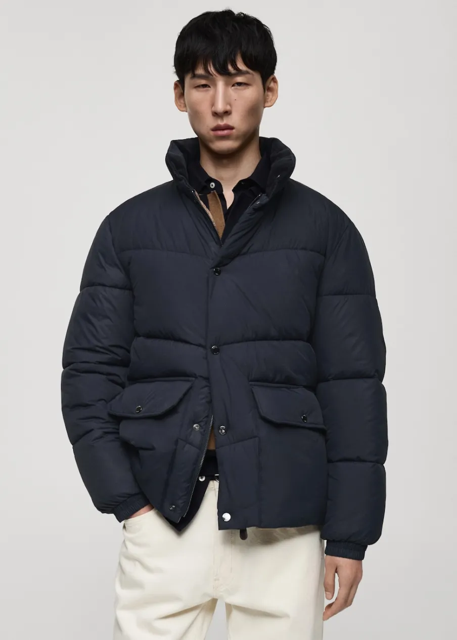 Materiały z recyklingu. Model pikowany. Water Repellent: trwałe wykończenie tego modelu chroni przed lekkim deszczem, odpycha cząsteczki wody i krople deszczu. Półgolf. Wewnętrzna kieszeń. Model ma 185 cm wzrostu i nosi rozmiar M. Zapięcie na zamek i zatrzaski z przodu. Dwie naszywane kieszenie z patkami na guzik z przodu.