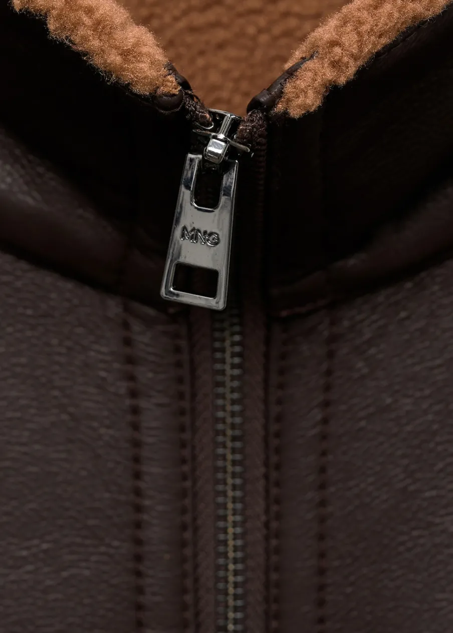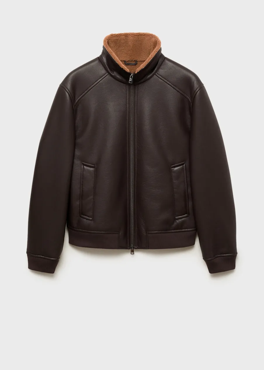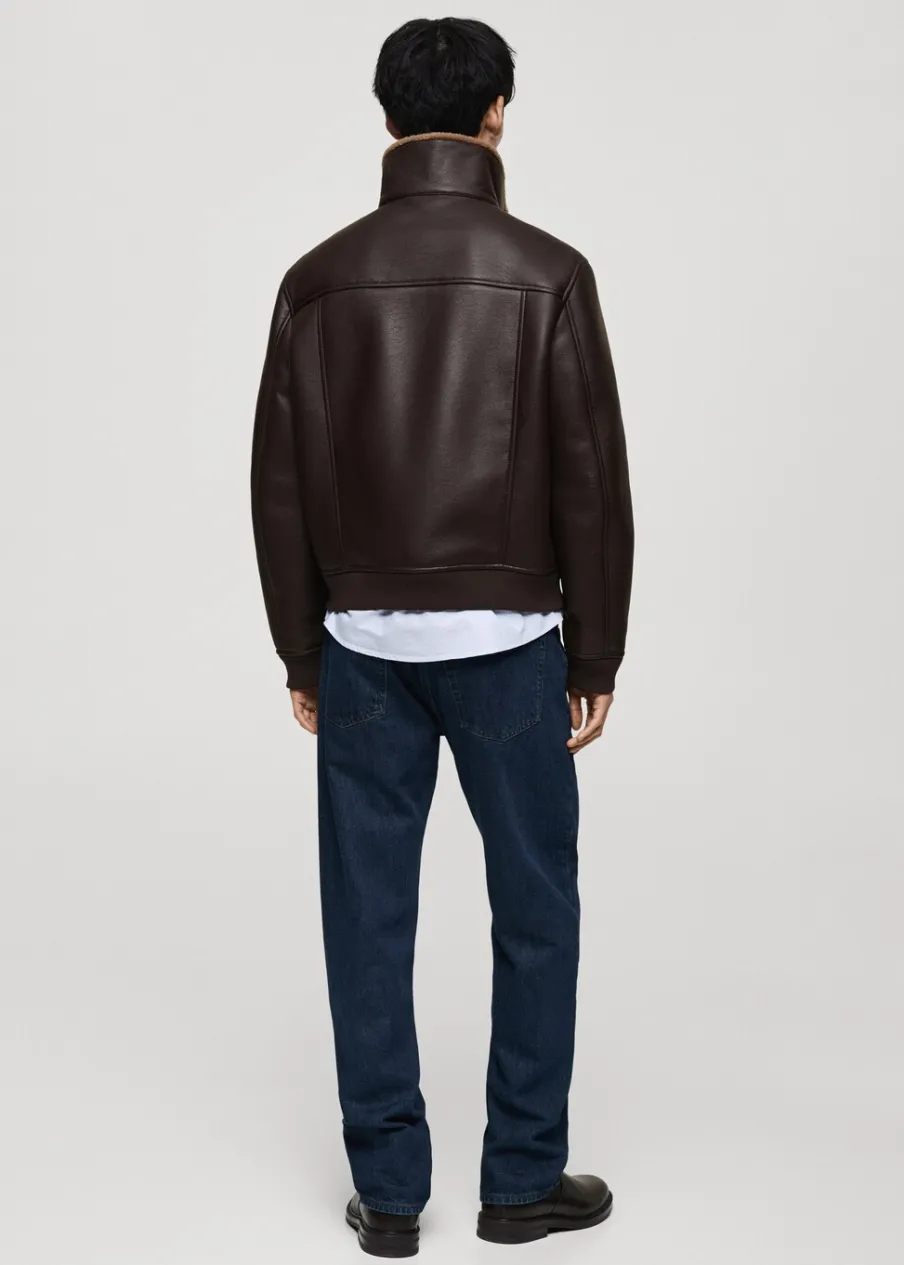 Kominowy kołnierz. Zapięcie na suwak. Dwie kieszenie boczne. Mankiety i dół wykończone kontrastowym ściągaczem. Model ma 185 cm wzrostu i nosi rozmiar M. Wyłącznie online. Efekt skóry. Futrzana podszewka z baranka.