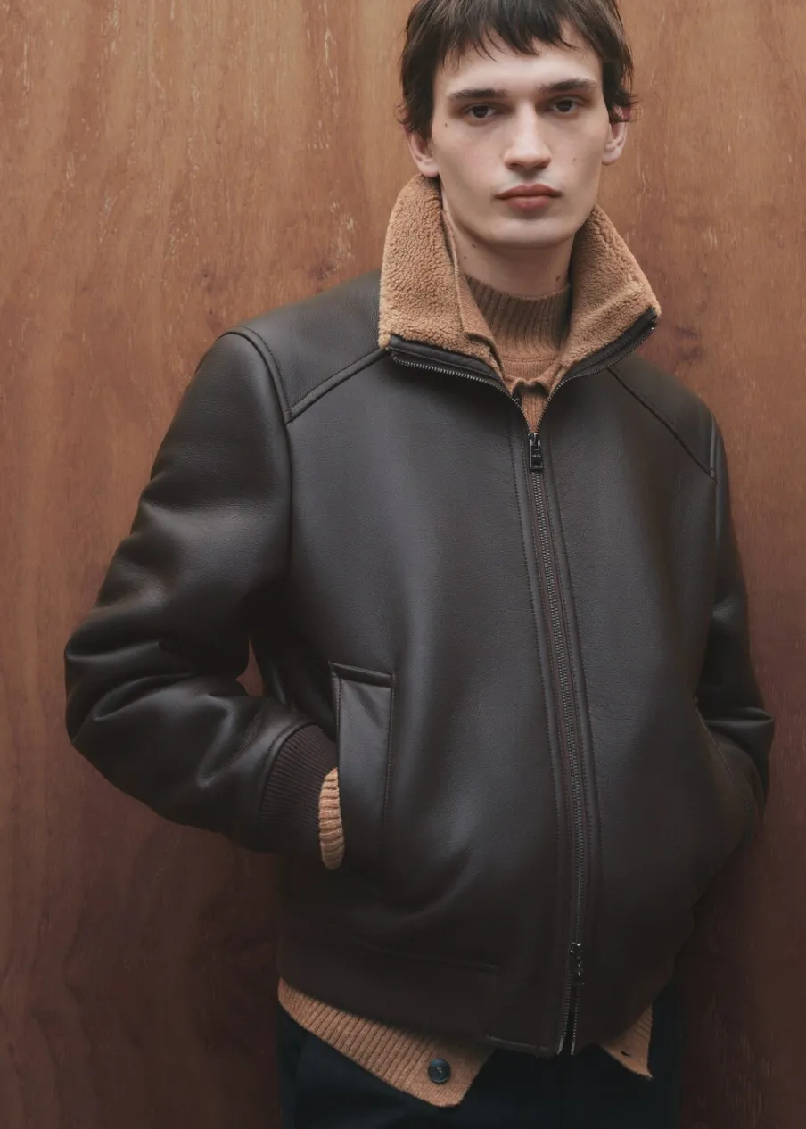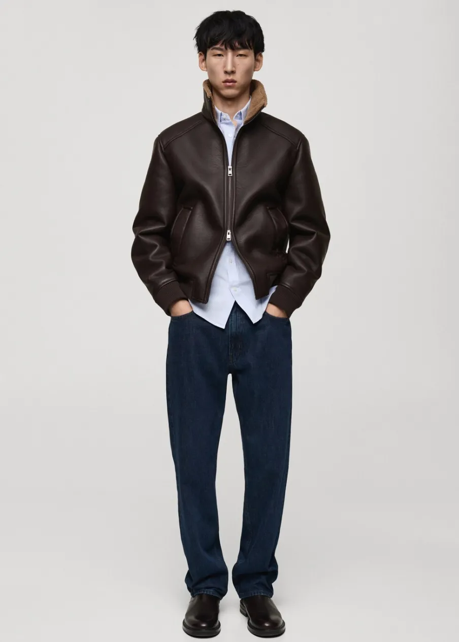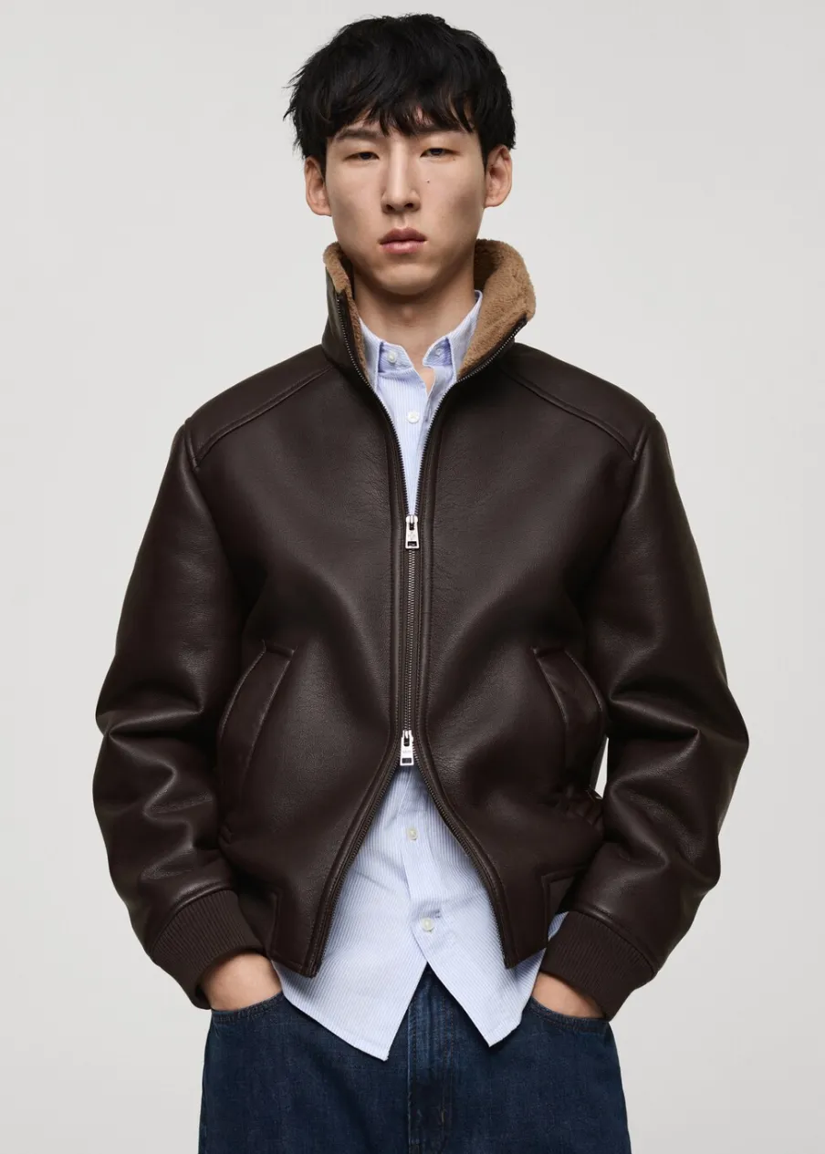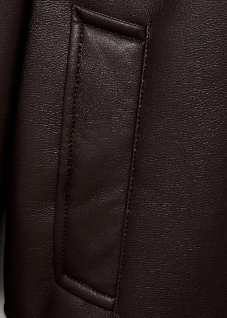 Kominowy kołnierz. Zapięcie na suwak. Dwie kieszenie boczne. Mankiety i dół wykończone kontrastowym ściągaczem. Model ma 185 cm wzrostu i nosi rozmiar M. Wyłącznie online. Efekt skóry. Futrzana podszewka z baranka.