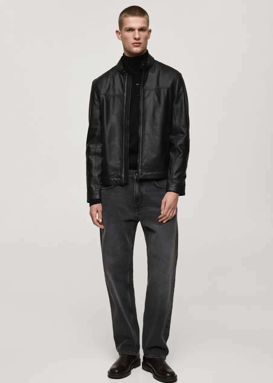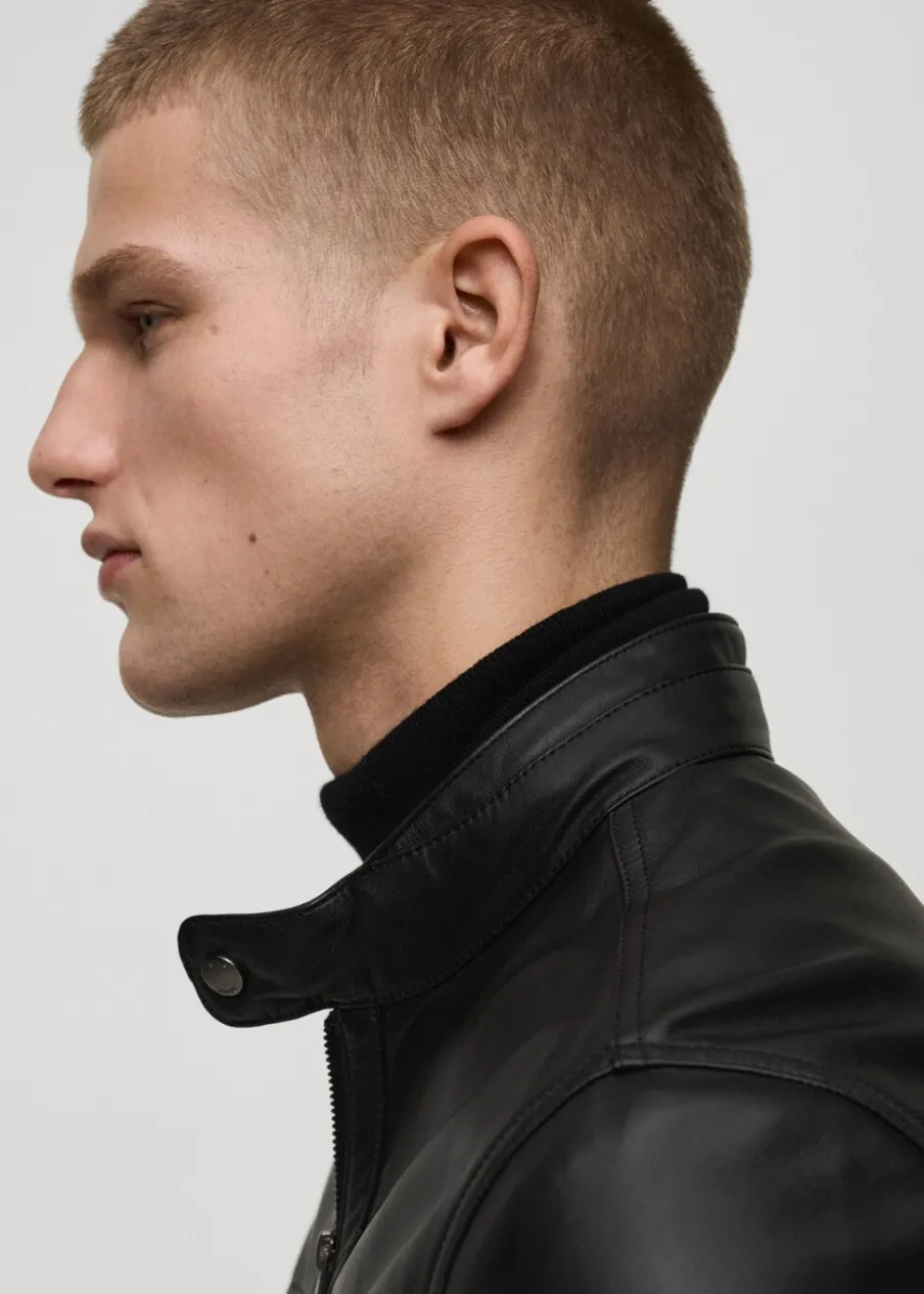 100% skóra nappa. Model biker. Krótki krój. Pikowane wstawki na ramionach. Okrągły dekolt z zapięciem na guzik. Zasuwane kieszenie z przodu. Długi rękaw z suwakiem. Kryte zapięcie z przodu na suwak. Wewnętrzna podszewka. Wewnętrzna kieszeń. Model ma 190 cm wzrostu i nosi rozmiar M.