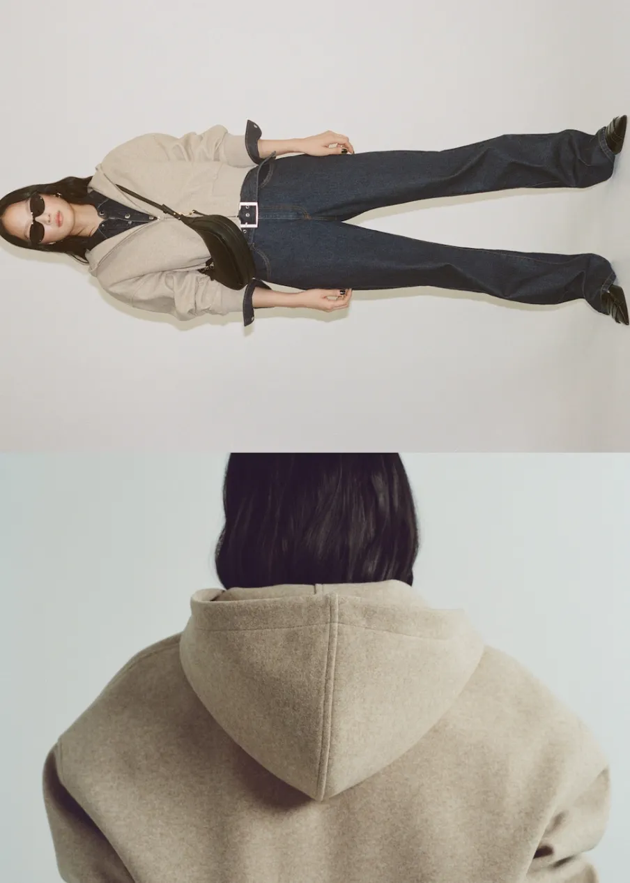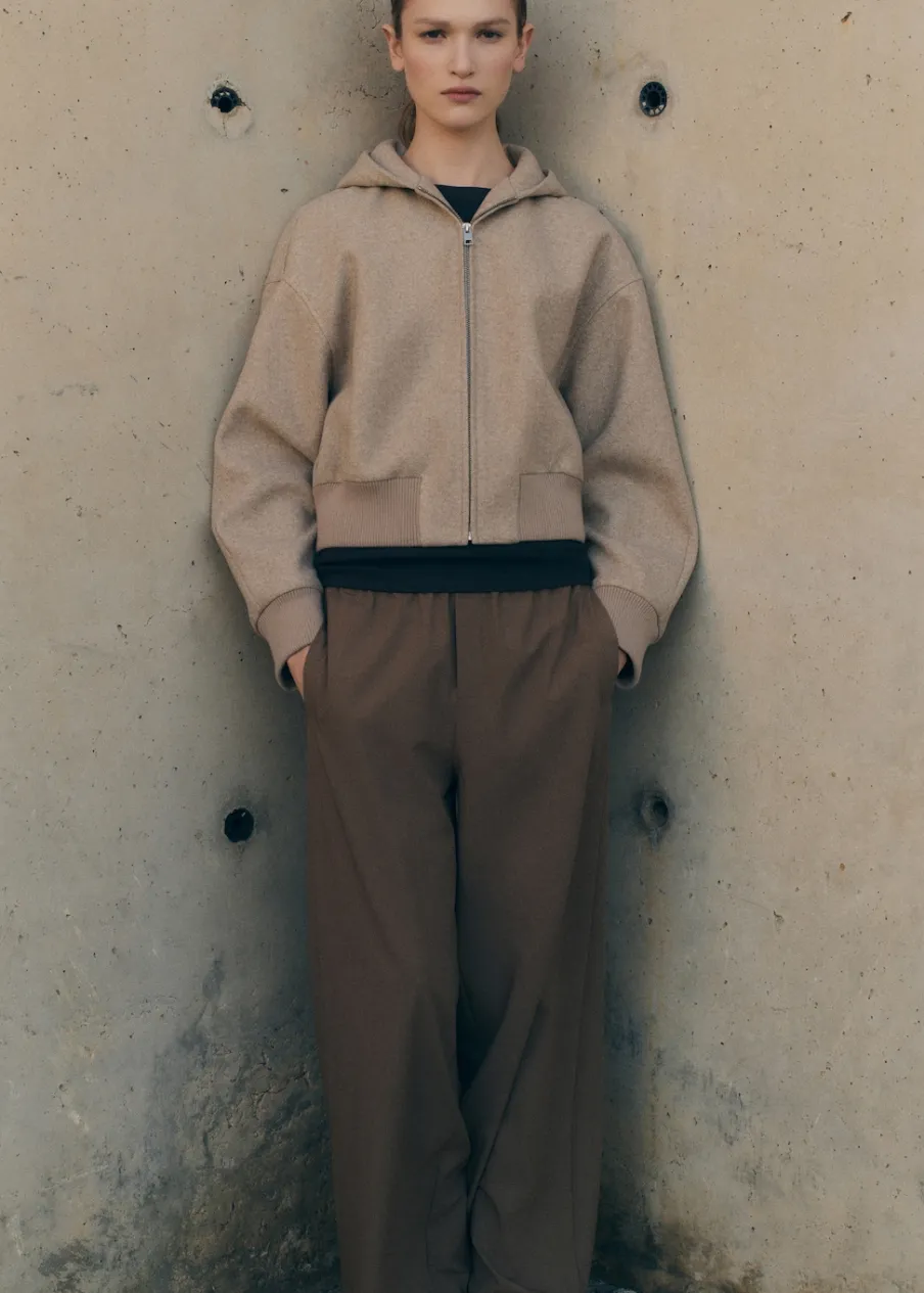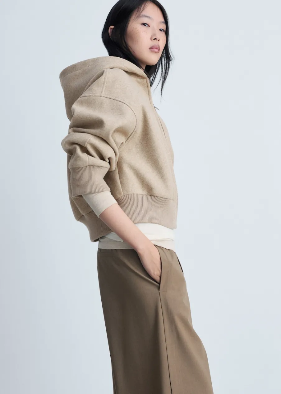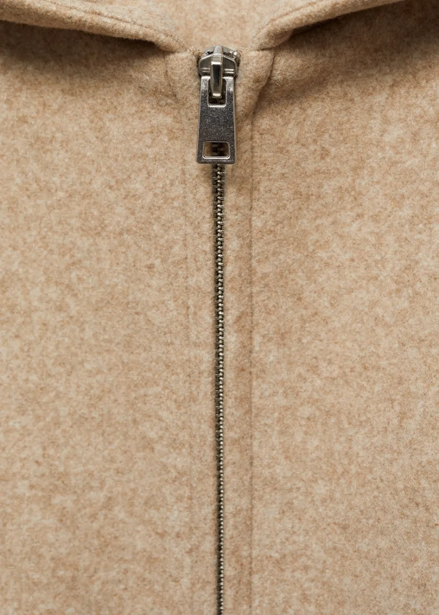OpisModel oversize. Golf. Z kapturem. Długi rękaw z elastycznymi mankietami. Zapięcie z przodu na suwak.