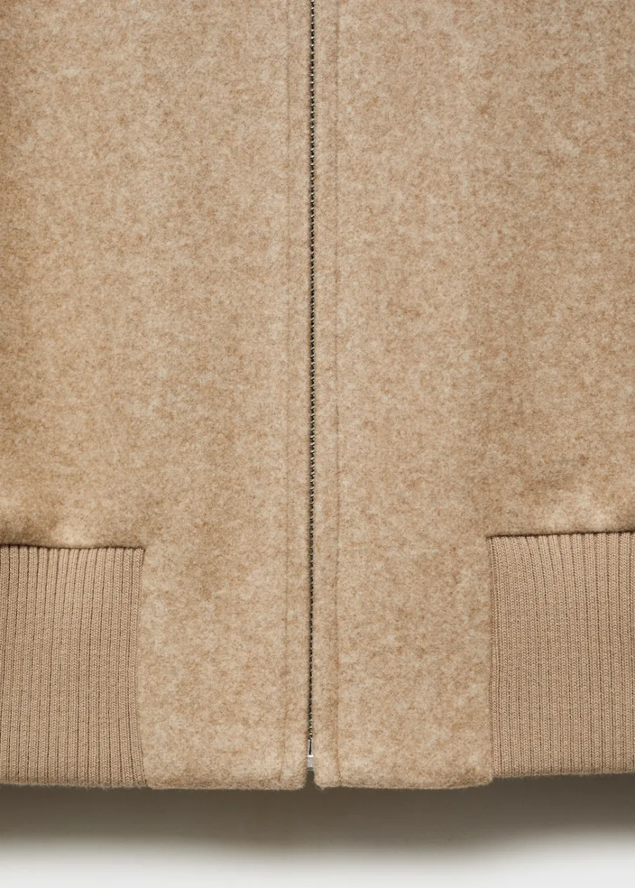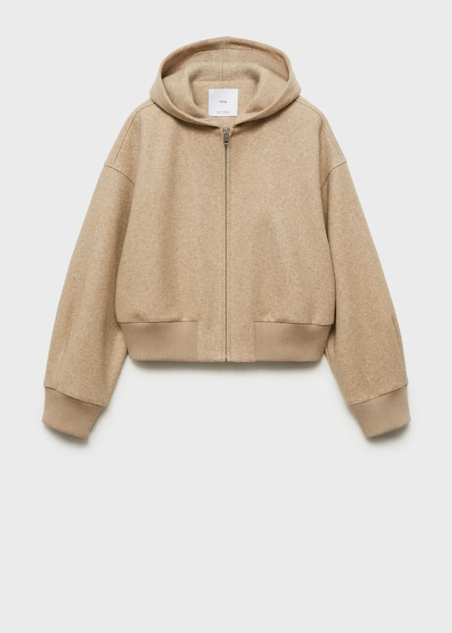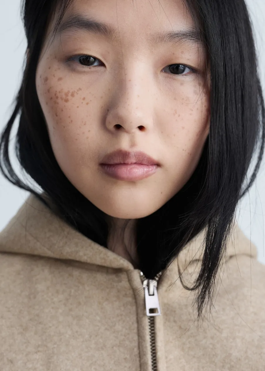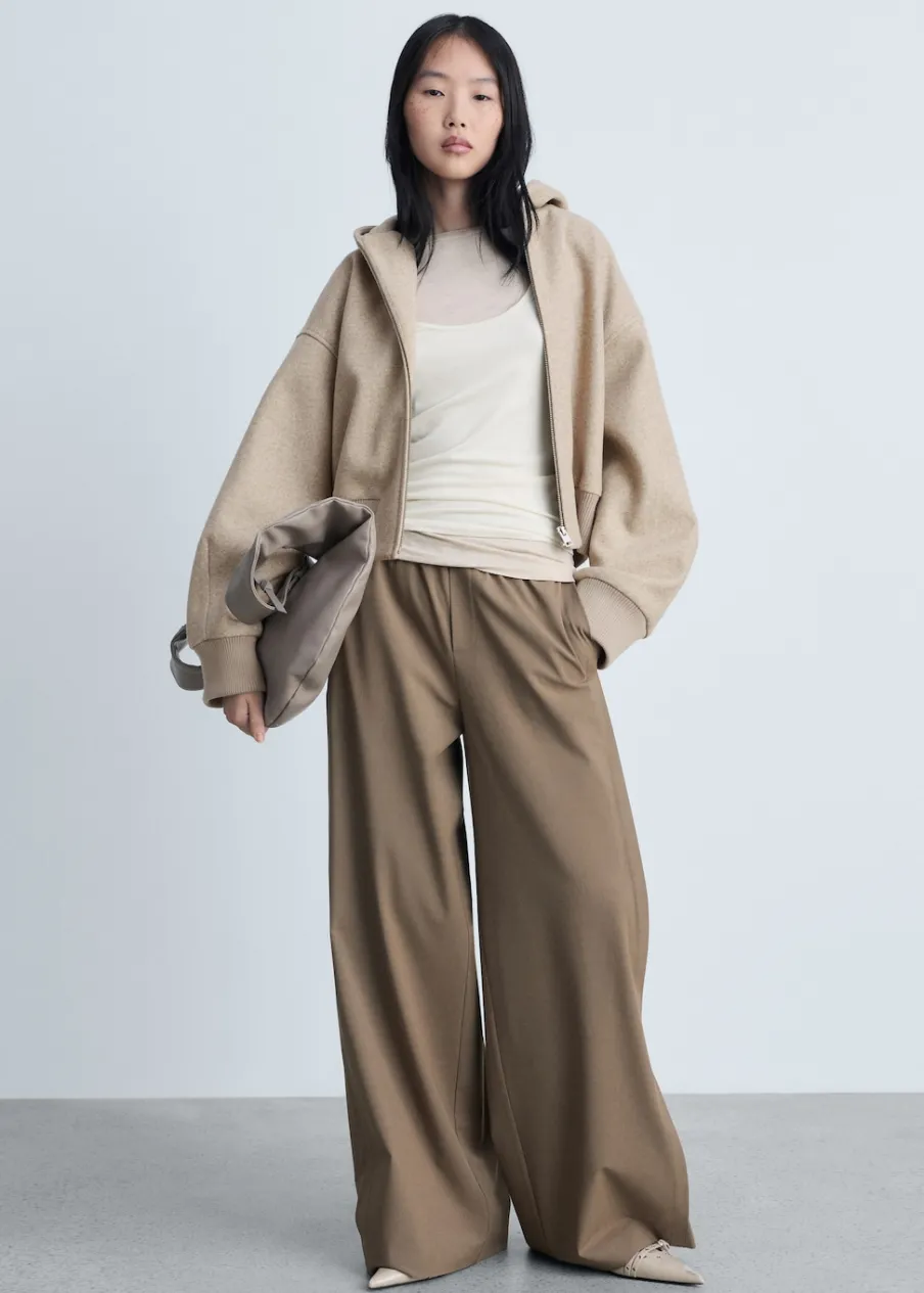 OpisModel oversize. Golf. Z kapturem. Długi rękaw z elastycznymi mankietami. Zapięcie z przodu na suwak.