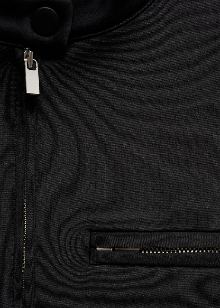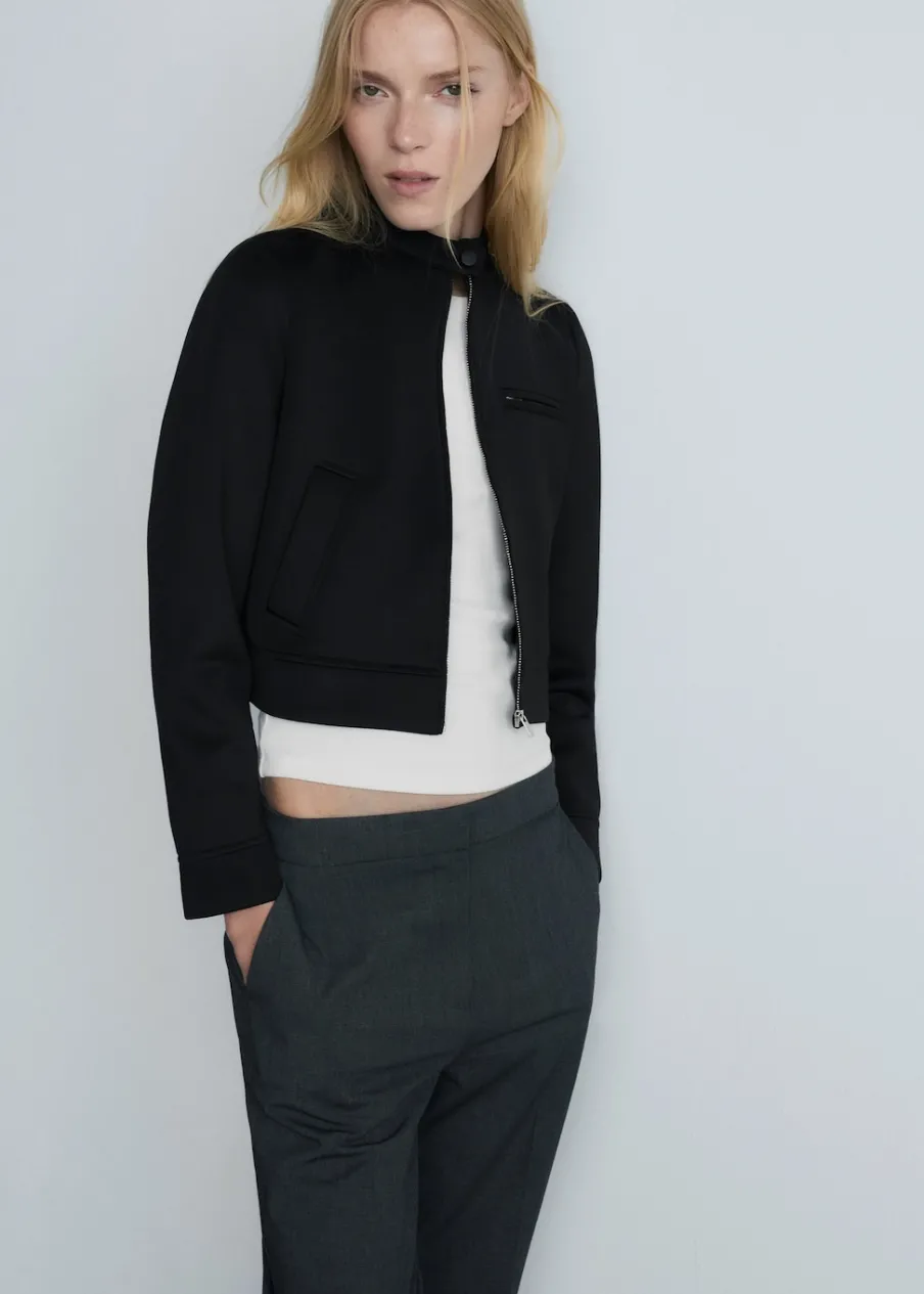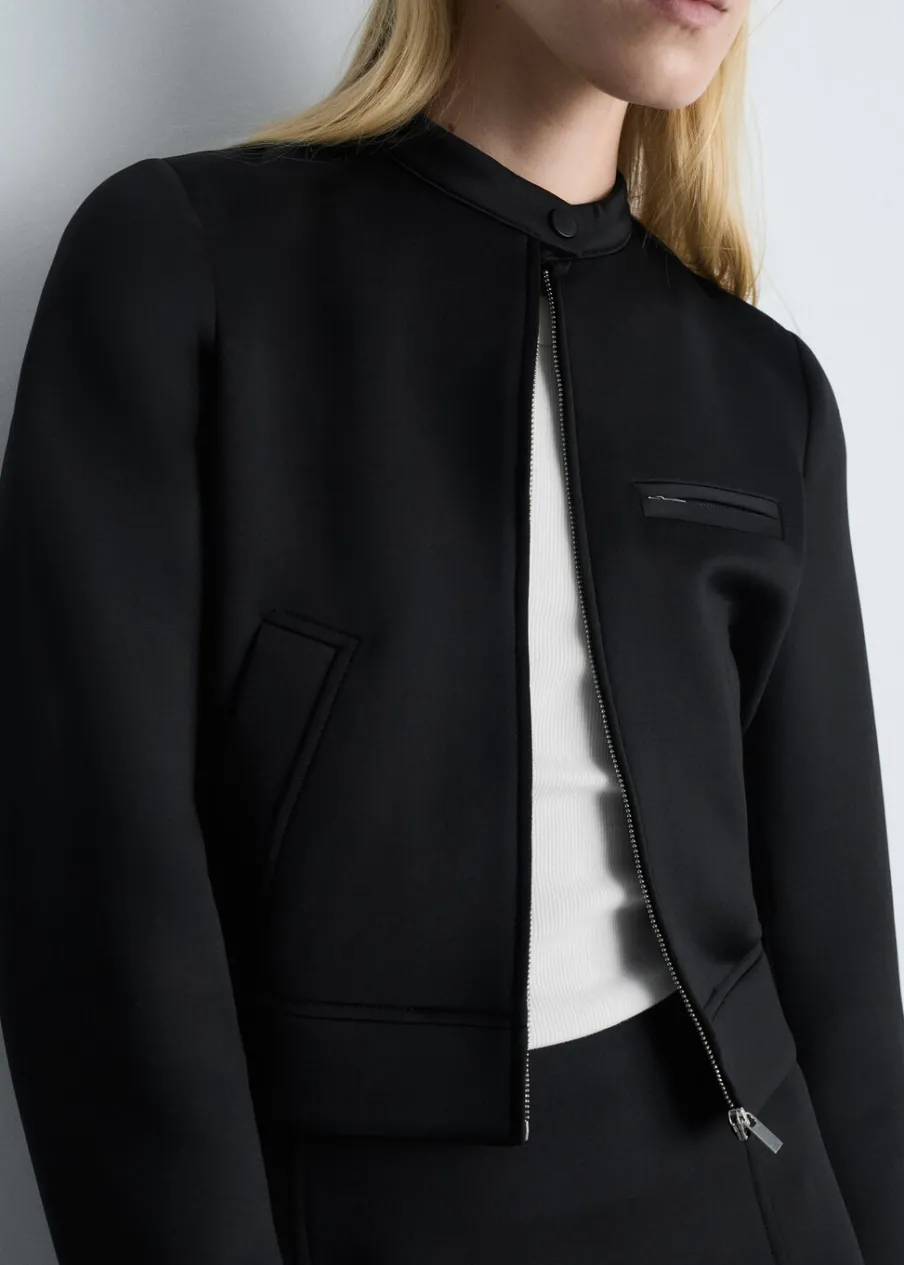 Deseń crop. Model prosty. Dekolt z listwą. Długi rękaw. Dwie kieszenie boczne. Kieszeń wpuszczana na piersi. Zapięcie na zamek z przodu. Total look. Modelka ma 178 cm wzrostu i nosi rozmiar S/36.