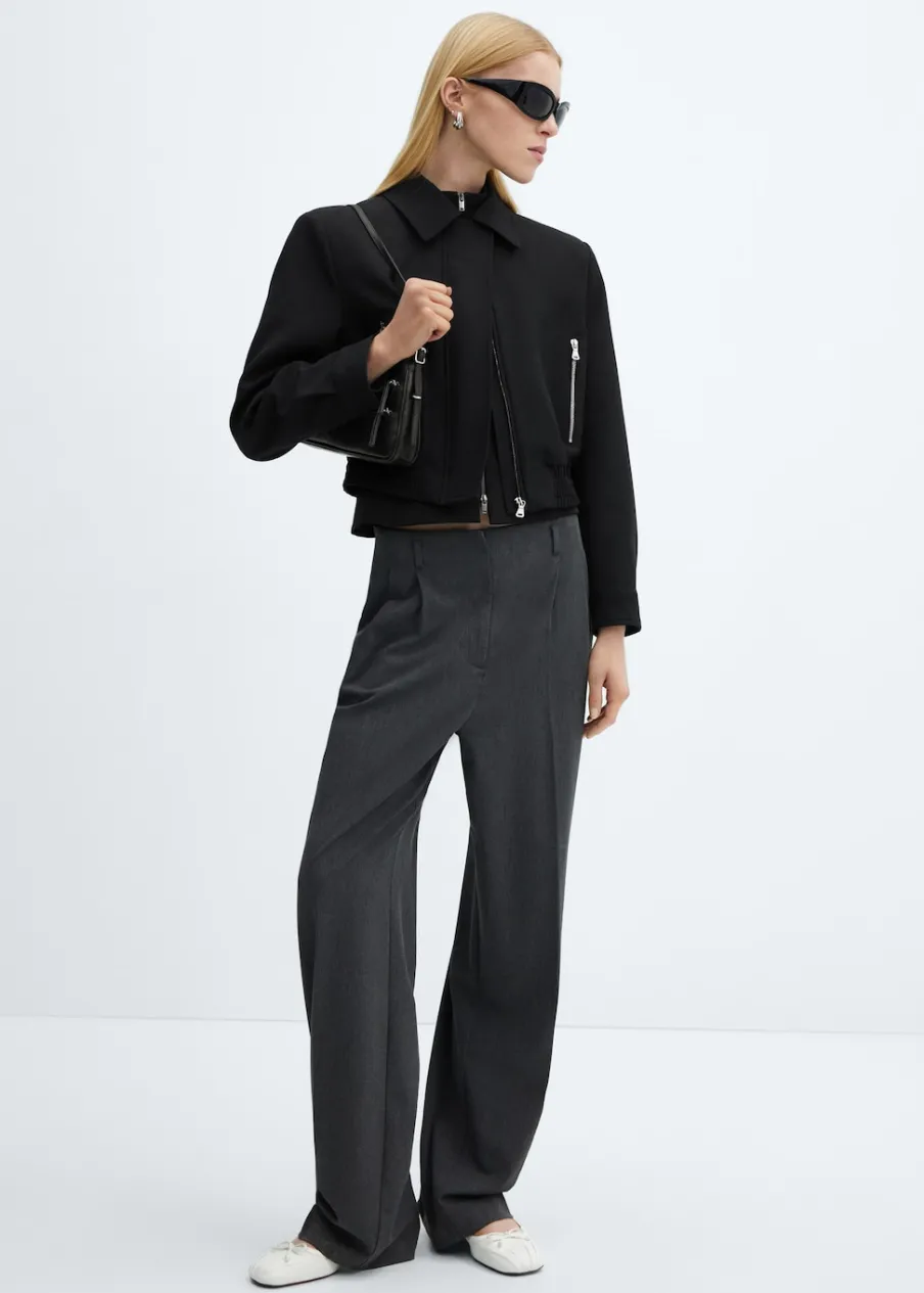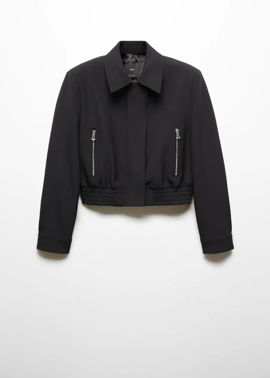 Model prosty. Krótki krój. Koszulowy kołnierz. Długi rękaw z guzikami na mankietach. Dwie kieszenie na zamek z boku. Kryte zapięcie z przodu na suwak. Elastyczna gumka u dołu. Wewnętrzna podszewka. Stylizacje biurowe.