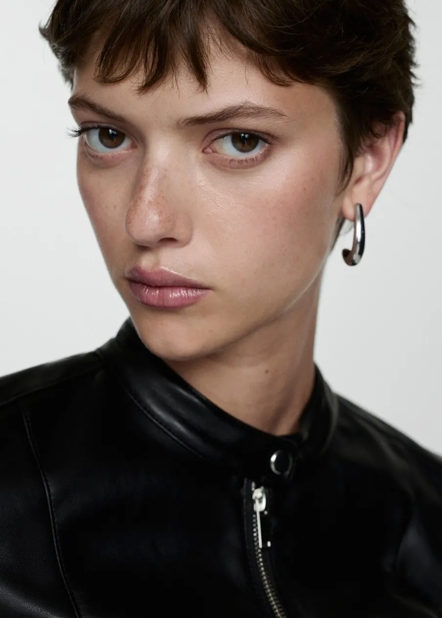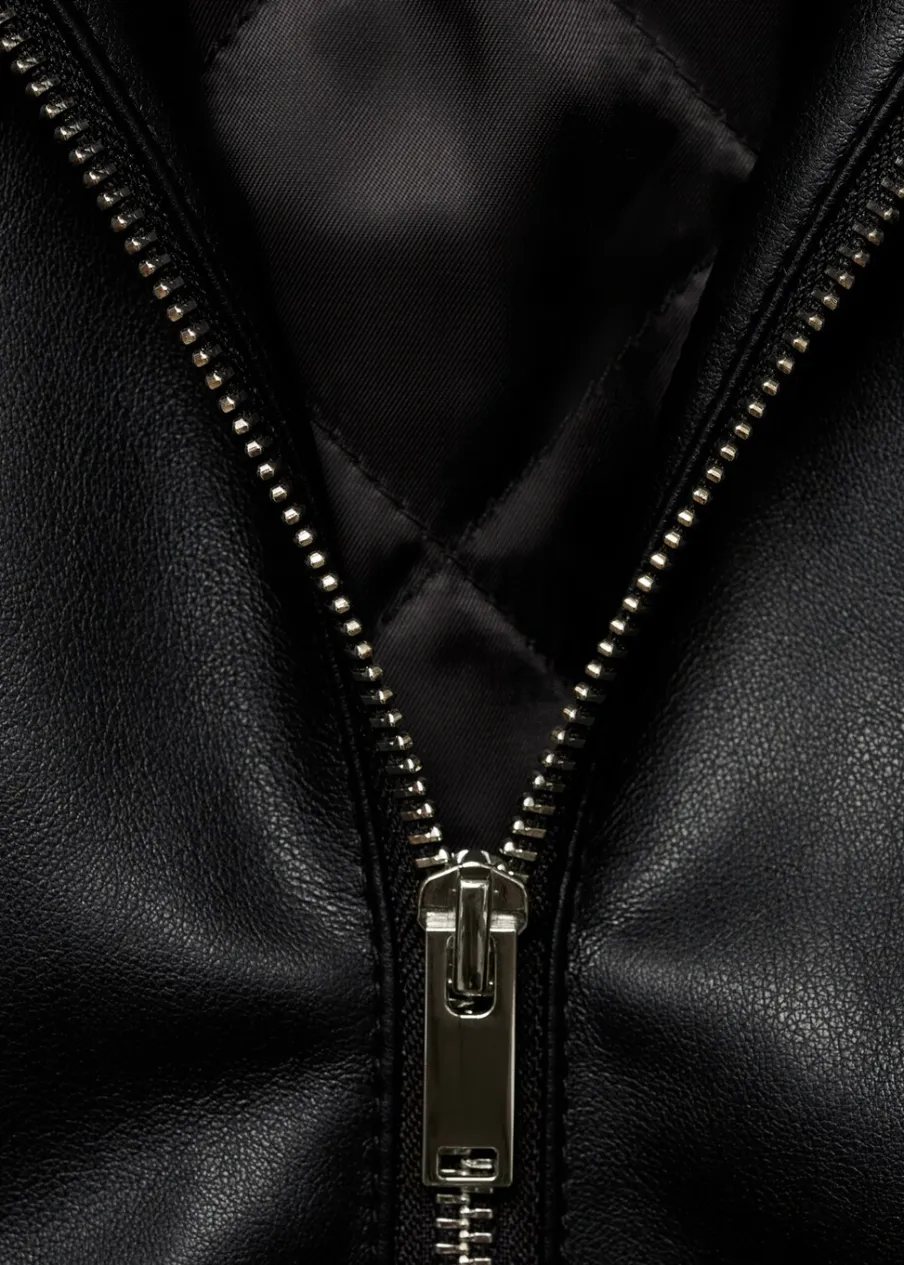 Okrągły dekolt. Model pikowany. Efekt skóry. Model biker. Slim-fit. Krótki krój. Zapięcie na zamek z przodu. Zapinany kołnierzyk. Kieszenie boczne zapinane na suwak. Długi rękaw.