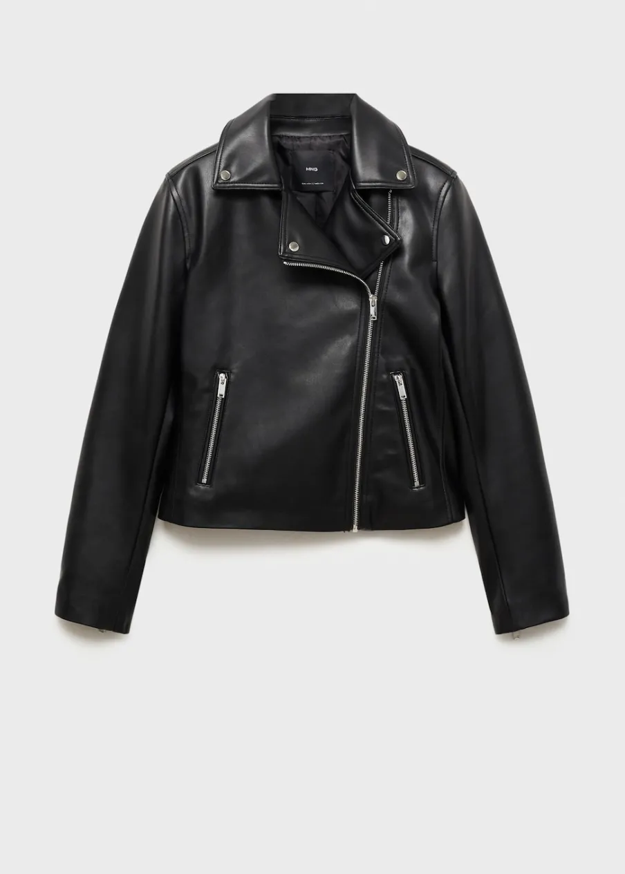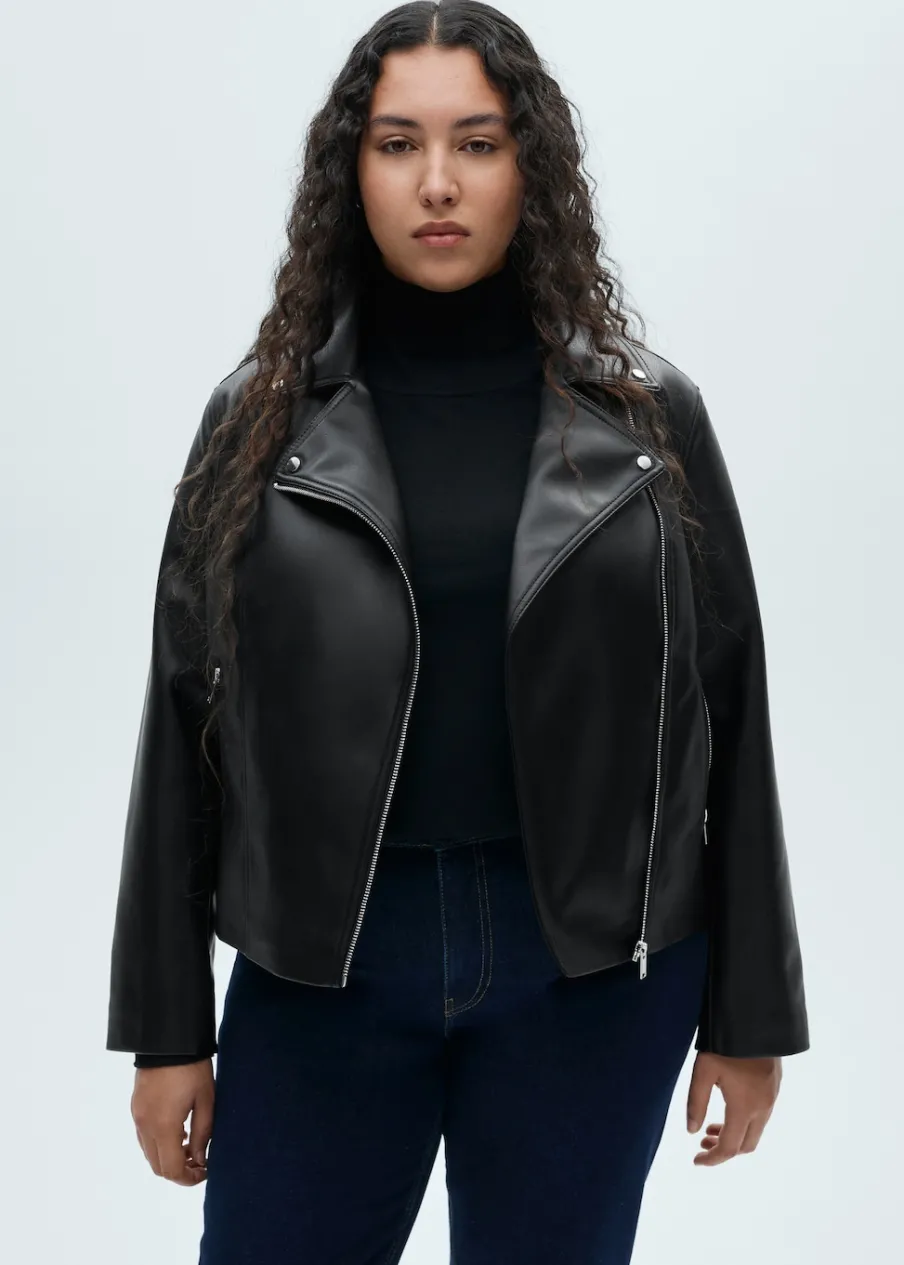Efekt skóry. Model biker. Model standardowy. Slim-fit. Średnia wielkość. Dekolt w szpic z kołnierzykiem. Koszulowy kołnierz. Długi rękaw z suwakiem. Dwie kieszenie boczne z zapięciem na zamek. Zapięcie na zamek z przodu. Wewnętrzna podszewka.
