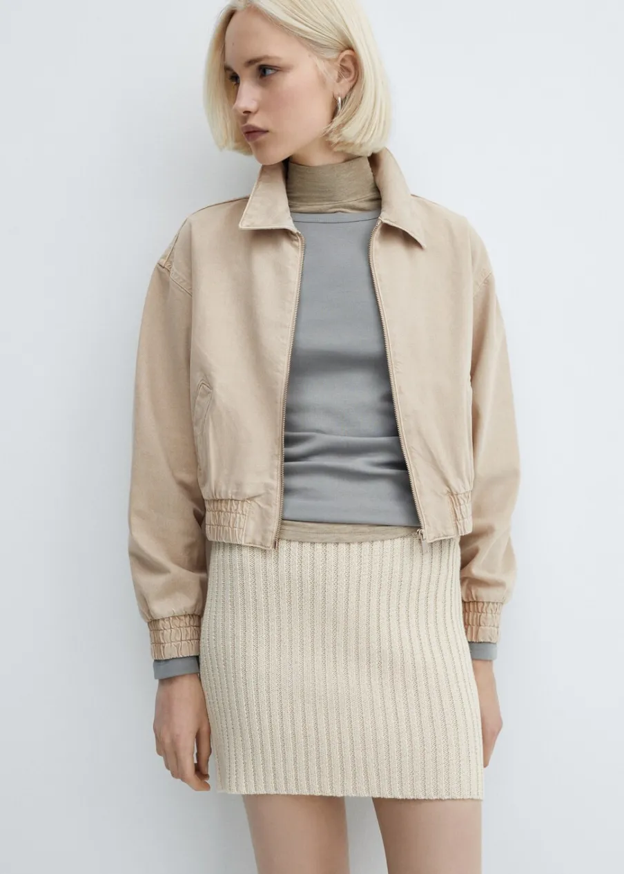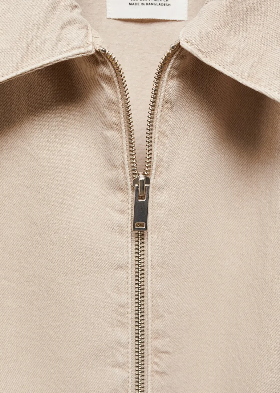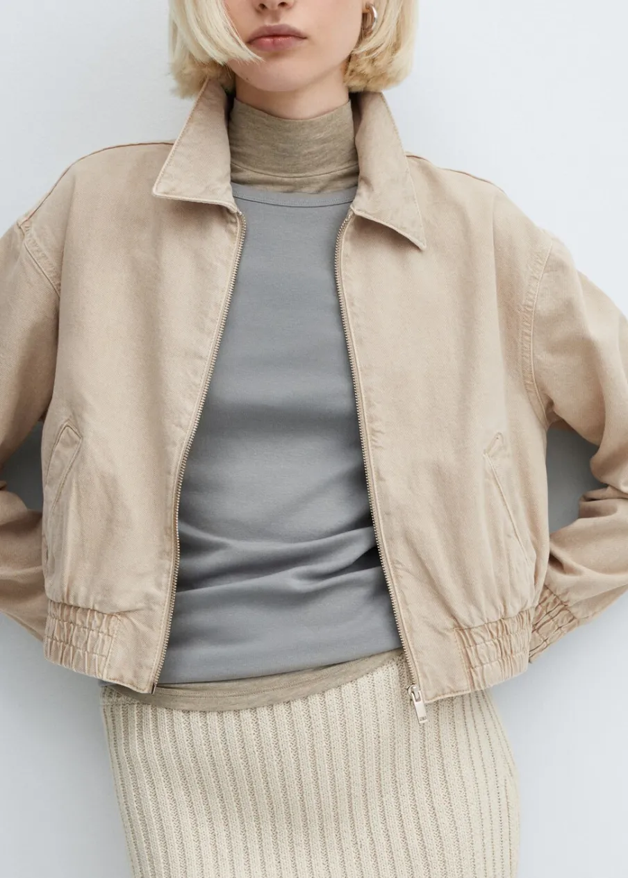 Tkanina bawełniana w dżinsowym stylu. Model bomber. Koszulowy kołnierz. Długi rękaw z elastycznymi mankietami. Dwie kieszenie boczne. Elastyczny pas. Zapięcie z przodu na suwak.