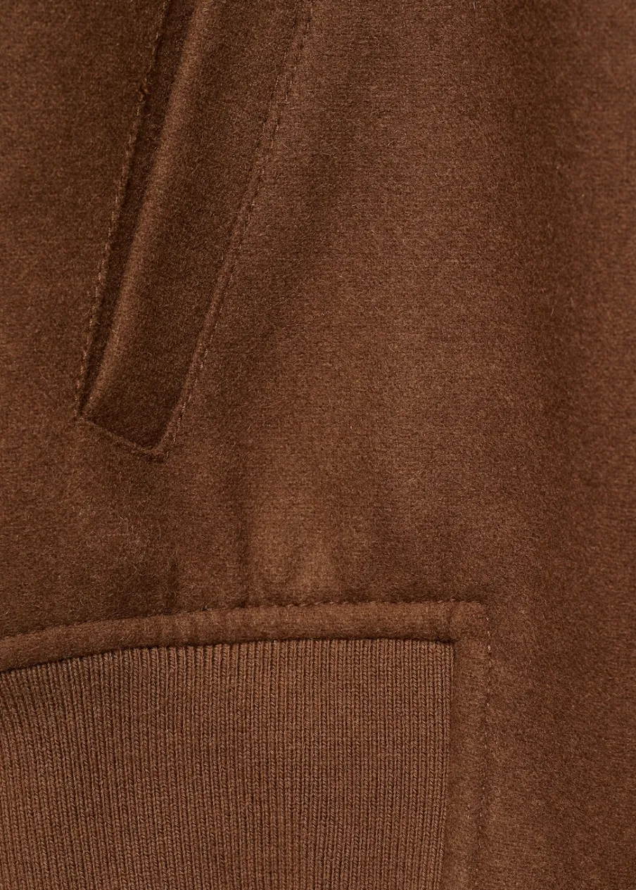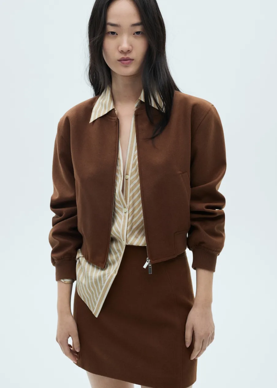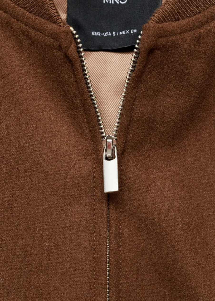 Model bomber. Długi rękaw z elastycznymi mankietami. Zapięcie z przodu na suwak. Wewnętrzna podszewka. Total look. Modelka ma 175 cm wzrostu i nosi rozmiar S/36. Model prosty. Tkanina mieszanka wełny. Kieszenie boczne. Okrągły dekolt.
