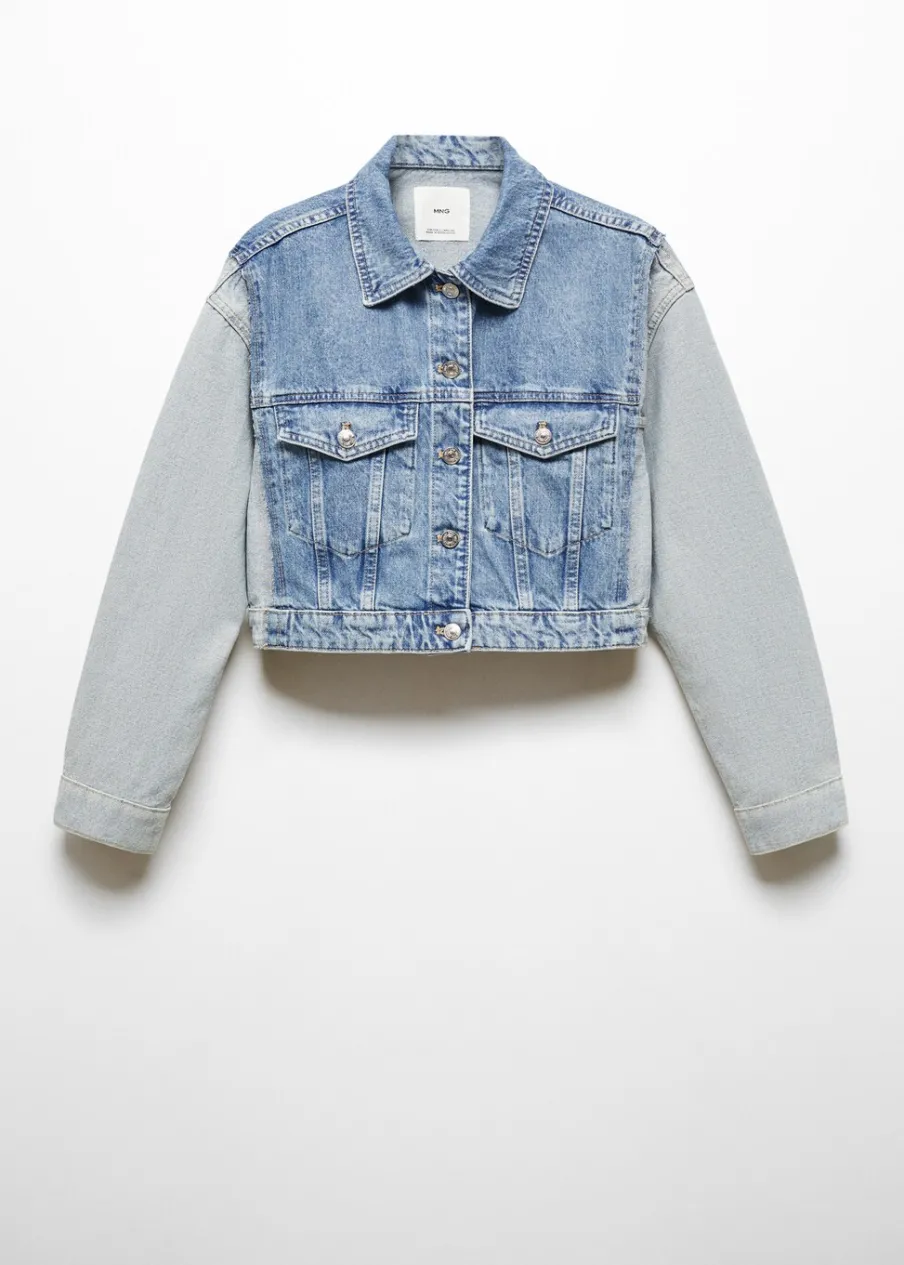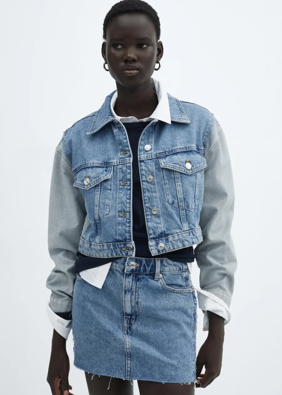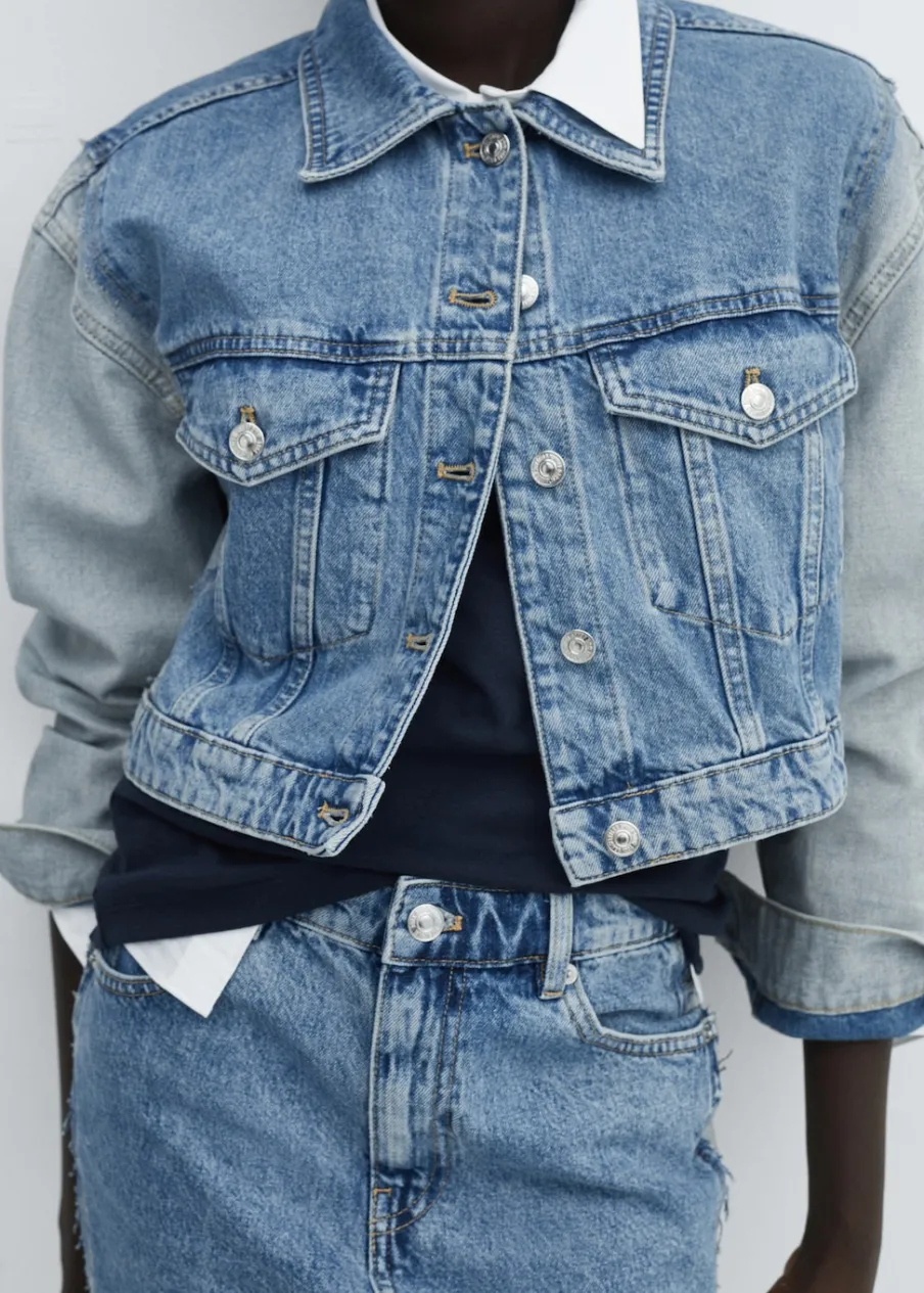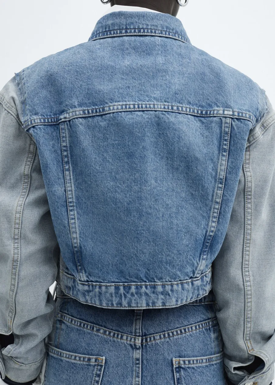 OpisTkanina bawełniana w dżinsowym stylu. Deseń crop. Dwukolorowy deseń. Model prosty. Koszulowy kołnierz. Długi r…