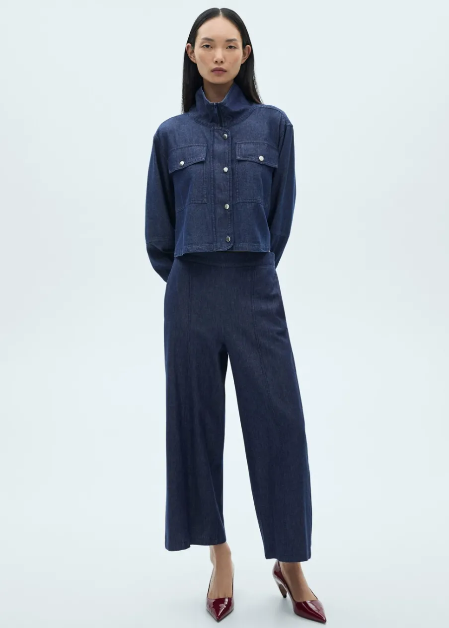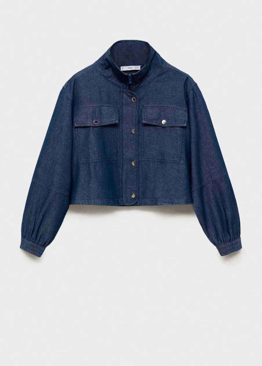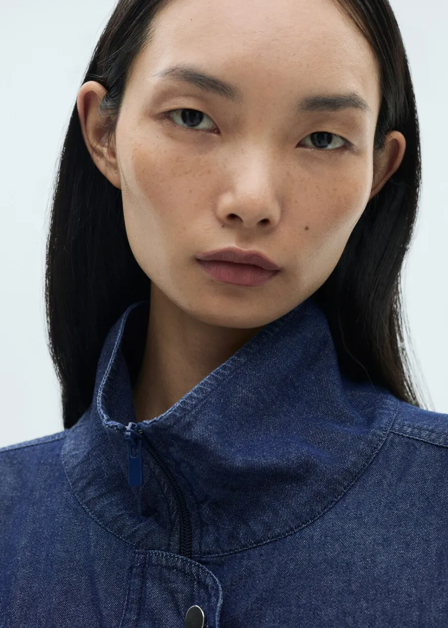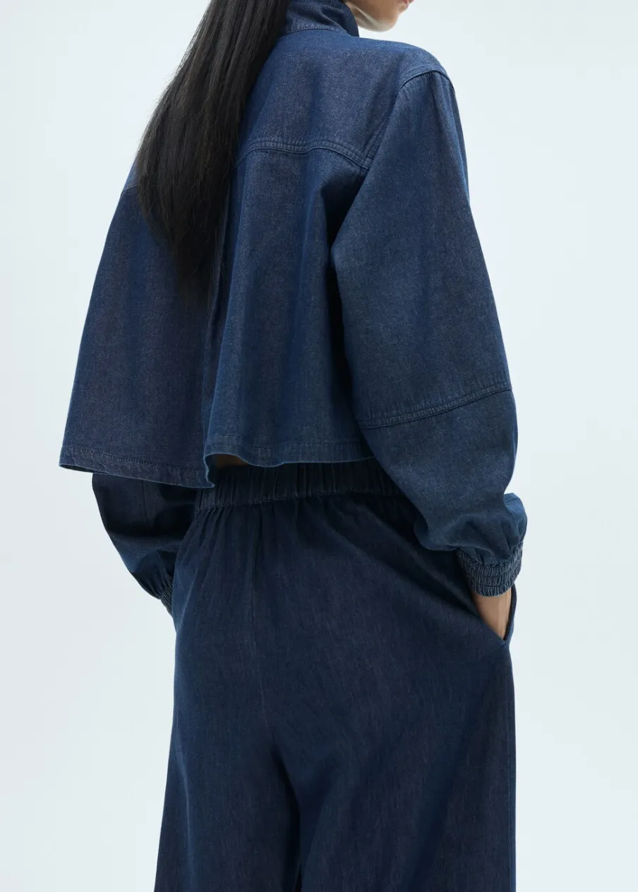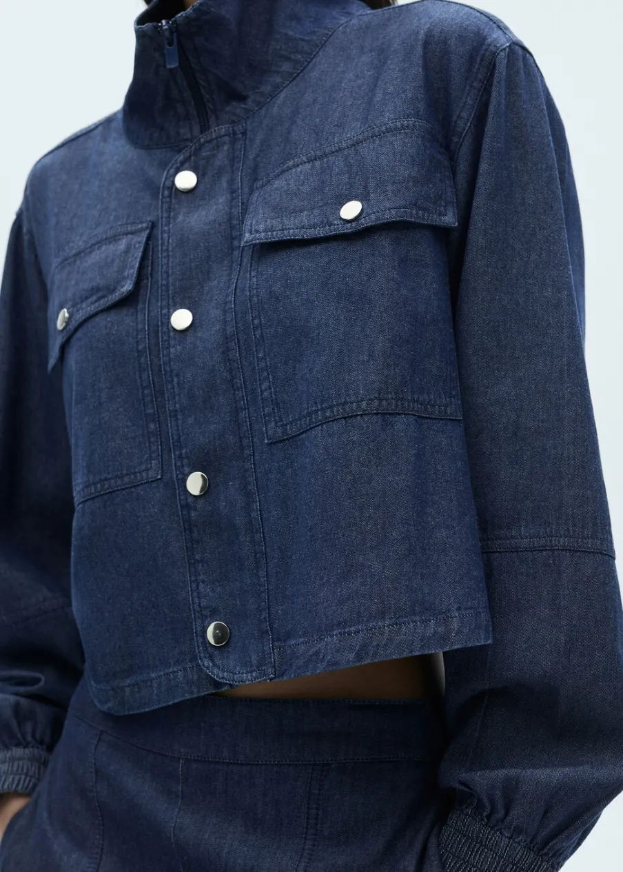 Bawełna 100%. Tkanina bawełniana w dżinsowym stylu. Krótki krój. Model prosty. Kominowy kołnierz. Długi rękaw. Elastyczne mankiety. Zapięcie z przodu. Dwie kieszenie naszyte na piersi. Bez podszewki.