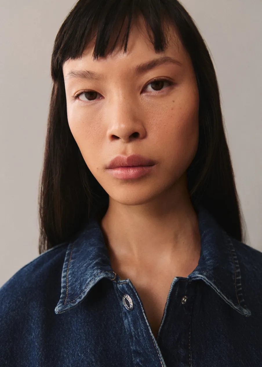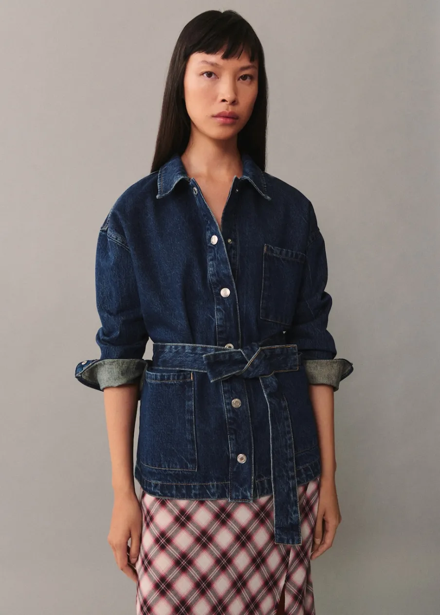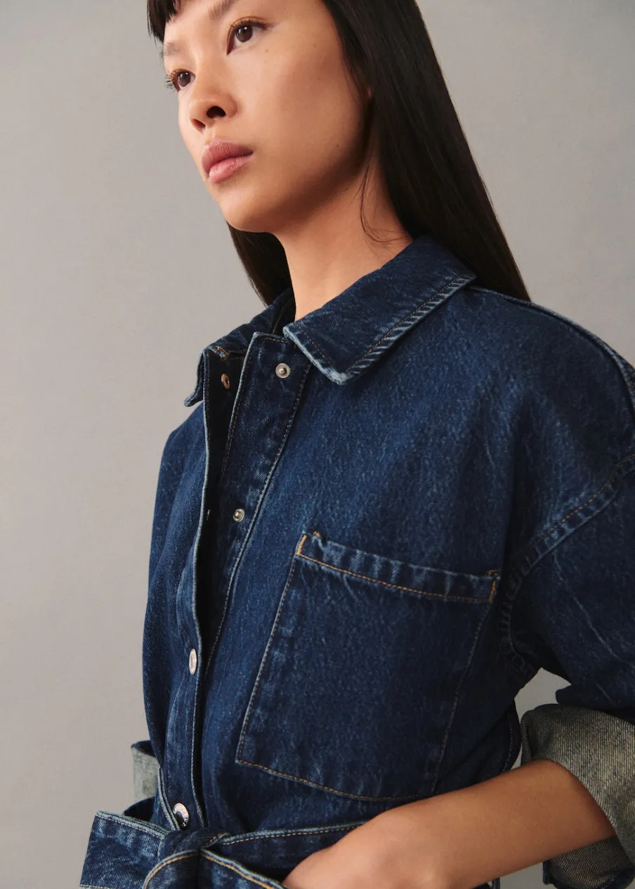 Tkanina bawełniana w dżinsowym stylu. Model prosty. Fason o średniej długości. Koszulowy kołnierz. Długi rękaw z guzikami na mankietach. Trzy kieszenie z przodu. Wiązanie z przodu. Modelka ma 177 cm wzrostu i nosi rozmiar S/36. Zapięcie na guziki z przodu.