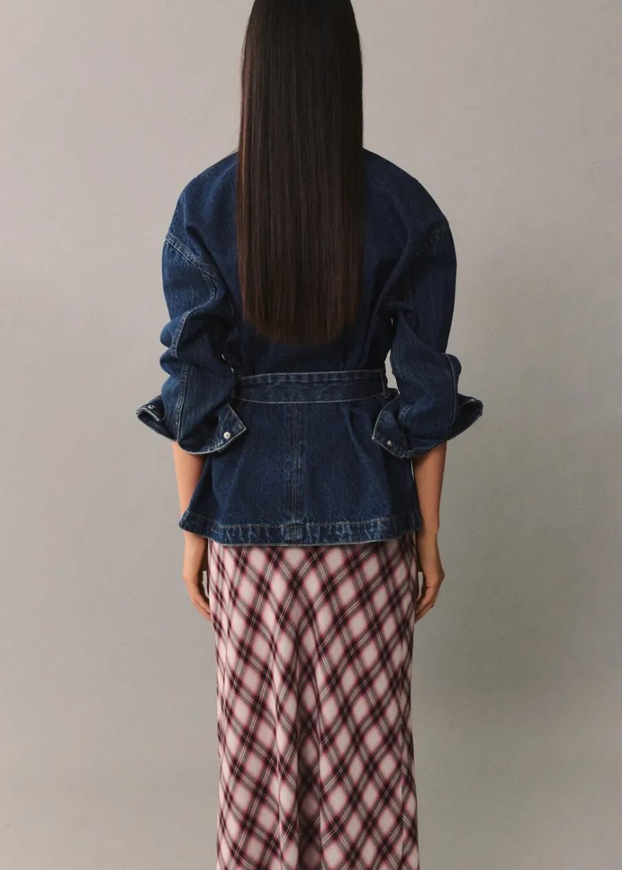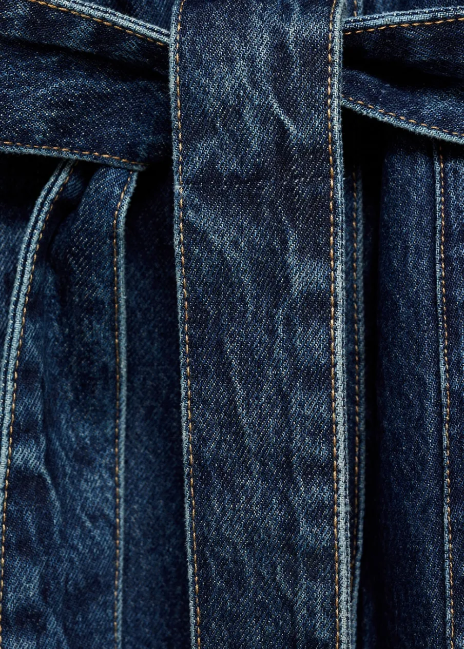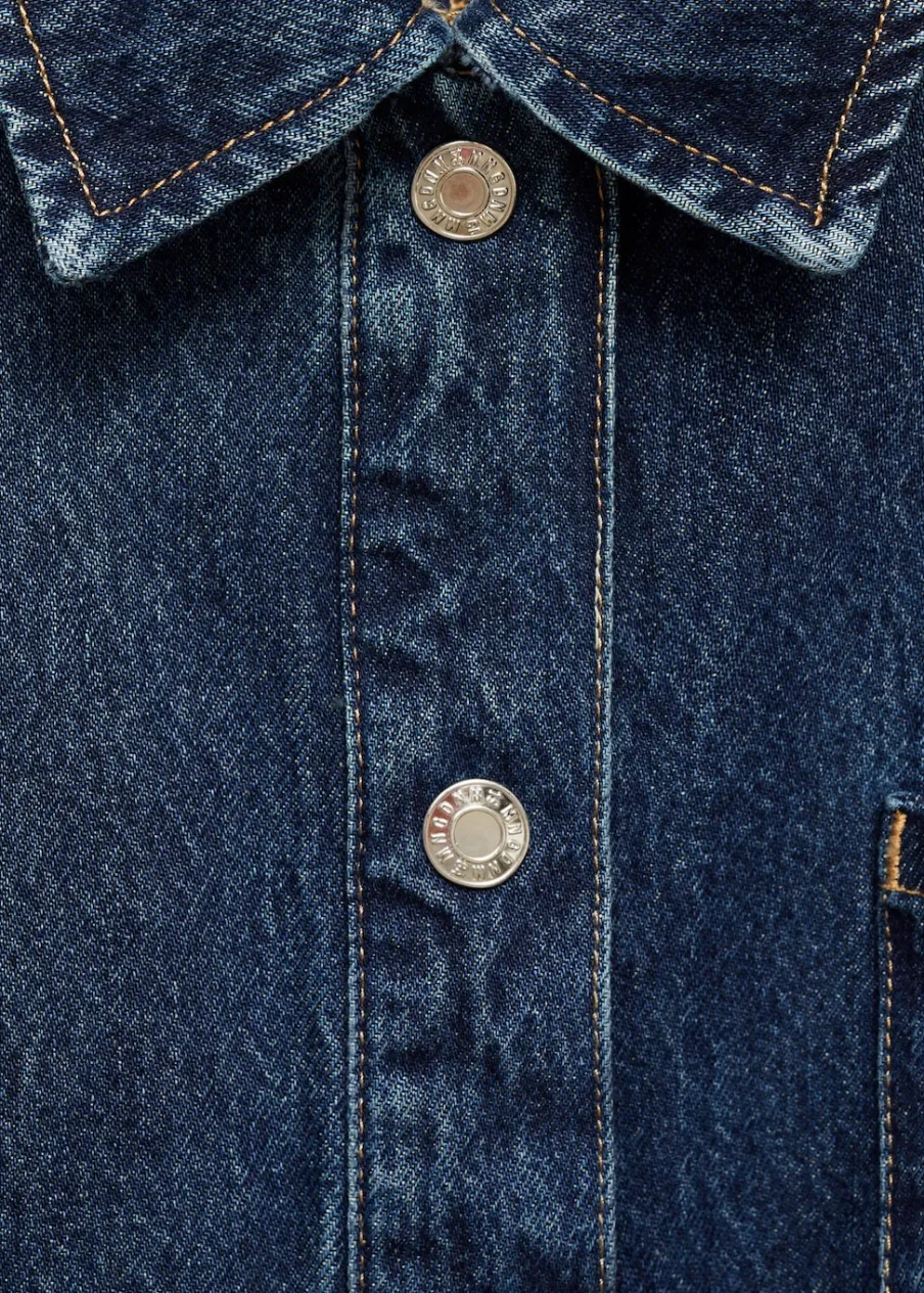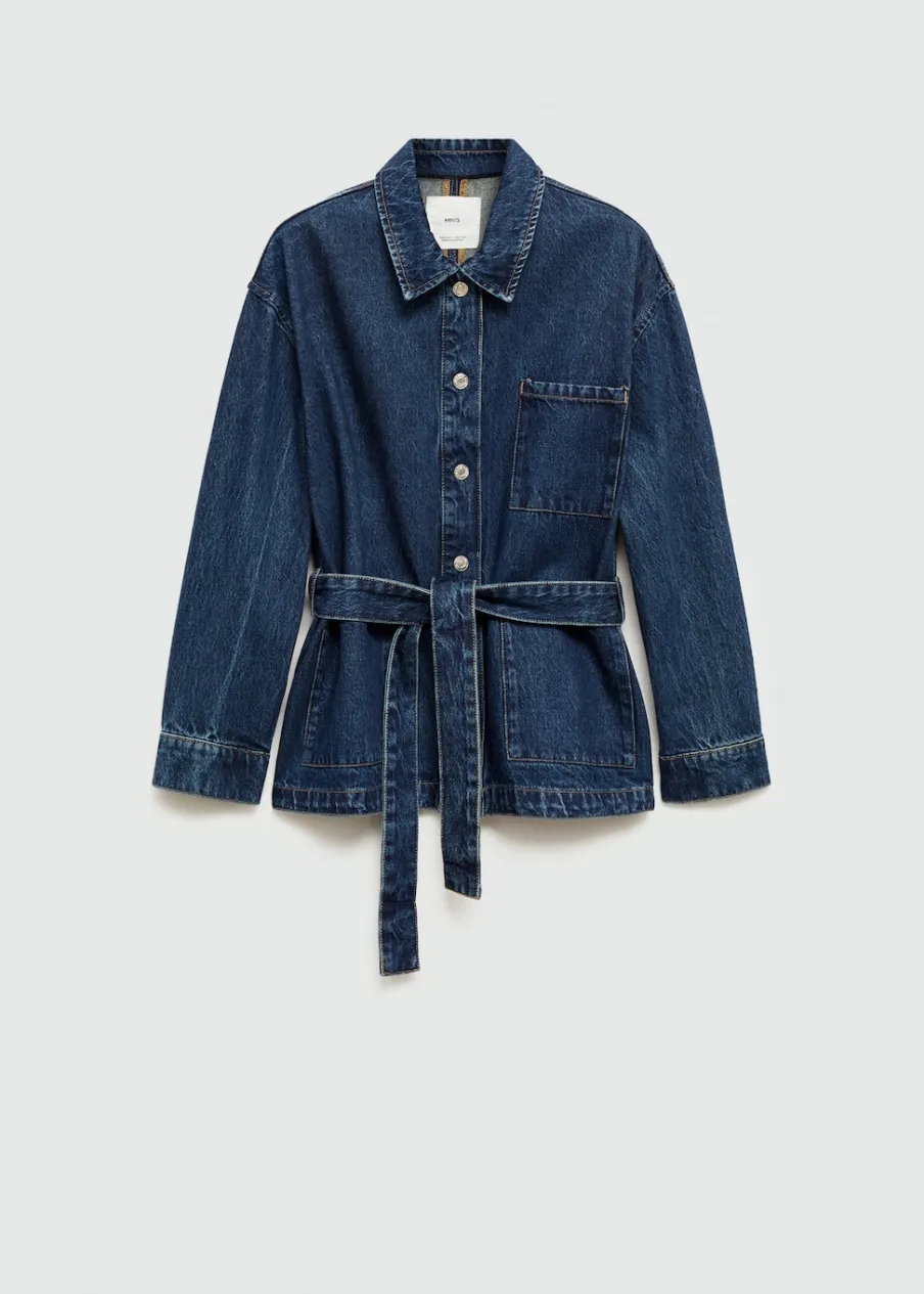 Tkanina bawełniana w dżinsowym stylu. Model prosty. Fason o średniej długości. Koszulowy kołnierz. Długi rękaw z guzikami na mankietach. Trzy kieszenie z przodu. Wiązanie z przodu. Modelka ma 177 cm wzrostu i nosi rozmiar S/36. Zapięcie na guziki z przodu.