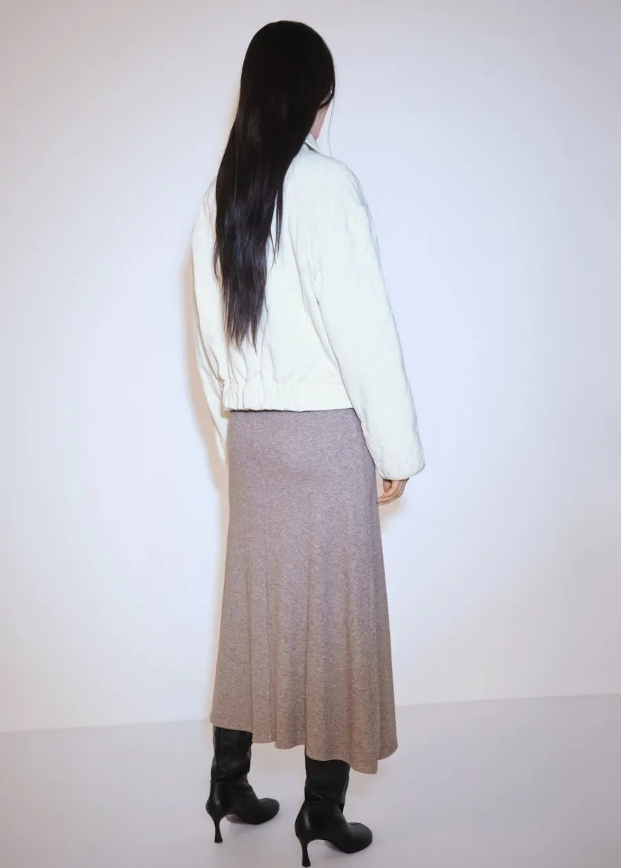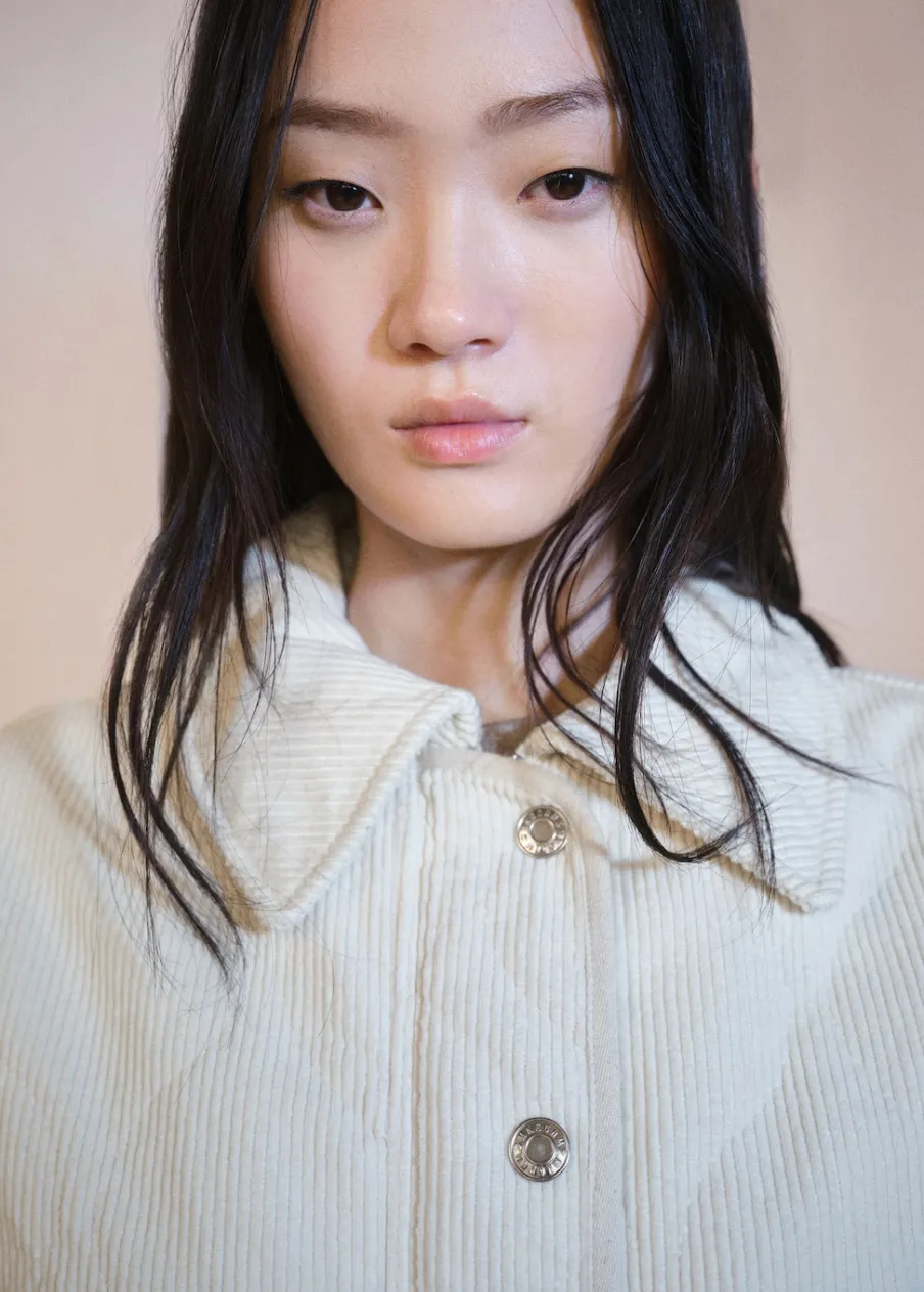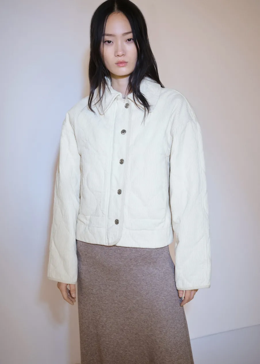 Model pikowany. Model bomber. Model oversize. Koszulowy kołnierz. Zapięcie z przodu na suwak. Modelka ma 175 cm wzrostu i nosi rozmiar S/36. Długi rękaw. Sztruksowa tkanina.