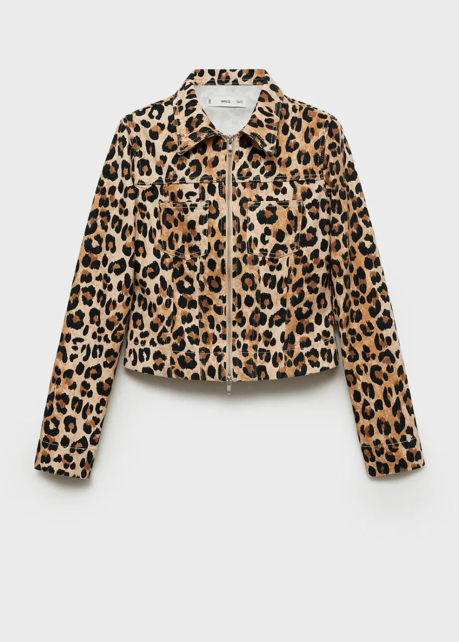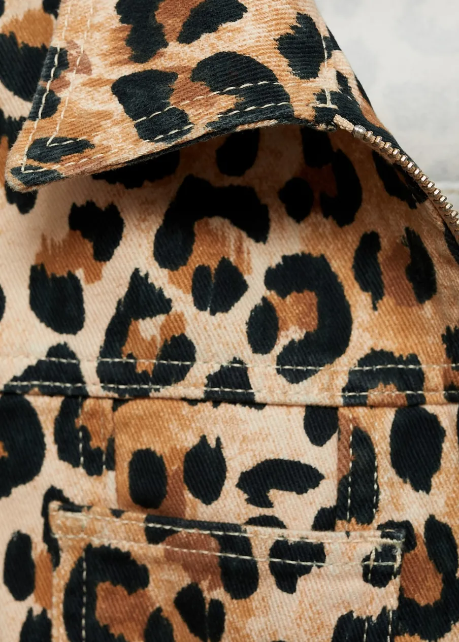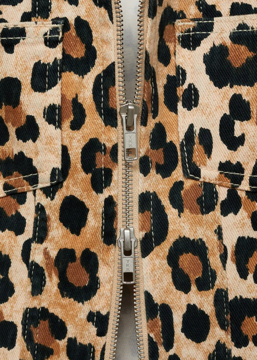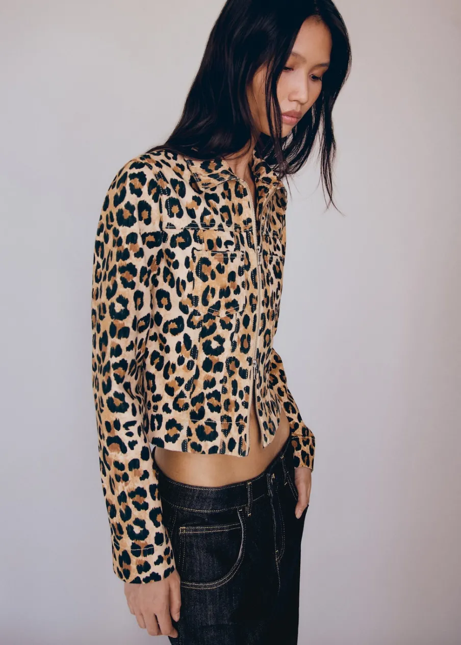 Tkanina bawełniana w dżinsowym stylu. Model prosty. Wzór w lamparcie cętki. Koszulowy kołnierz. Długi rękaw z zapięciem na guziki. Dwie kieszenie nakładane z przodu. Zapięcie na podwójny suwak. Modelka ma 178 cm wzrostu i nosi rozmiar S/36. Total look.