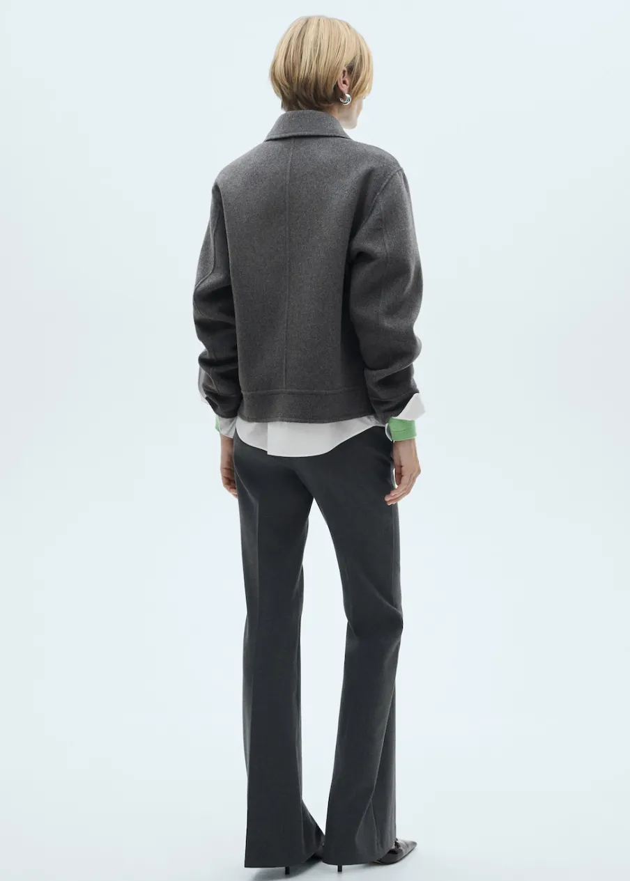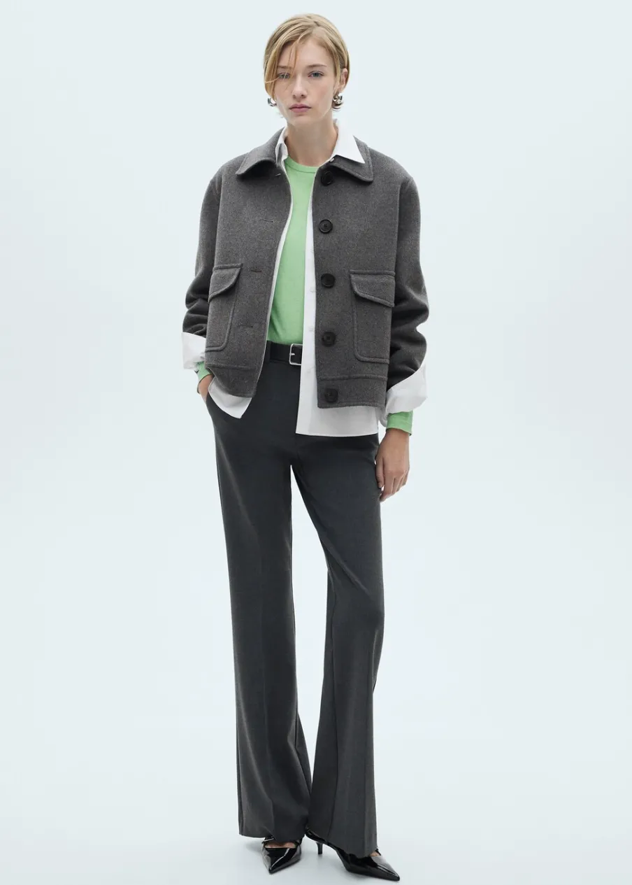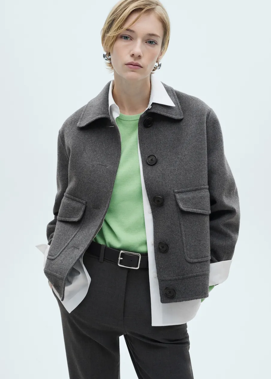 OpisTkanina mieszanka wełny. Model prosty. Koszulowy kołnierz. Długi rękaw. Dwie kieszenie z patkami z przodu. Model…