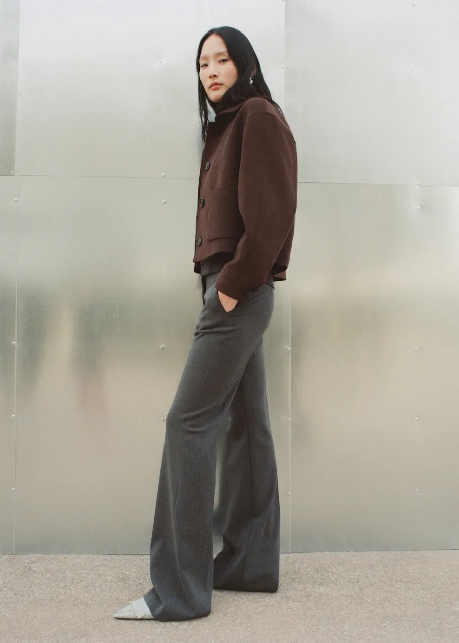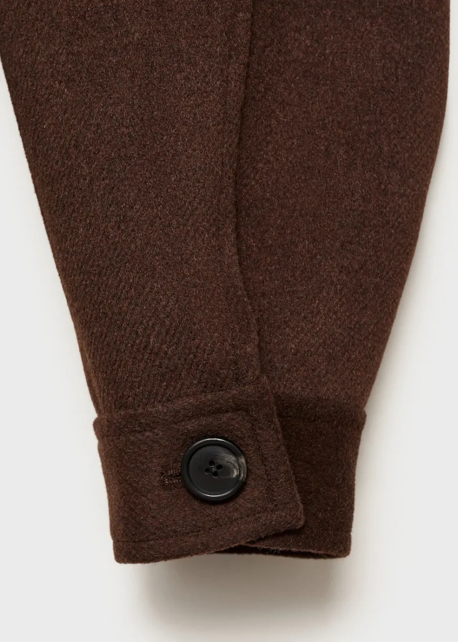 Tkanina mieszanka wełny. Krótki krój. Model prosty. Kołnierz z klapami. Długi rękaw. Mankiety z odpinanymi guzikami. Dwie kieszenie nakładane z przodu. Zapięcie z przodu na guziki. Wewnętrzna podszewka.