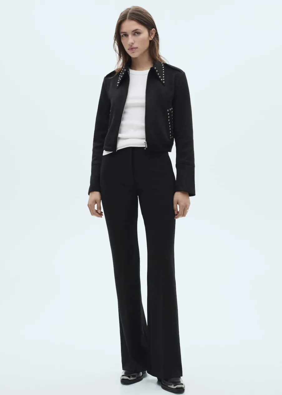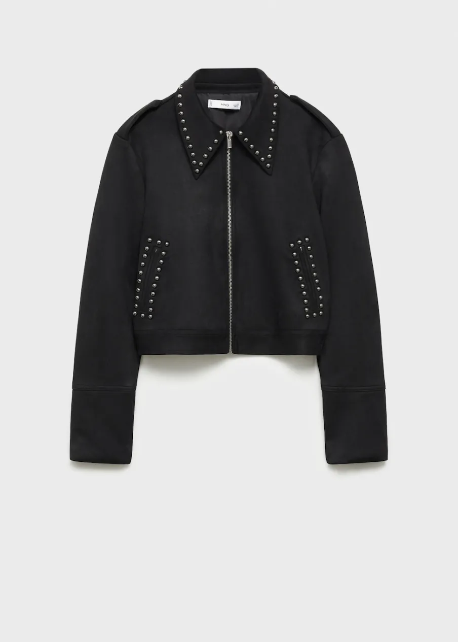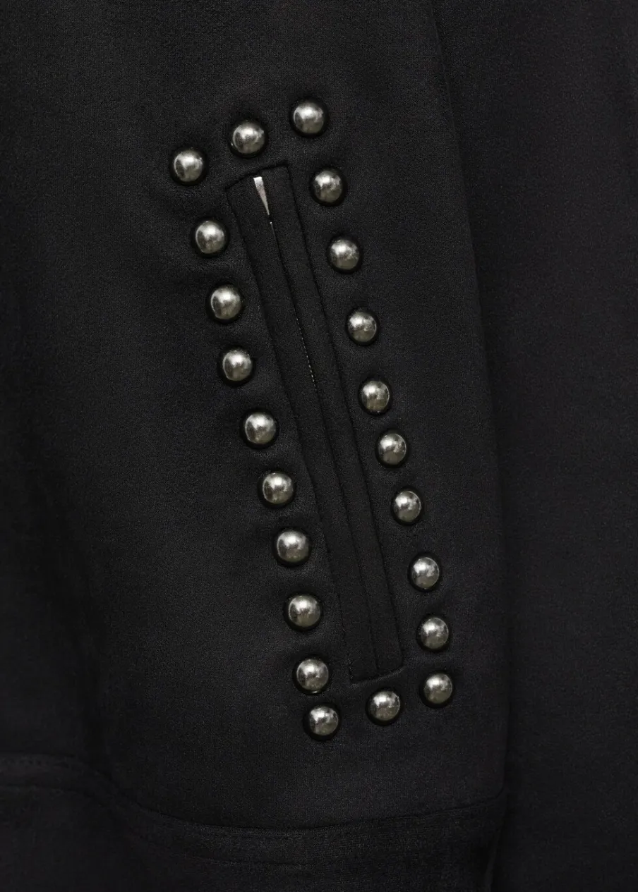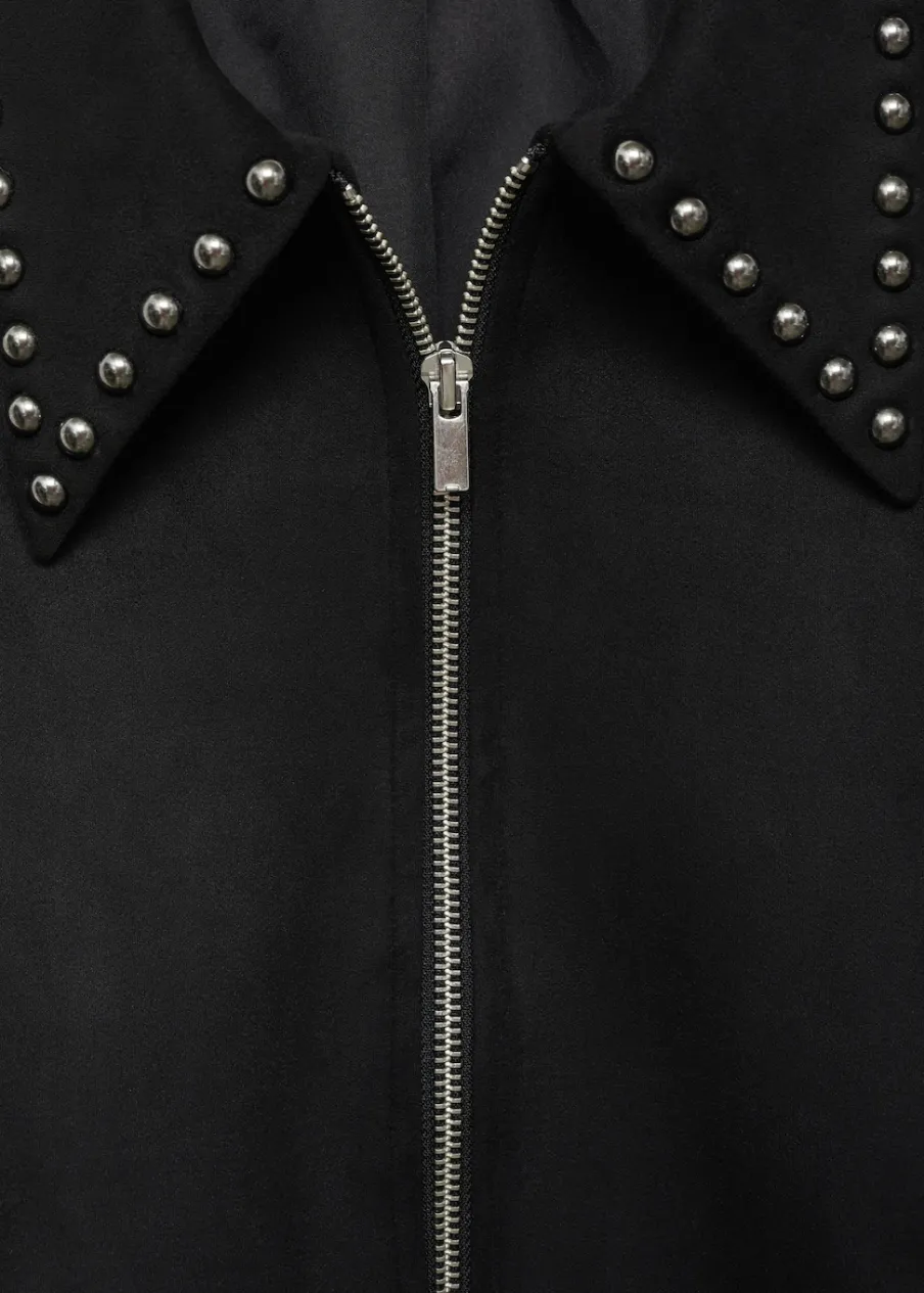 Model prosty. Koszulowy kołnierz. Długi rękaw. Kieszenie boczne. Detal z ćwiekami. Zapięcie z przodu na suwak.