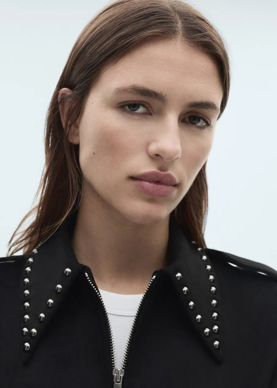 OpisModel prosty. Koszulowy kołnierz. Długi rękaw. Kieszenie boczne. Detal z ćwiekami. Zapięcie z przodu na suwak.