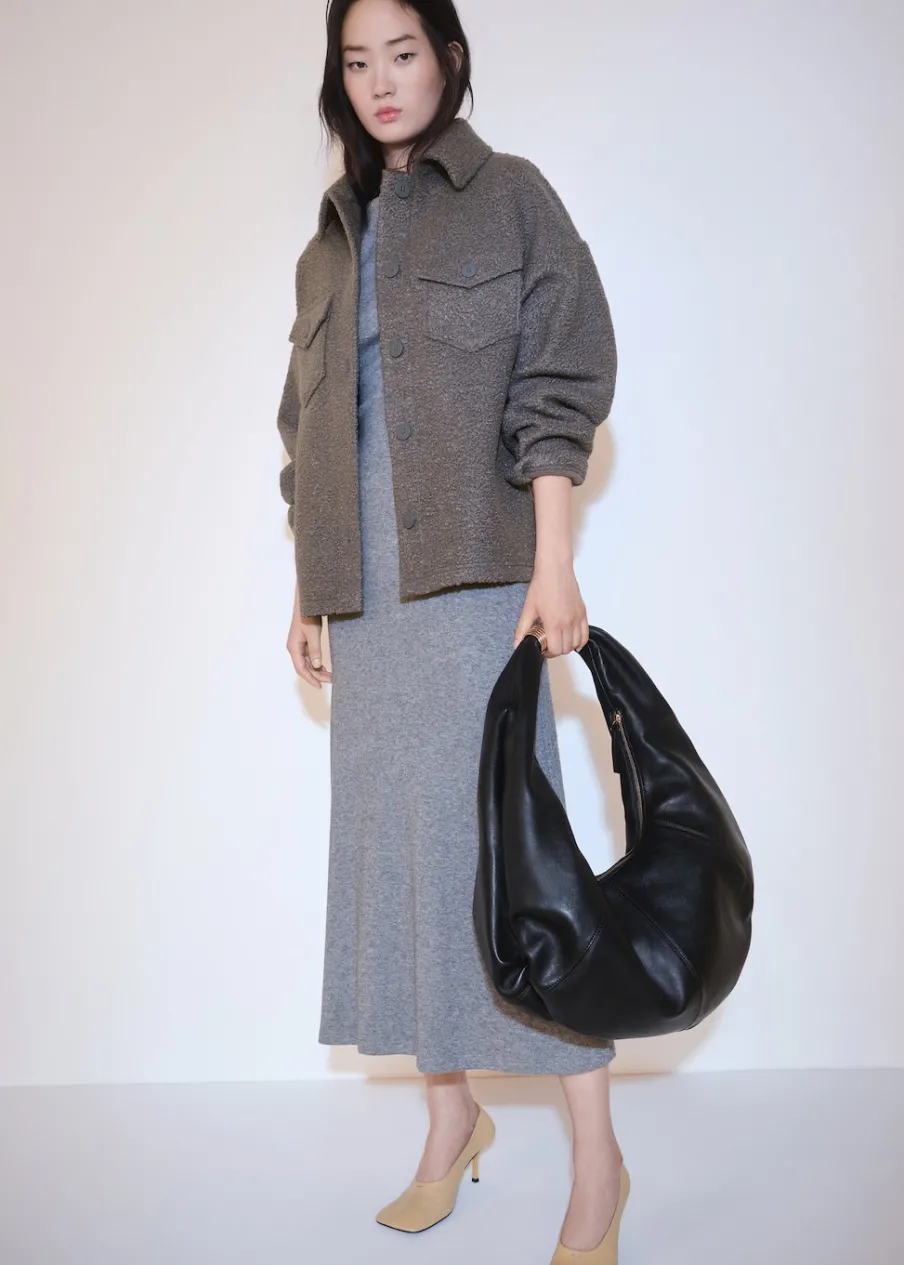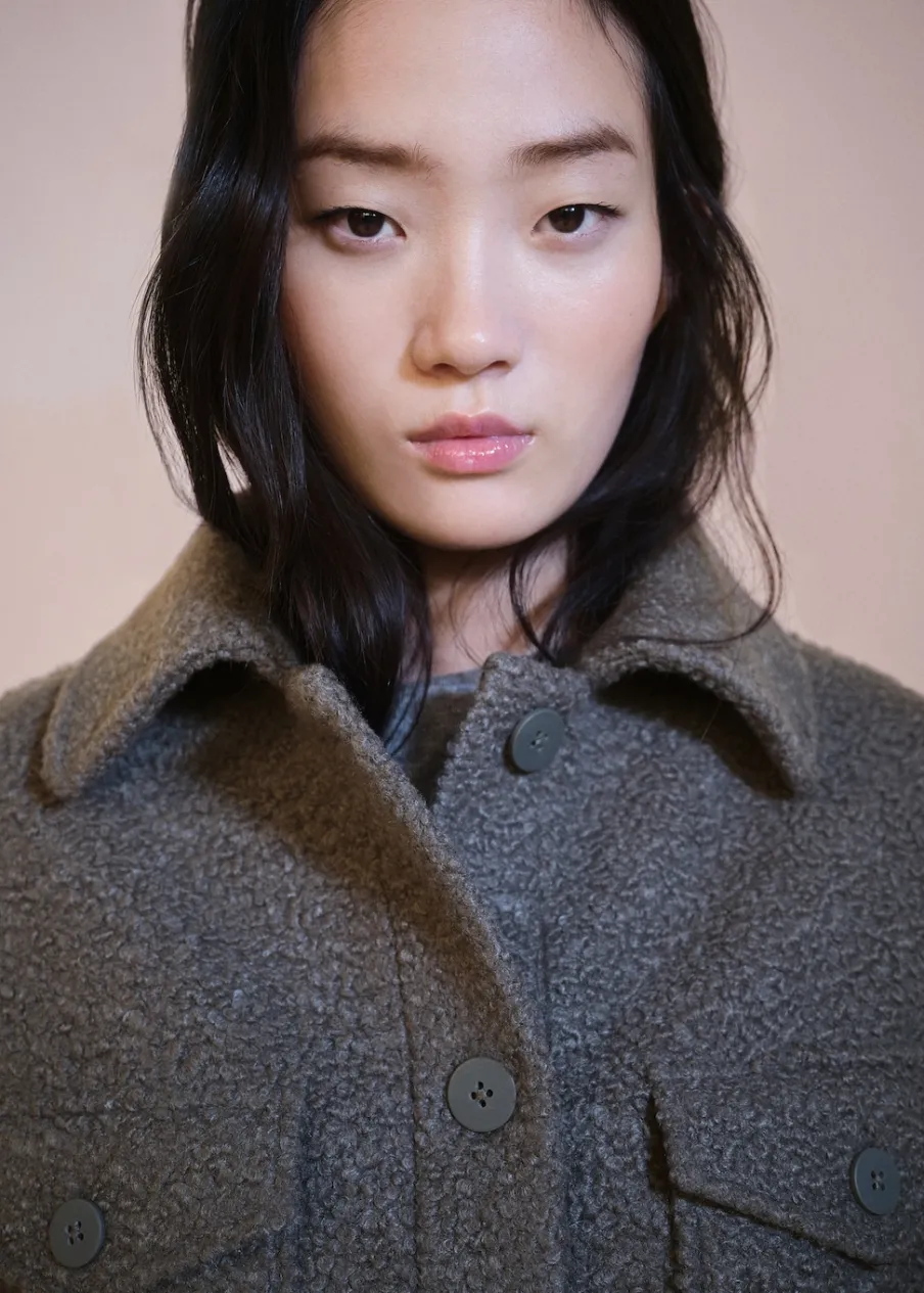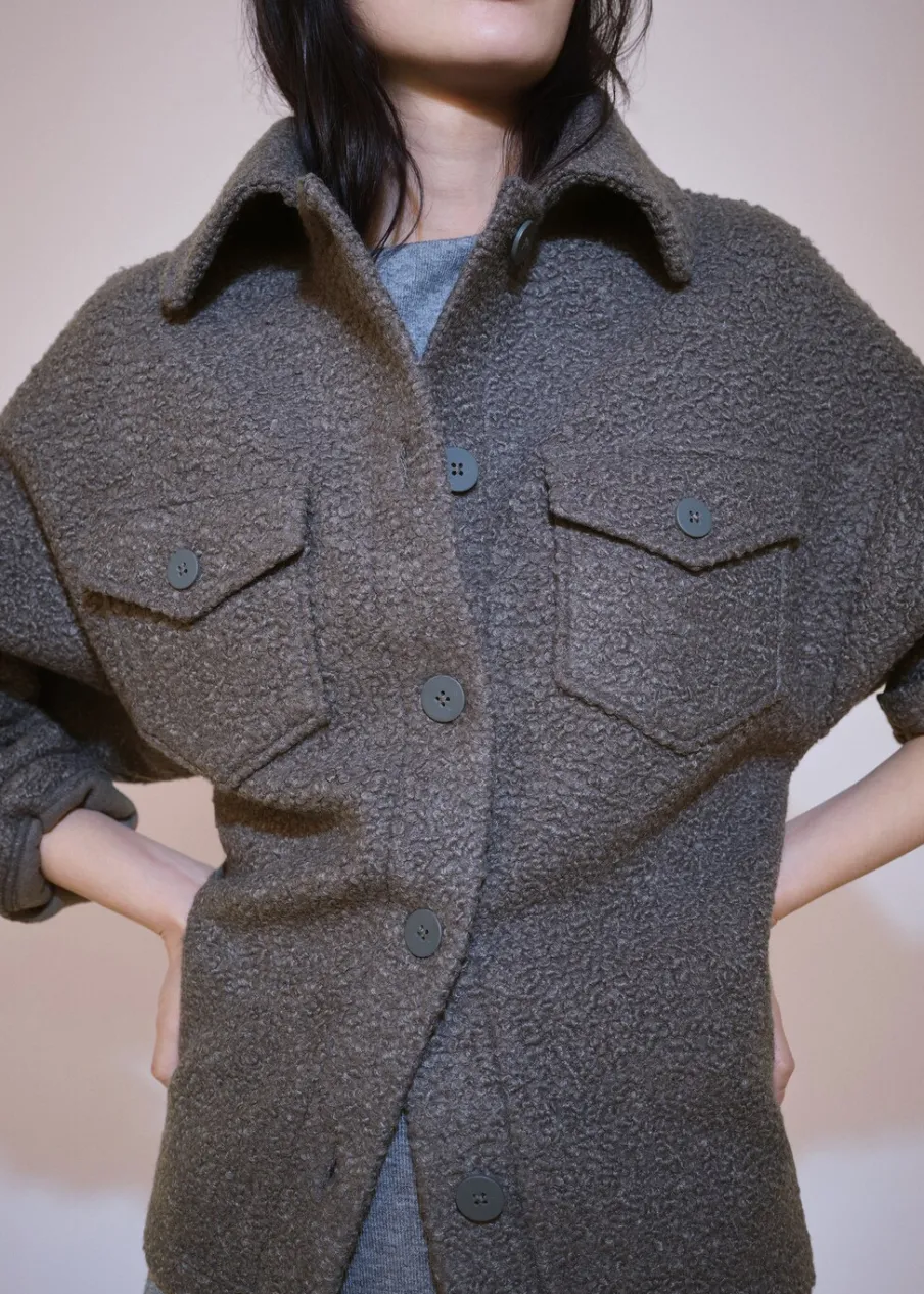 Tkanina bouclé. Model prosty. Koszulowy kołnierz. Długi rękaw. Zapięcie z przodu na guziki. Dwie przednie kieszenie z patką i guzikiem. Bez podszewki. Modelka ma 178 cm wzrostu i nosi rozmiar S/36.