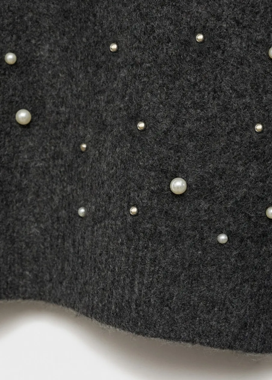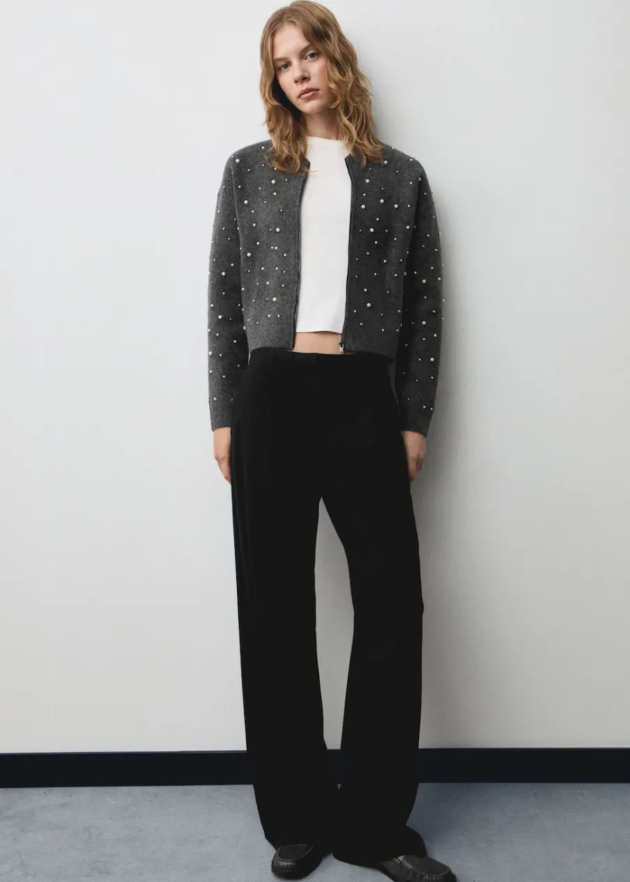Dzianinowa tkanina. Model prosty. Okrągły dekolt. Długi rękaw. Perełkowa ozdoba. Zapięcie z przodu na suwak. Modelka ma 179 cm wzrostu i nosi rozmiar S/36. Kolekcja wizytowa.