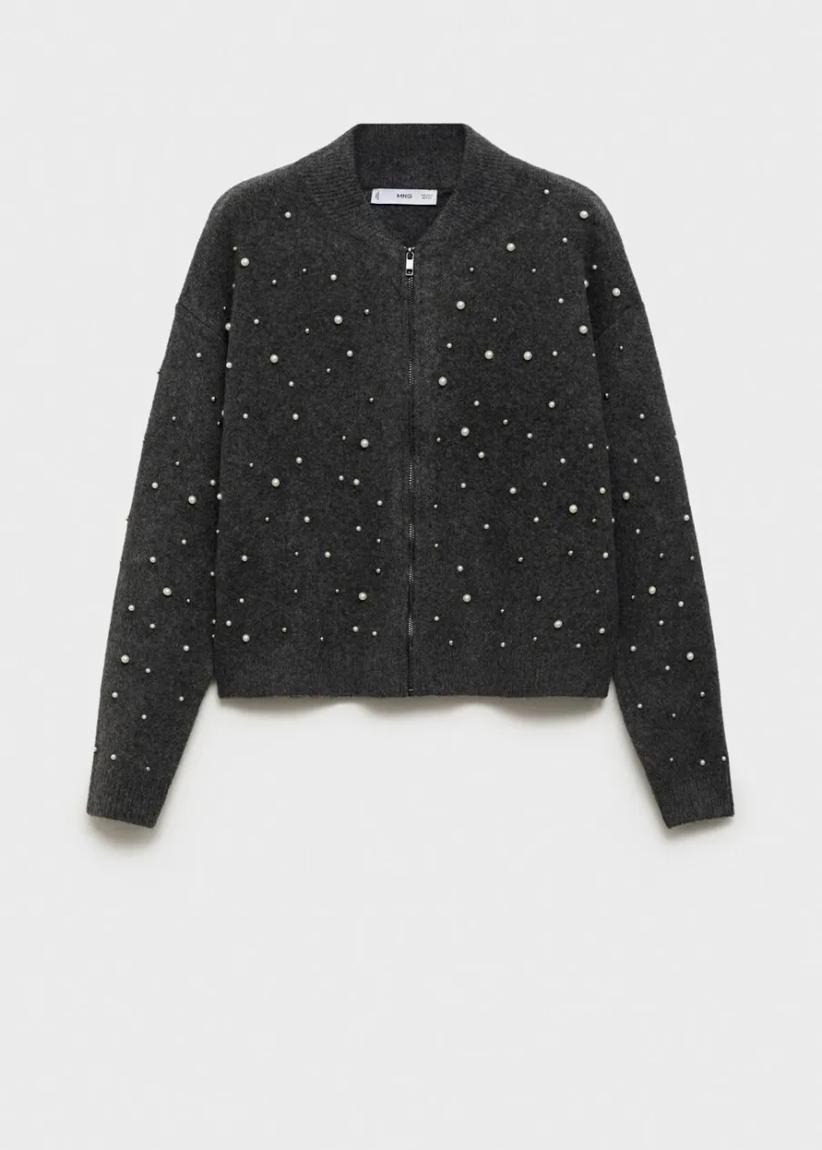 OpisDzianinowa tkanina. Model prosty. Okrągły dekolt. Długi rękaw. Perełkowa ozdoba. Zapięcie z przodu na suwak. M…