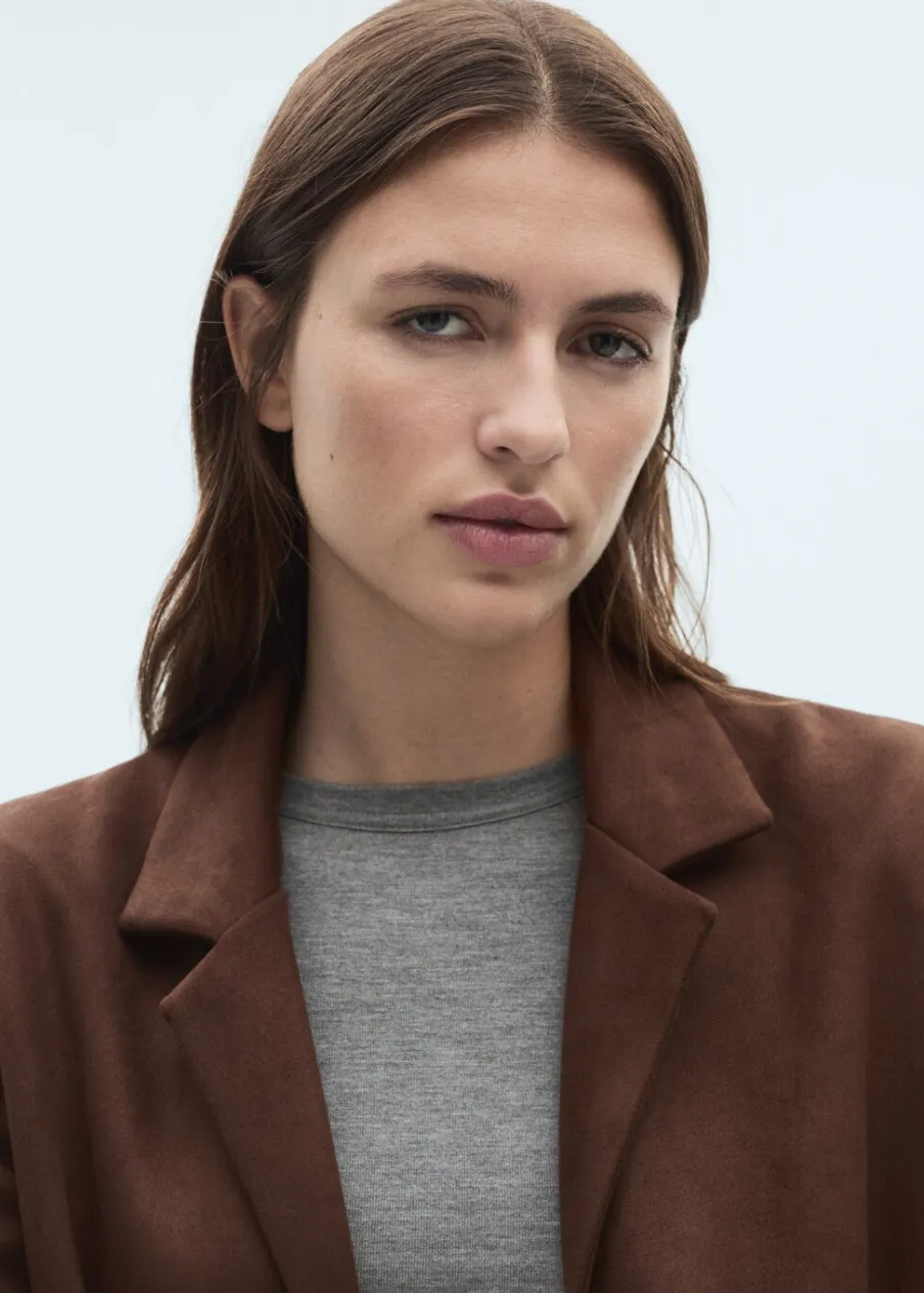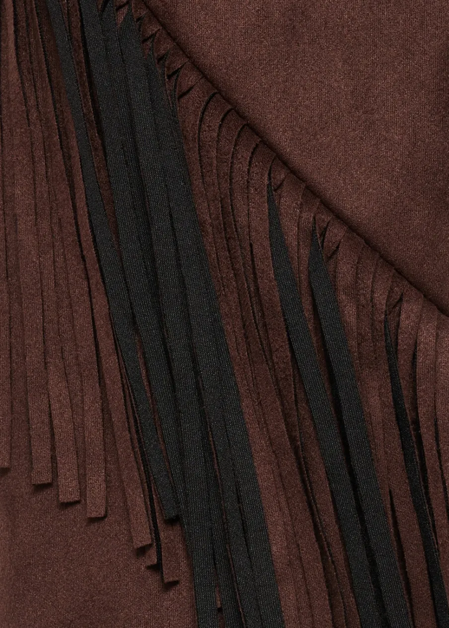 Imitacja zamszu. Model prosty. Dekolt w szpic z kołnierzykiem. Długi rękaw. Detal z frędzli. Bez zapięcia. Wewnętrzna podszewka. Modelka ma 178 cm wzrostu i nosi rozmiar S/36. Total look.