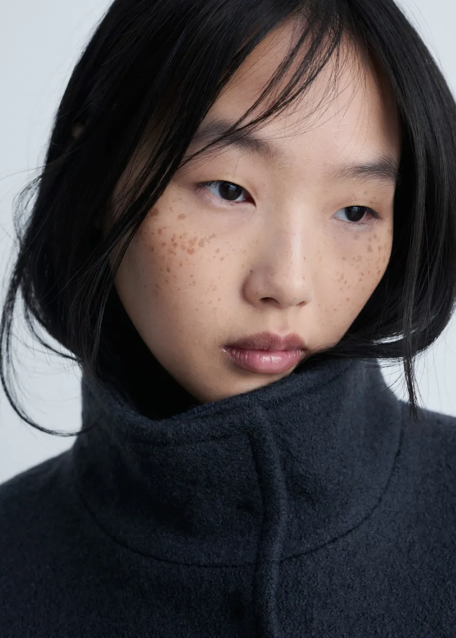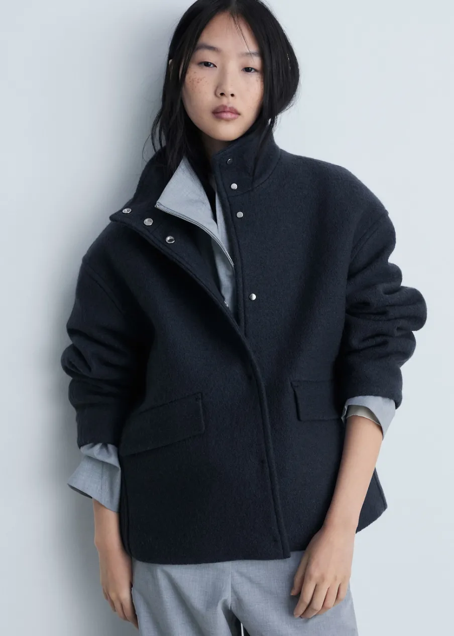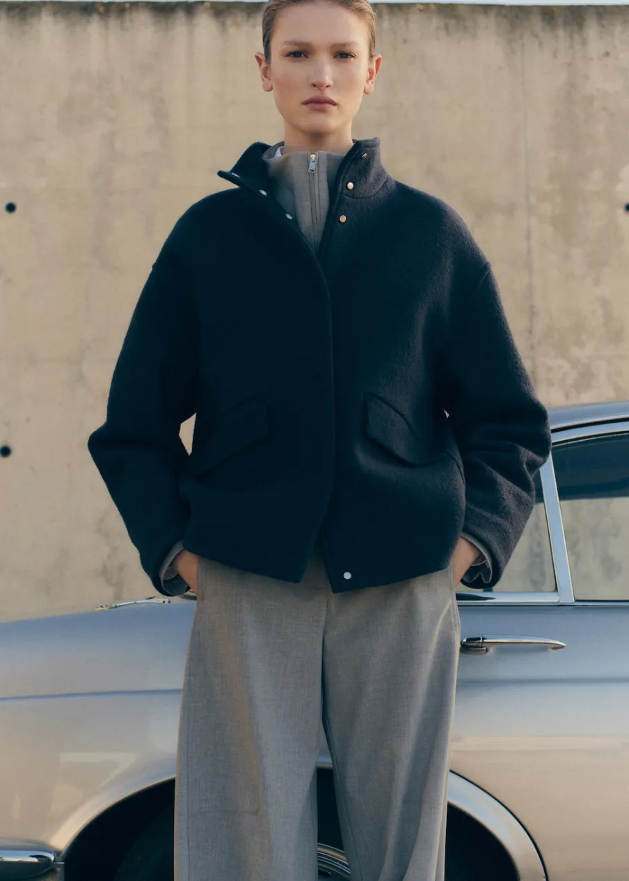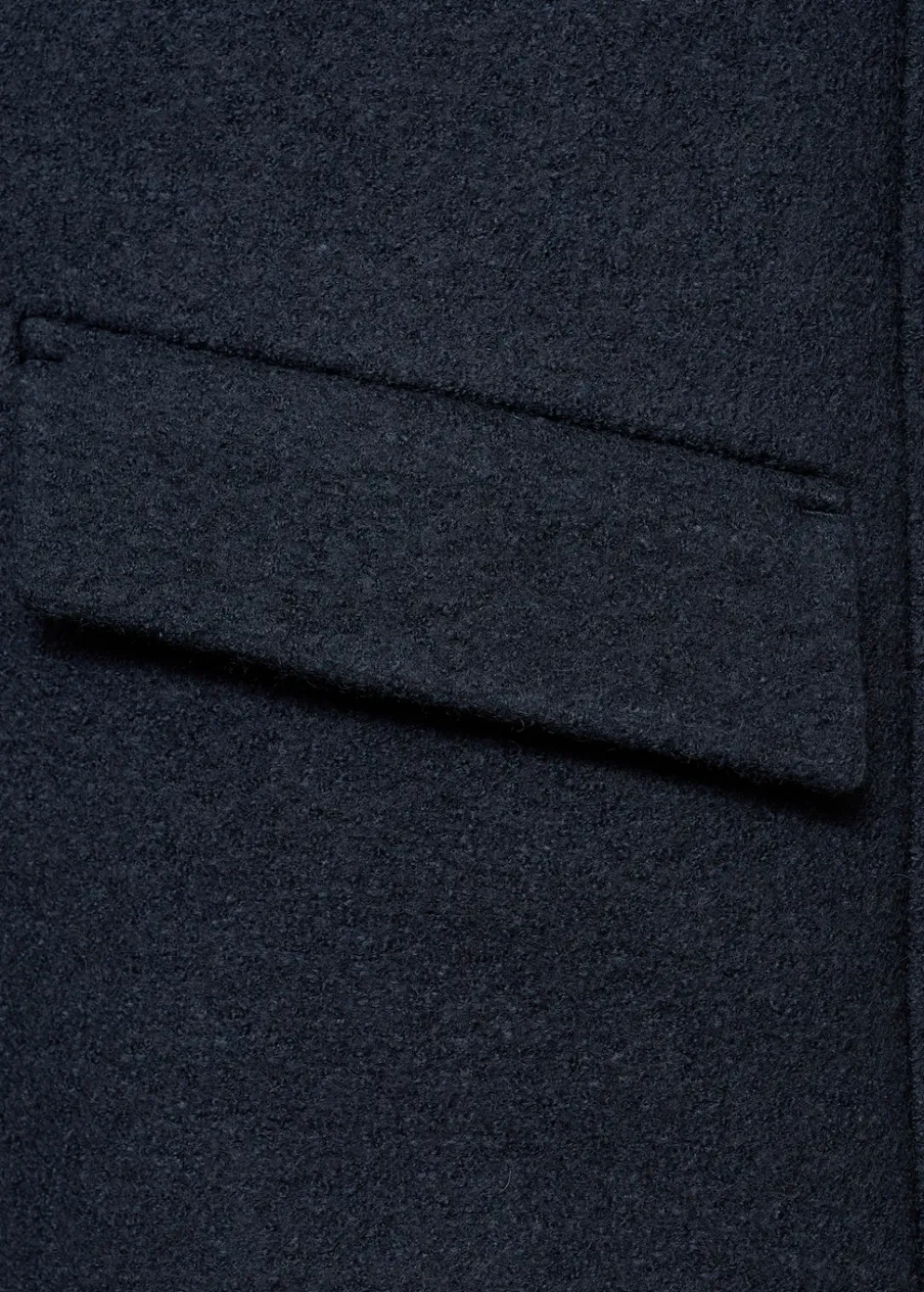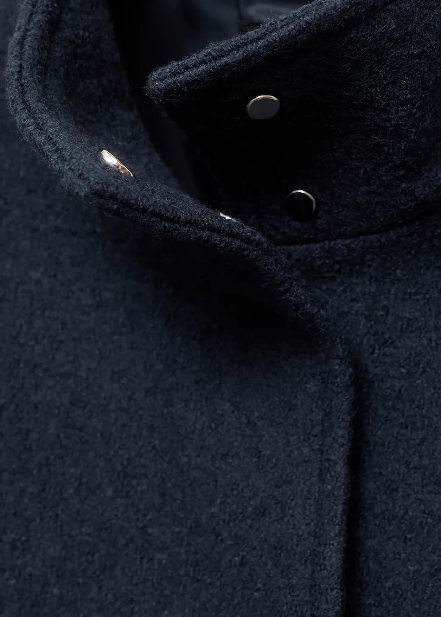 Tkanina mieszanka wełny. Model prosty. Golf. Długi rękaw. Dwie kieszenie z patką z przodu. Kryte zapięcie na guziki z przodu. Wewnętrzna podszewka.