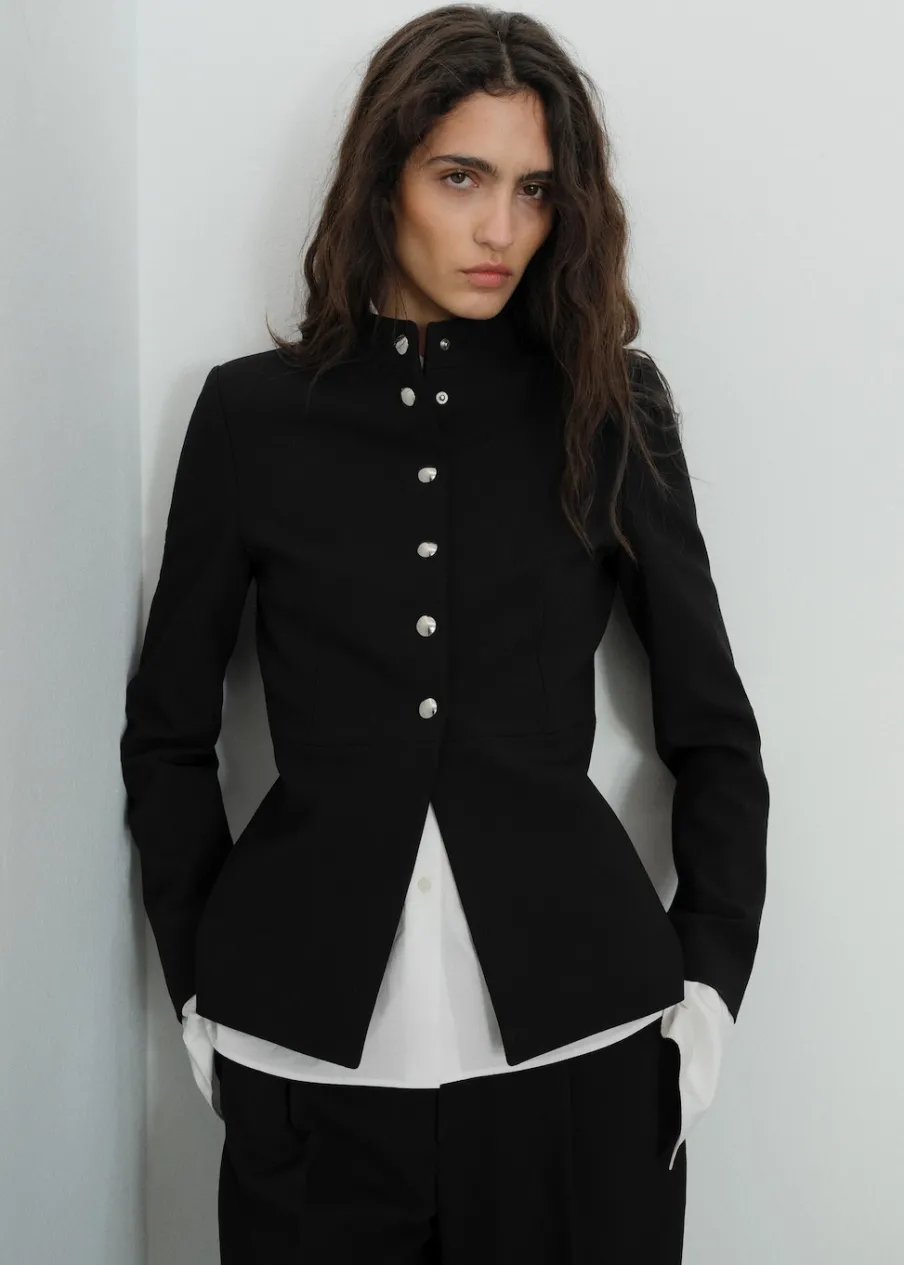 OpisModel wcięty. Krój do kolan. Dekolt z listwą. Długi rękaw z guzikami na mankietach. Zapięcie z przodu na guzik…