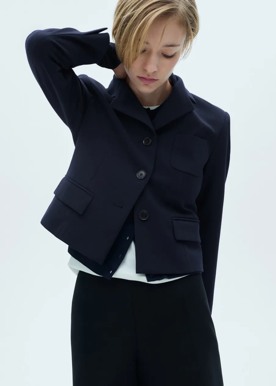 Model prosty. Deseń crop. Dekolt w szpic z kołnierzykiem. Klapy z nacięciem. Długi rękaw z guzikami na mankietach. Dwie kieszenie z patkami z przodu. Kieszeń nakładana na piersi. Wewnętrzna podszewka. Modelka ma 181 cm wzrostu i nosi rozmiar S/36. Zapięcie na guziki z przodu.