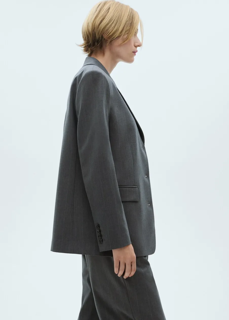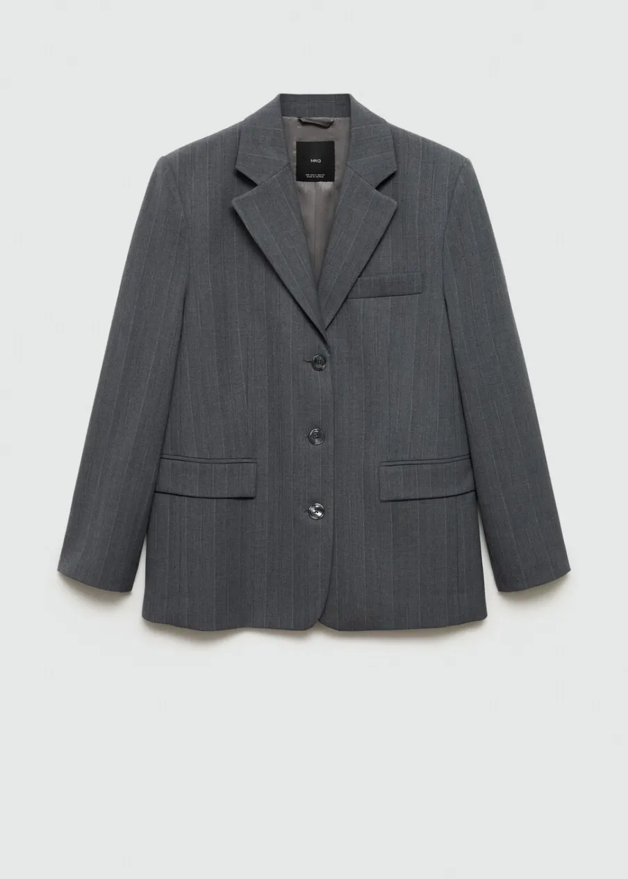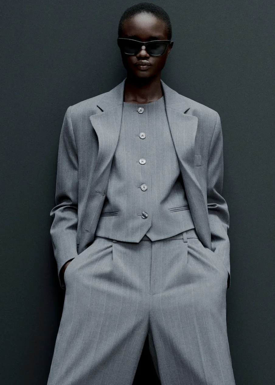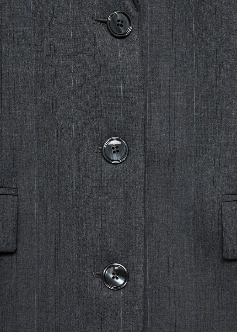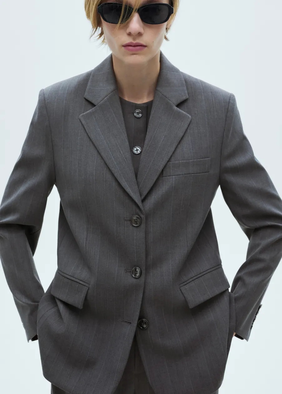 Wzór w prążki. Fason garniturowy. Model prosty. Dekolt w szpic z kołnierzykiem. Klapy z nacięciem. Długi rękaw z guzikami na mankietach. Poduszki na ramionach. Kieszeń wpuszczana na piersi. Dwie kieszenie z patkami z przodu. Zapięcie z przodu na guziki. Wewnętrzna podszewka. Total look. Dostępne w Plus Size. Modelka ma 181 cm wzrostu i nosi rozmiar S/36.