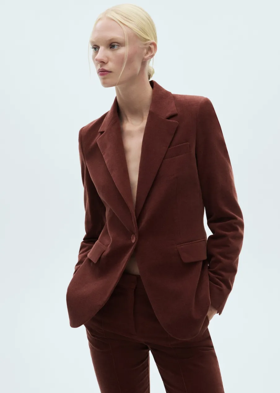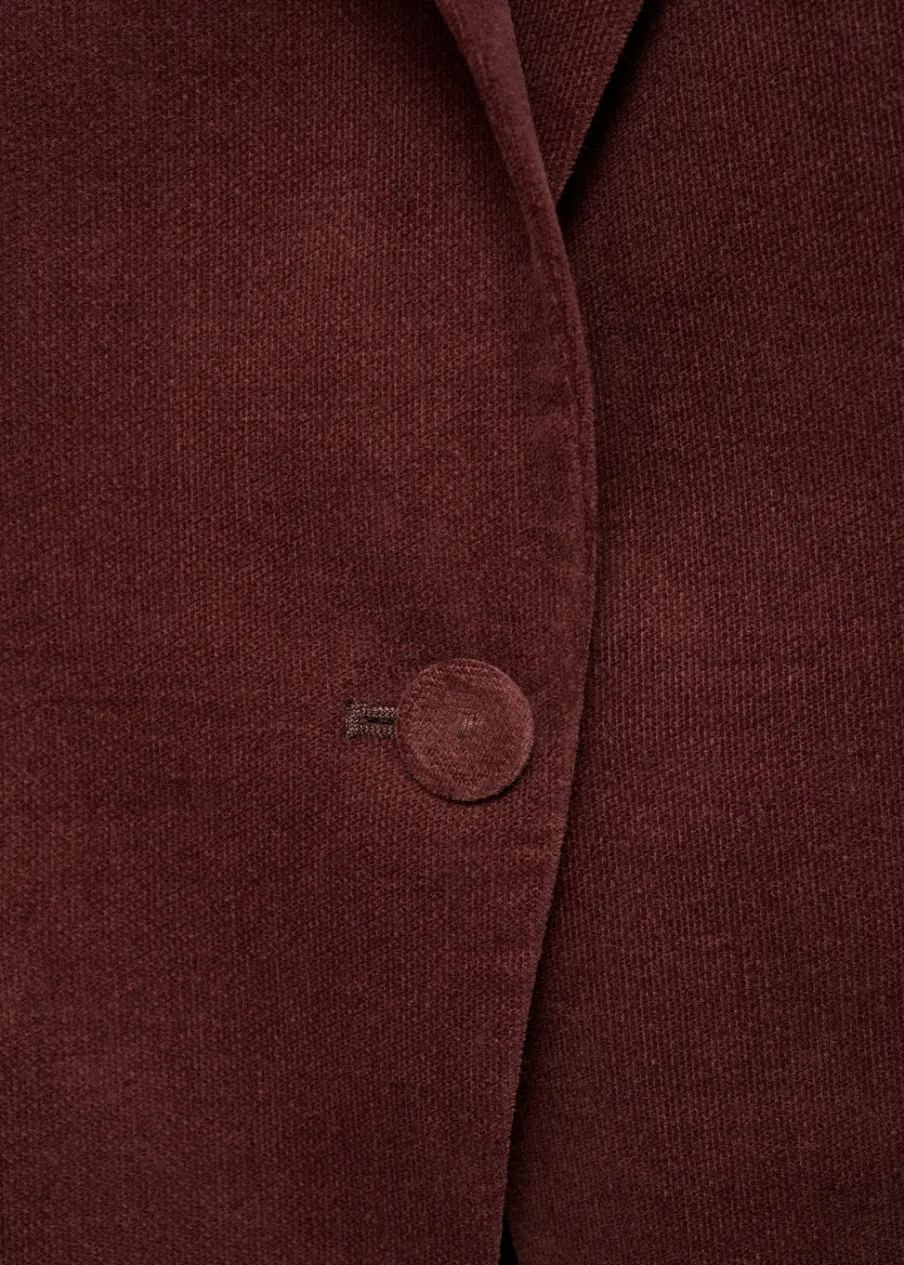 Aksamitna tkanina. Tkanina z 100% bawełny. Model prosty. Dekolt w szpic z kołnierzykiem. Długi rękaw z zapięciem na guziki. Zapięcie z przodu na guzik. Wewnętrzna podszewka. Total look. Kolekcja wizytowa.