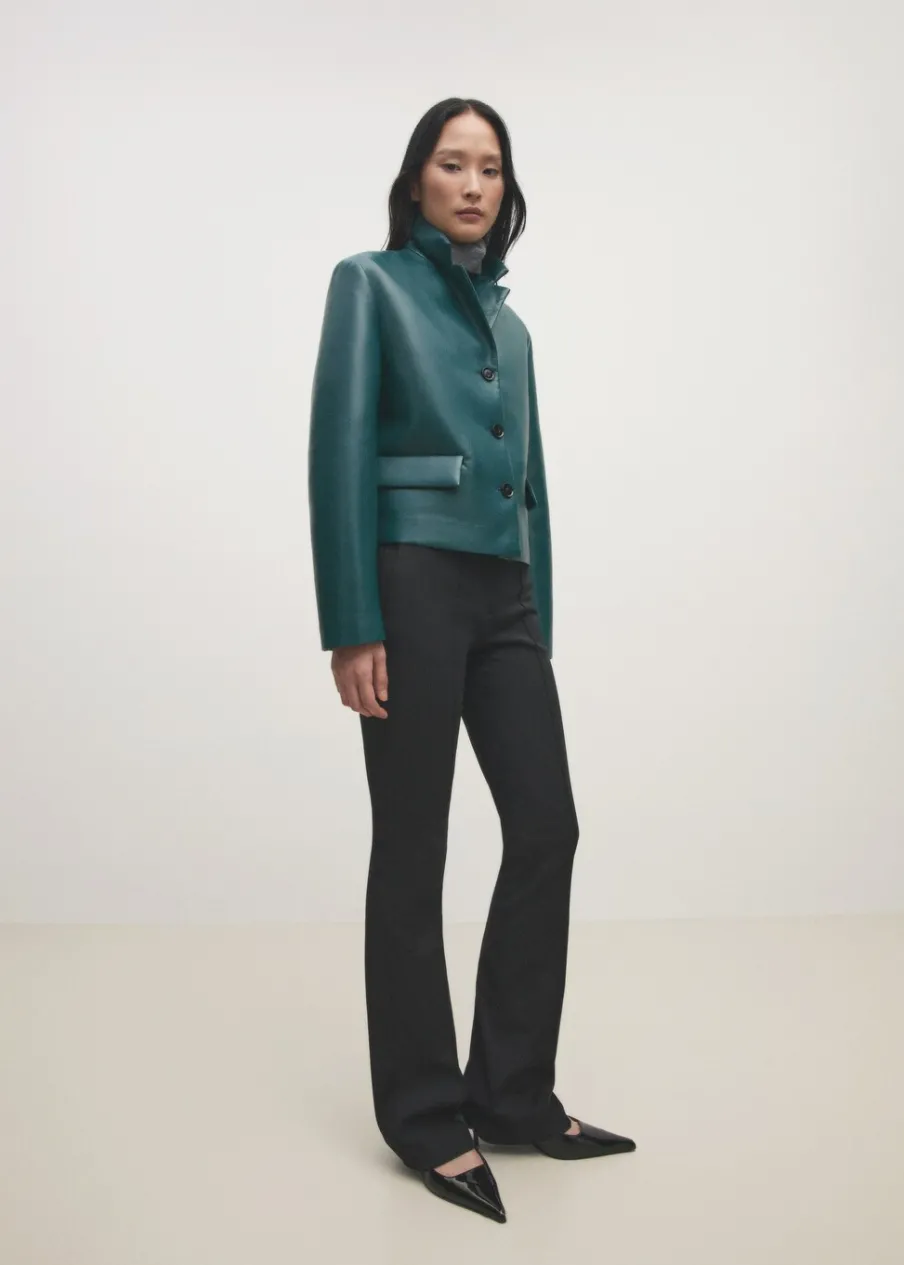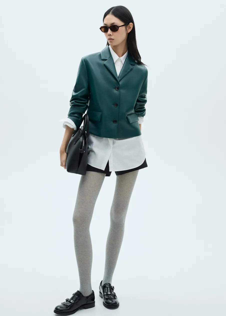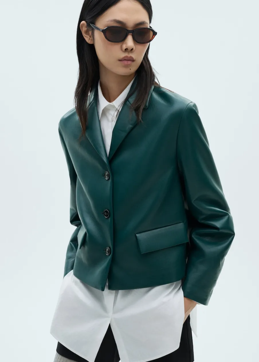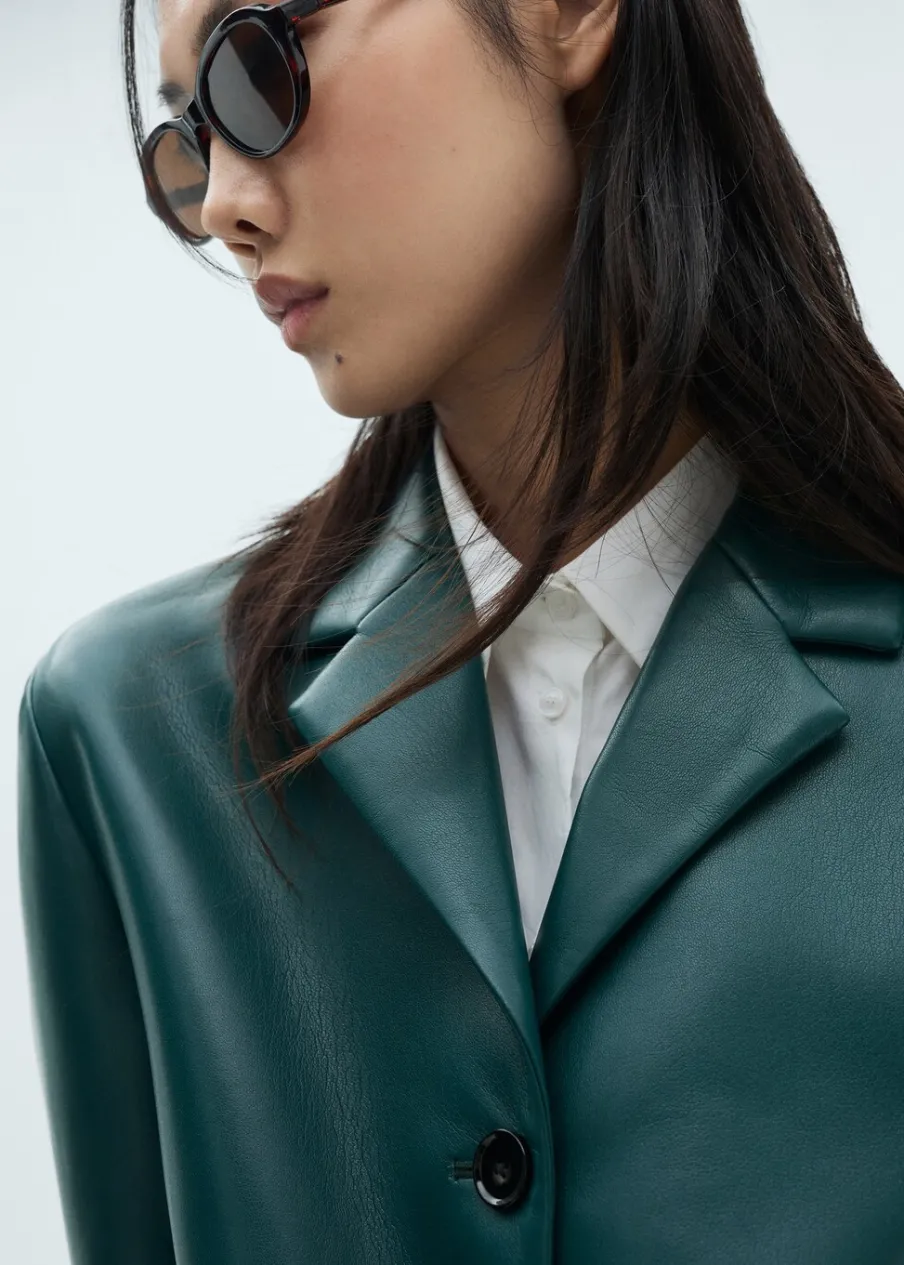 Efekt skóry. Ciężka struktura. Deseń crop. Dekolt w szpic z kołnierzykiem. Długi rękaw. Zapięcie na guziki z przodu. Dwie kieszenie z patkami z przodu. Tylko podszewka. Model prosty.