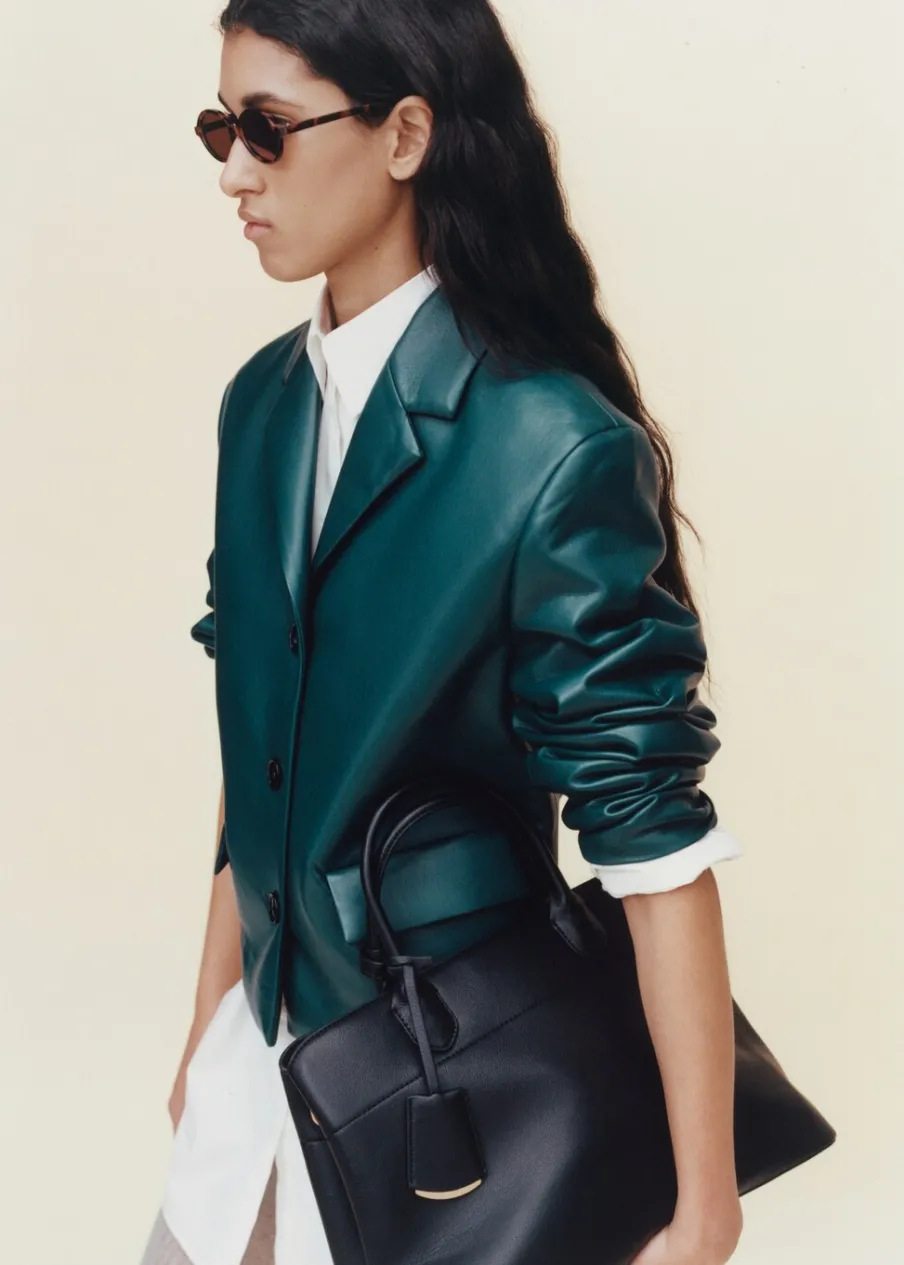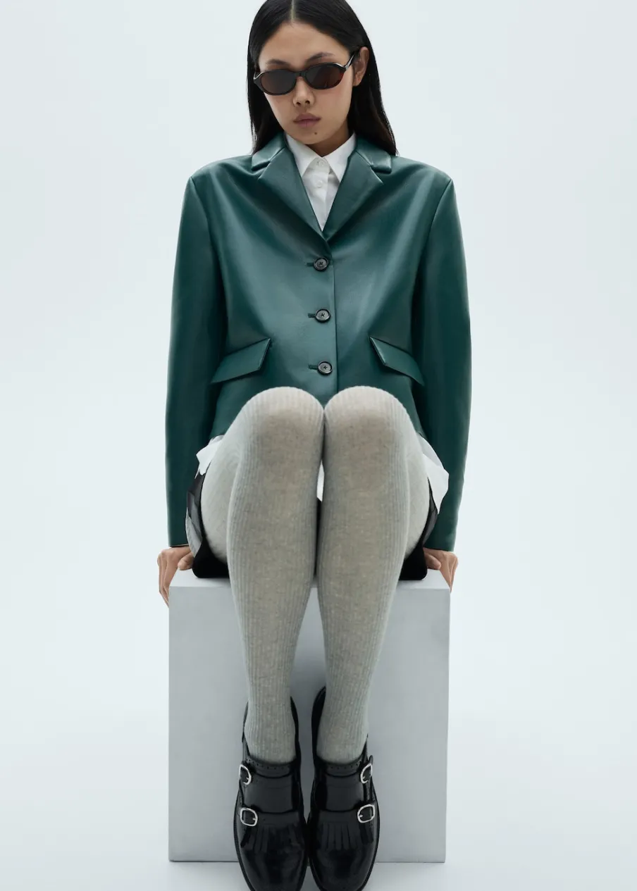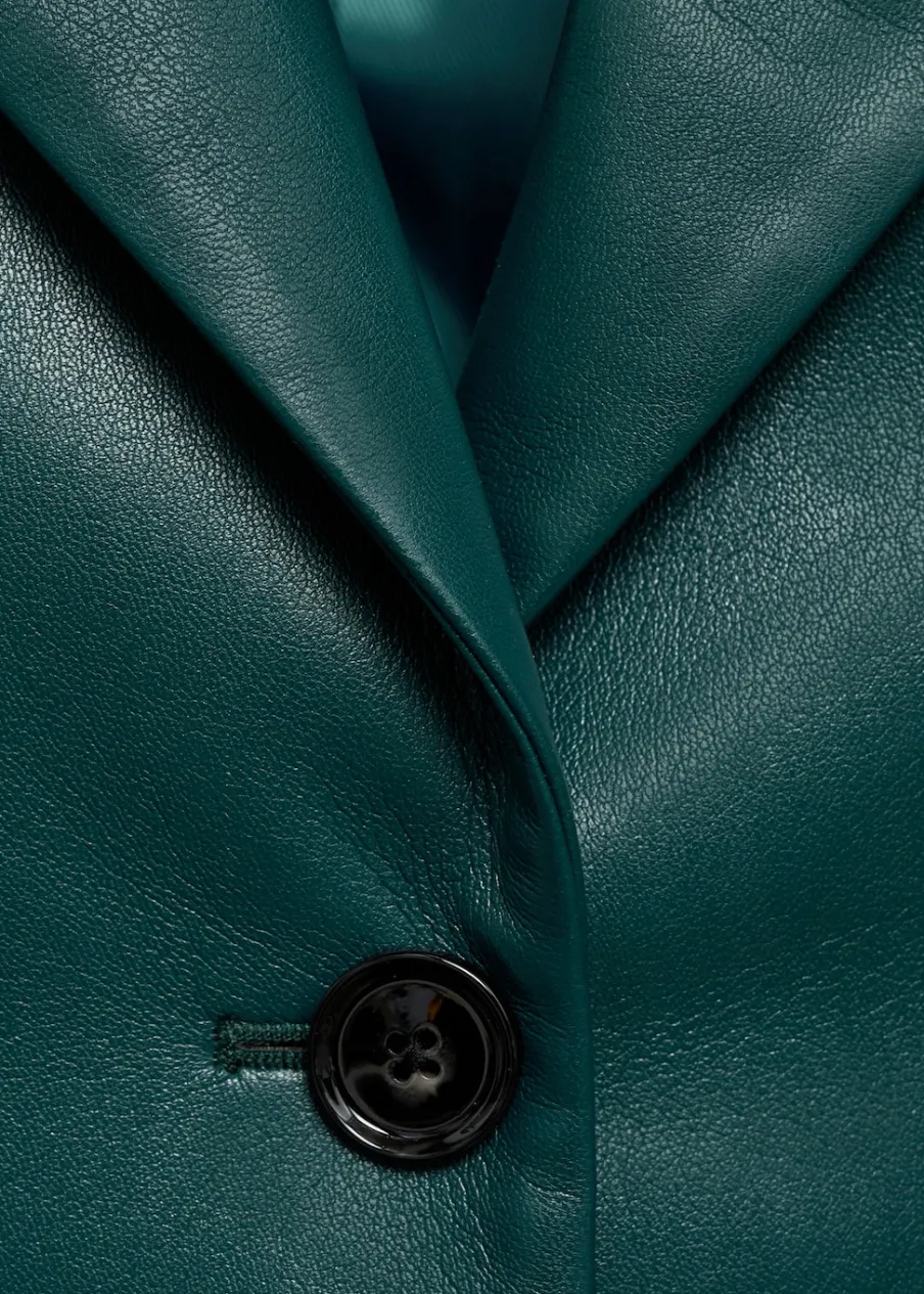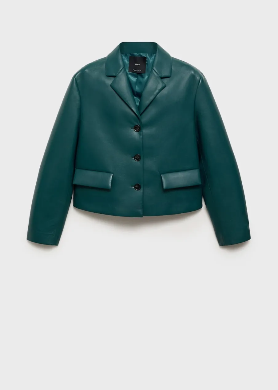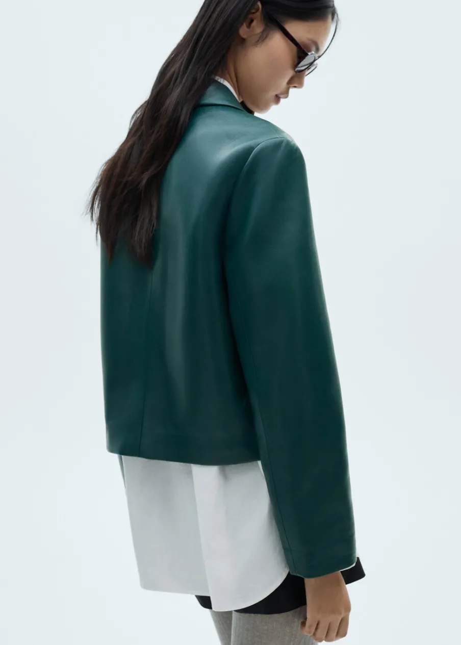 Efekt skóry. Ciężka struktura. Deseń crop. Dekolt w szpic z kołnierzykiem. Długi rękaw. Zapięcie na guziki z przodu. Dwie kieszenie z patkami z przodu. Tylko podszewka. Model prosty.