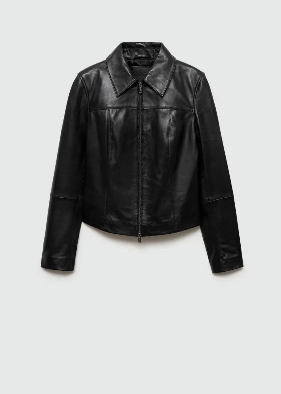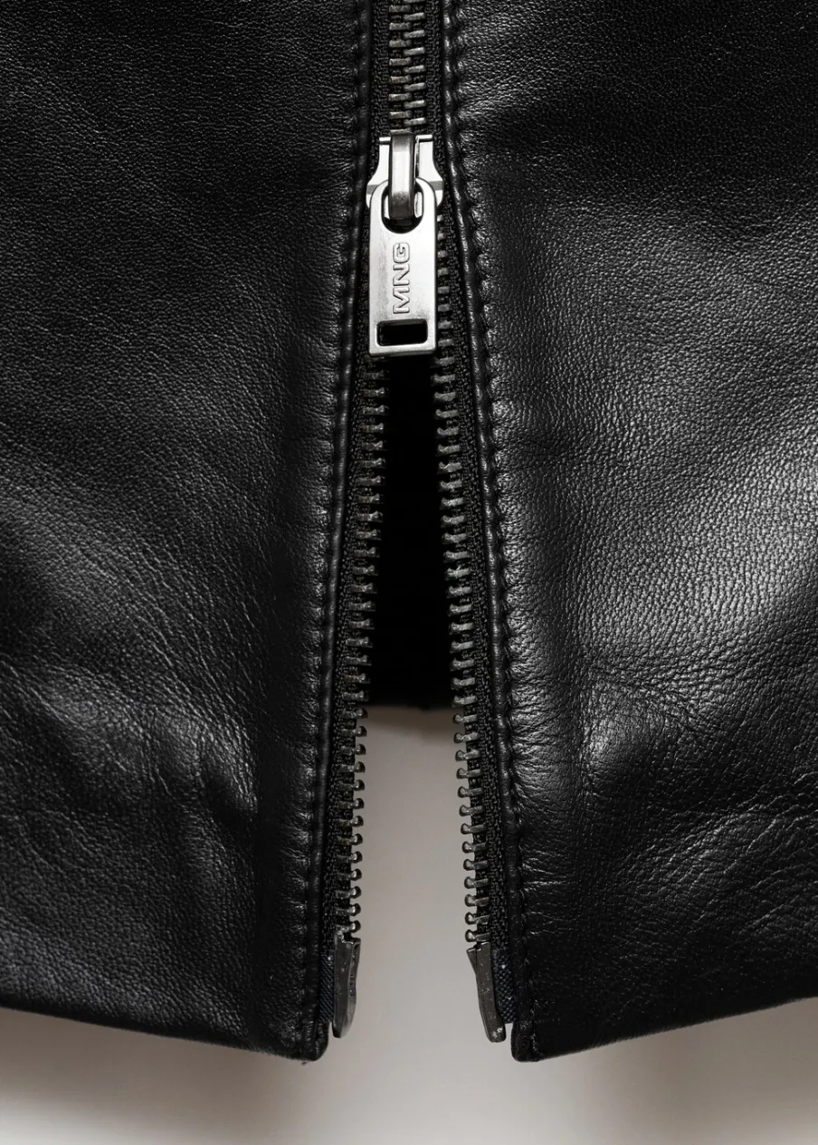 Skóra owcza 100%. Model prosty. Koszulowy kołnierz. Długi rękaw. Zapięcie na podwójny suwak. Wewnętrzna podszewka.