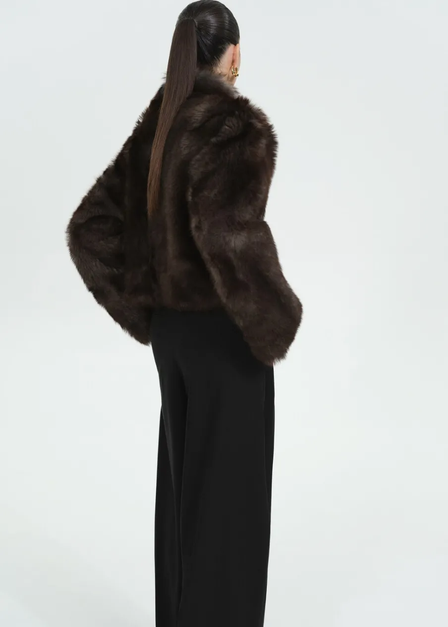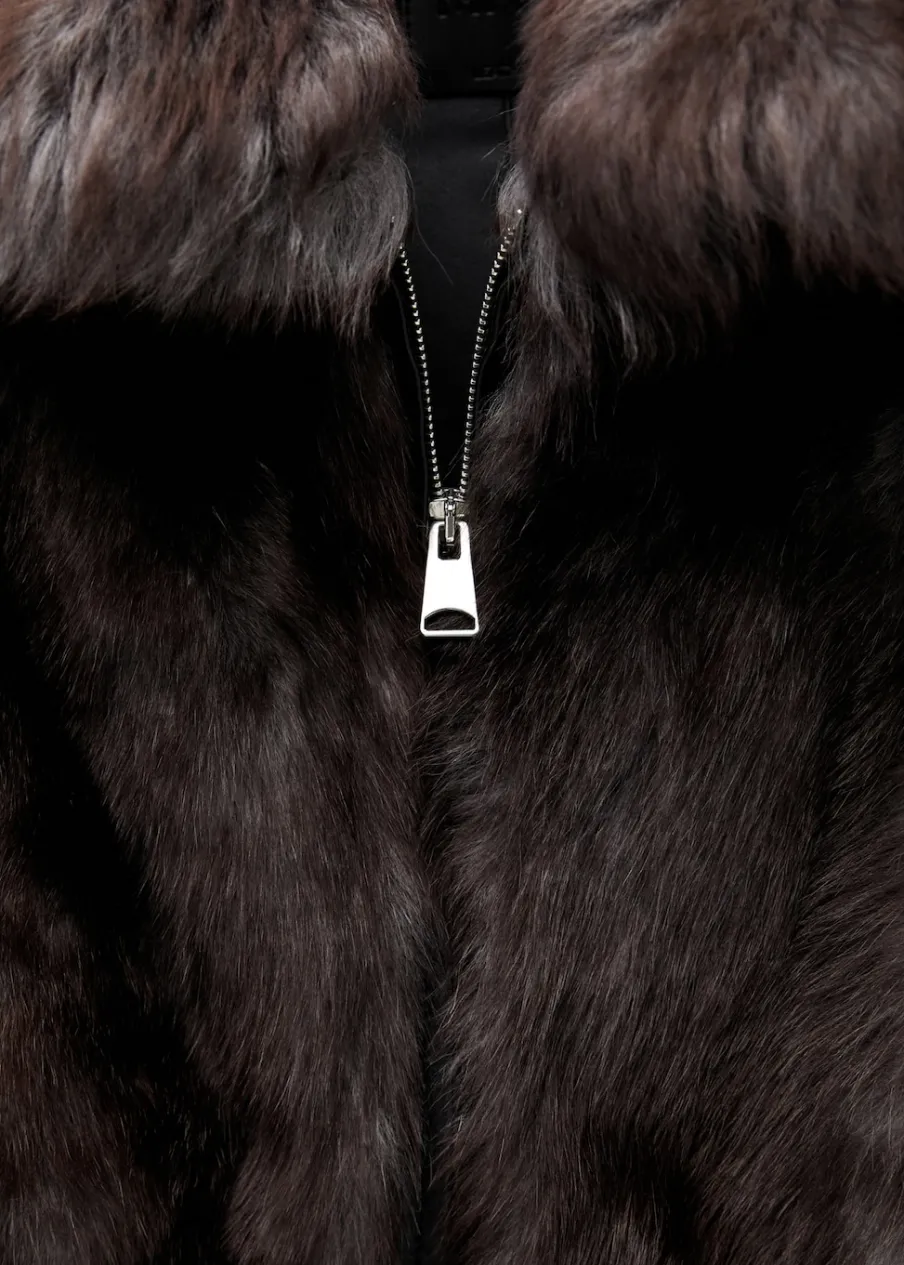 Skóra owcza 100%. Futro. Ciężka struktura. Model dwustronny. Model prosty. Krótki krój. Koszulowy kołnierz. Długi rękaw. Zapięcie z przodu na suwak. Dwie kieszenie boczne. Modelka ma 177 cm wzrostu i nosi rozmiar S/36. Kolekcja wizytowa. Kolekcja Selection.