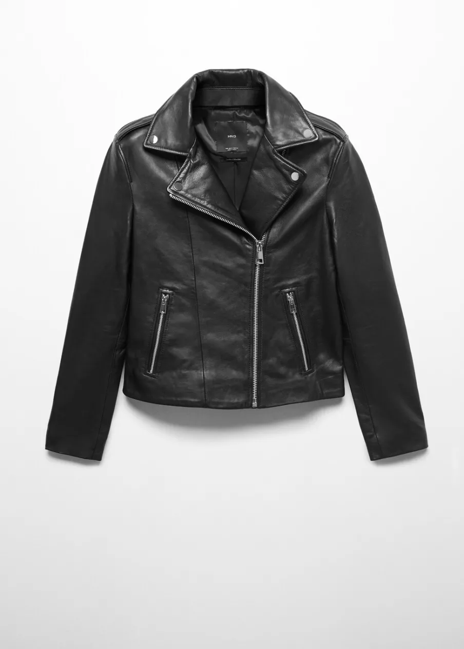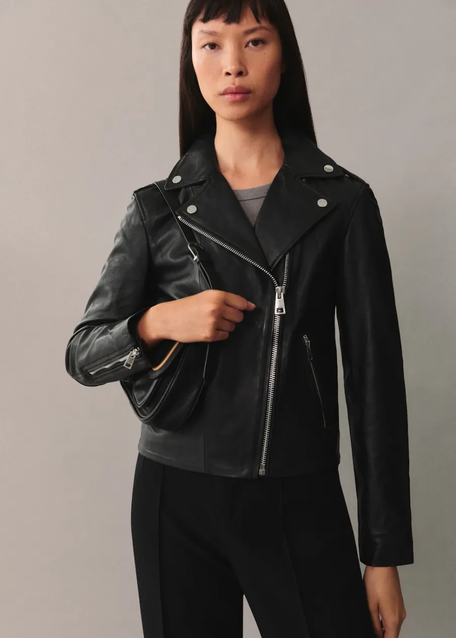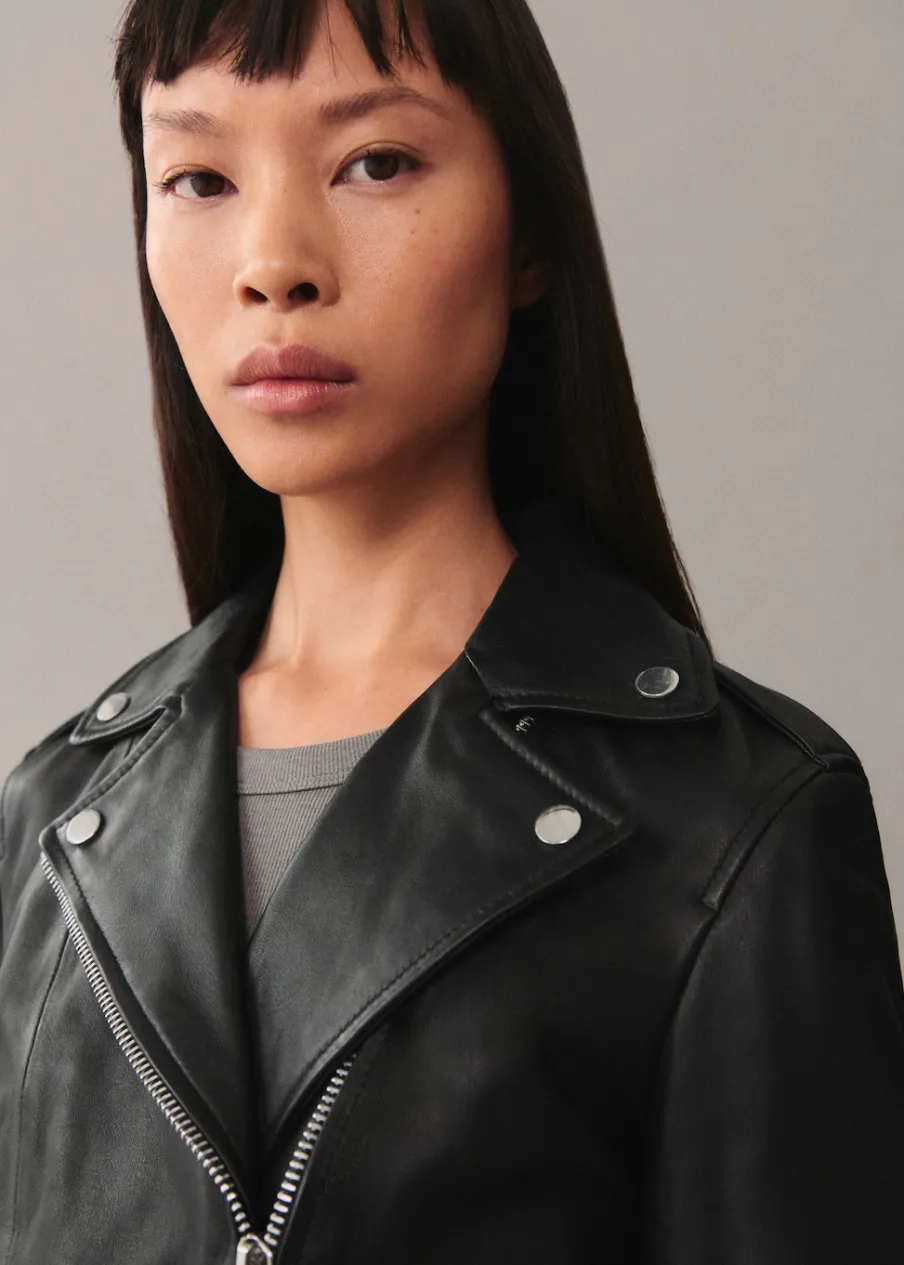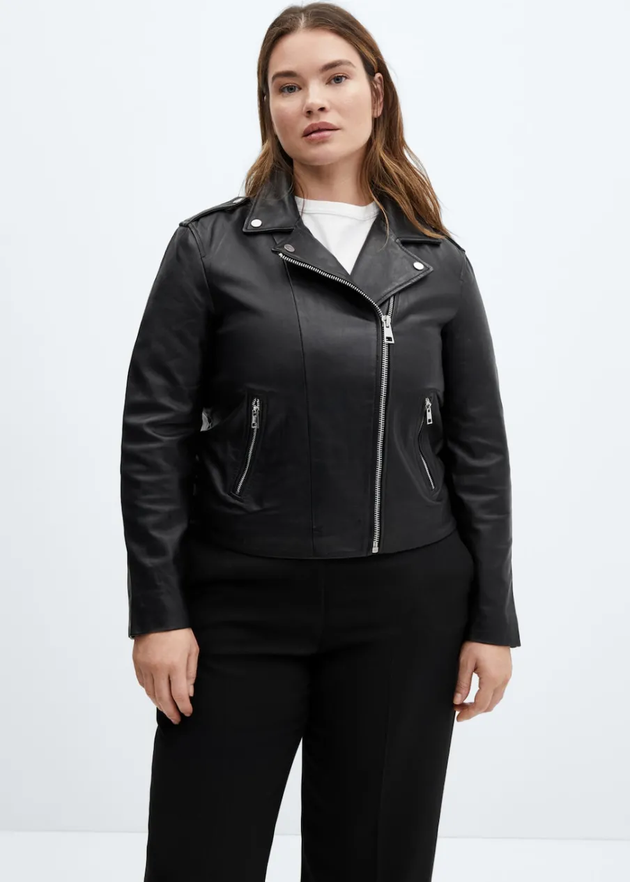 Skóra owcza 100%. 100% skóra nappa. Model prosty. Model biker. Slim-fit. Dekolt w szpic z kołnierzykiem. Koszulowy kołnierz. Długi rękaw z suwakiem. Dwie kieszenie na zamek z boku. Zapięcie na zamek z przodu. Wewnętrzna podszewka. Dostępne w Plus Size. Modelka ma 177 cm wzrostu i nosi rozmiar S/36.