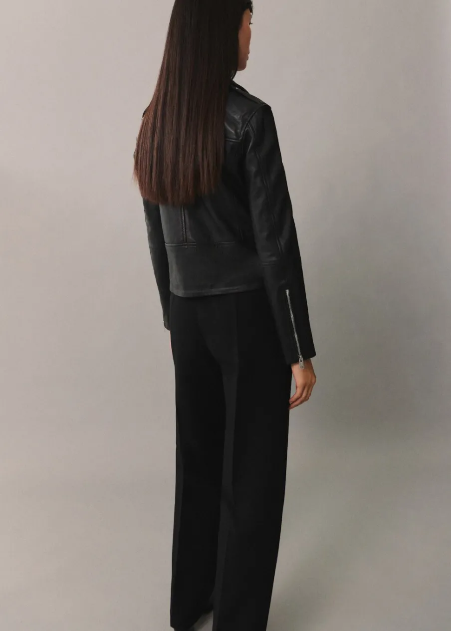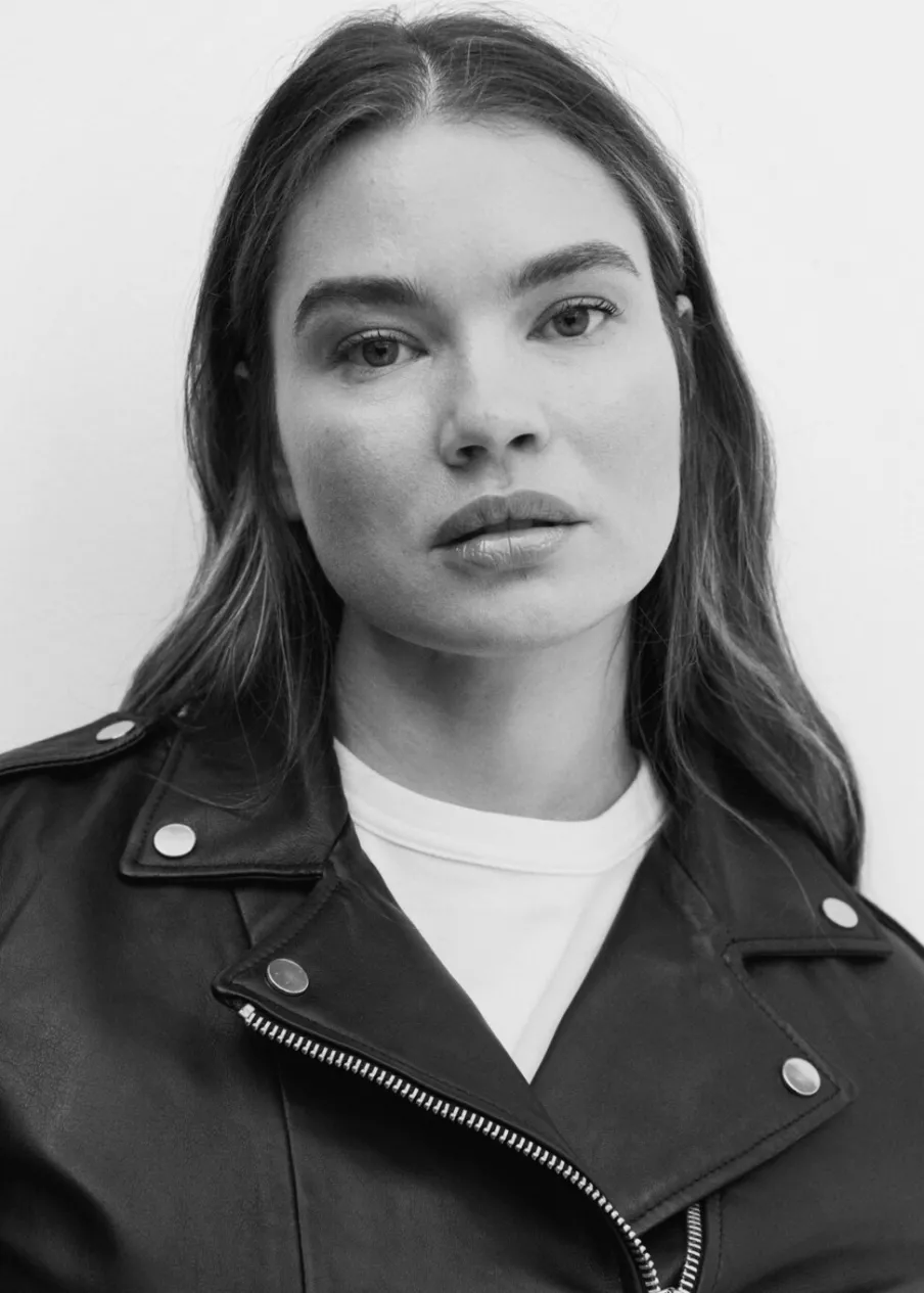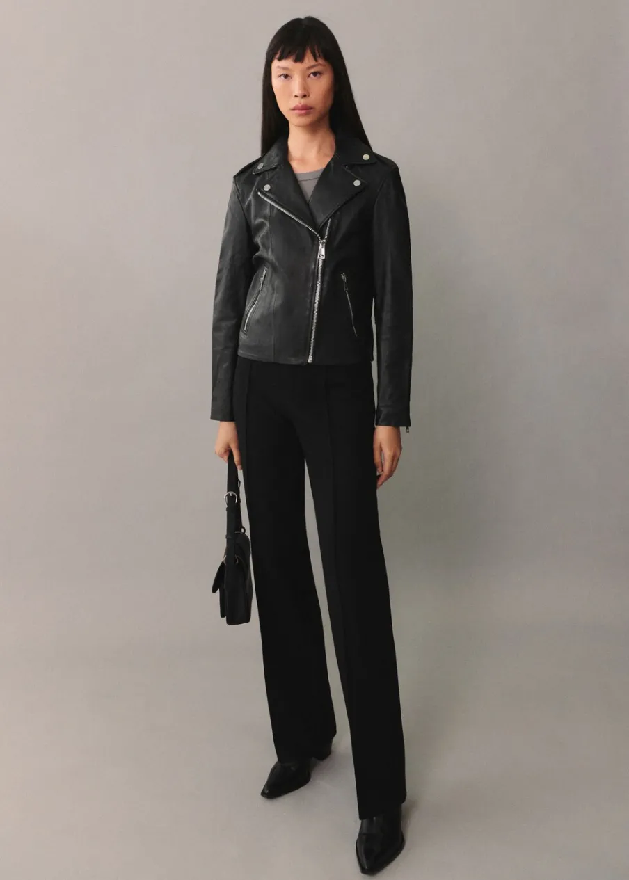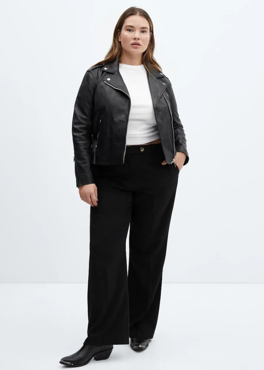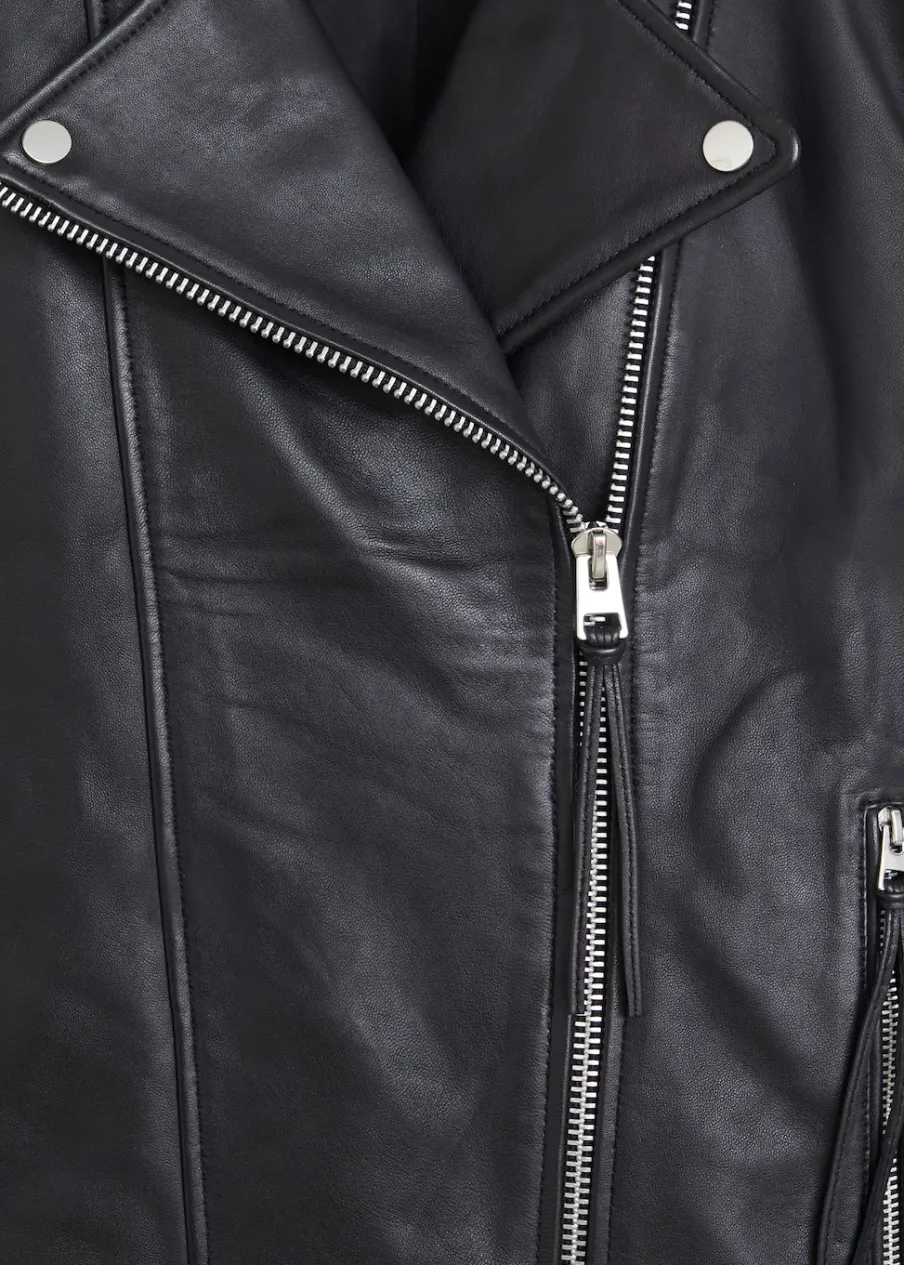 Skóra owcza 100%. 100% skóra nappa. Model prosty. Model biker. Slim-fit. Dekolt w szpic z kołnierzykiem. Koszulowy kołnierz. Długi rękaw z suwakiem. Dwie kieszenie na zamek z boku. Zapięcie na zamek z przodu. Wewnętrzna podszewka. Dostępne w Plus Size. Modelka ma 177 cm wzrostu i nosi rozmiar S/36.