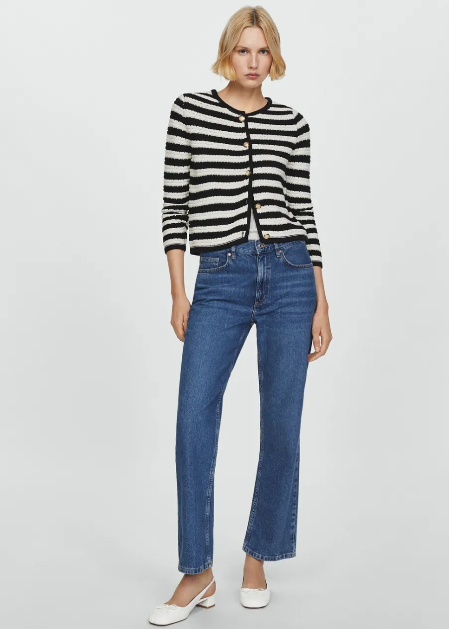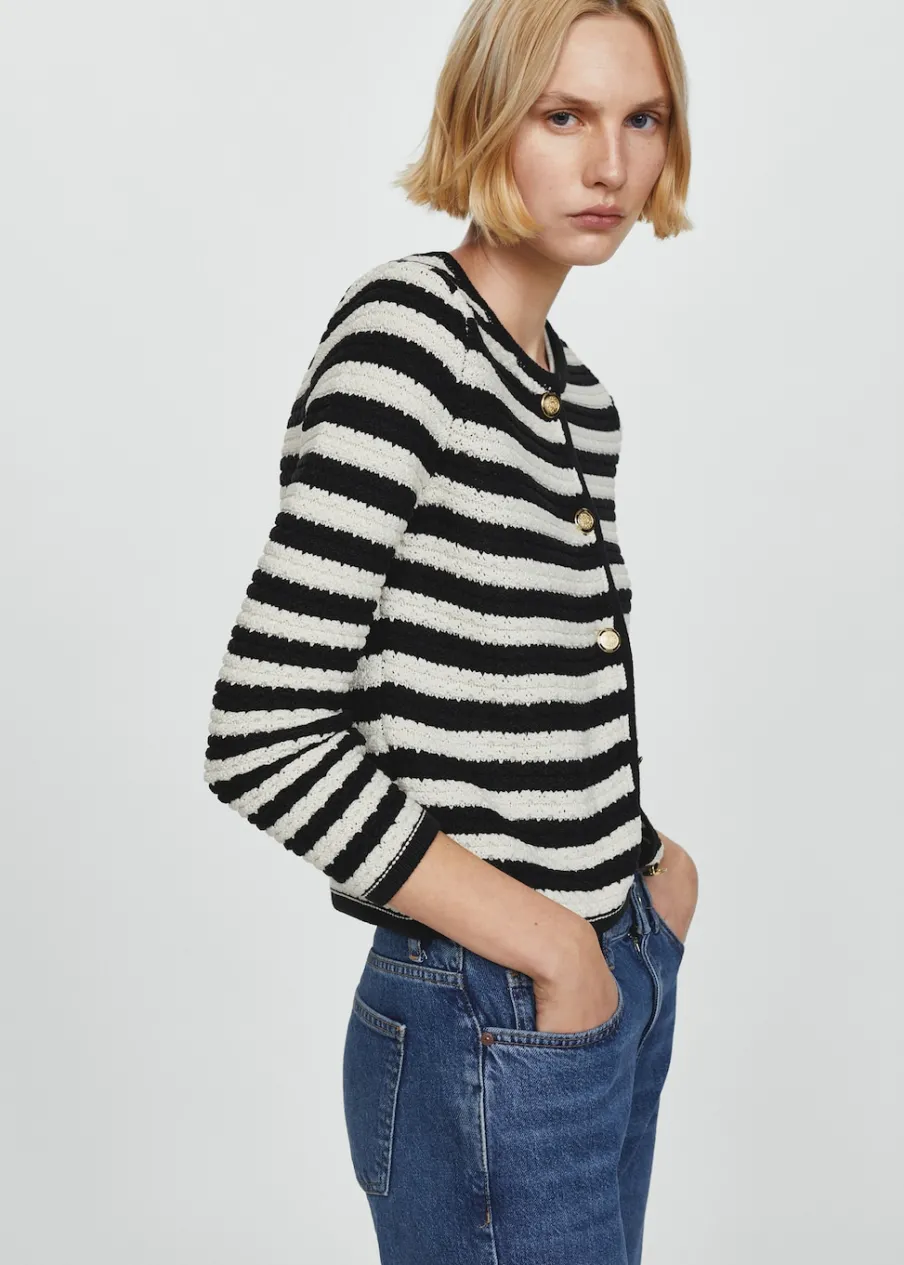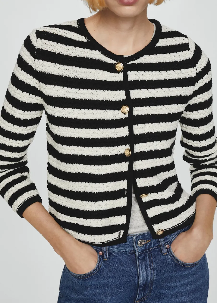 Dzianinowa tkanina. Model prosty. Okrągły dekolt. Długi rękaw. Zapięcie z przodu na guziki. Biżuteryjne guziki. Stylizacje biurowe. Wzór w paski.